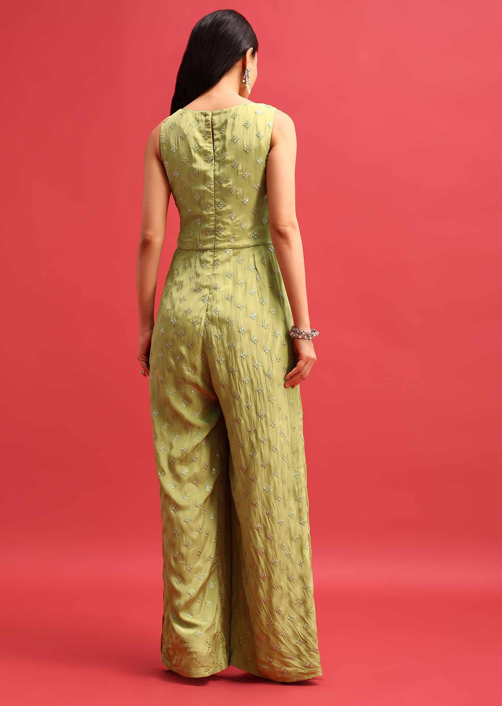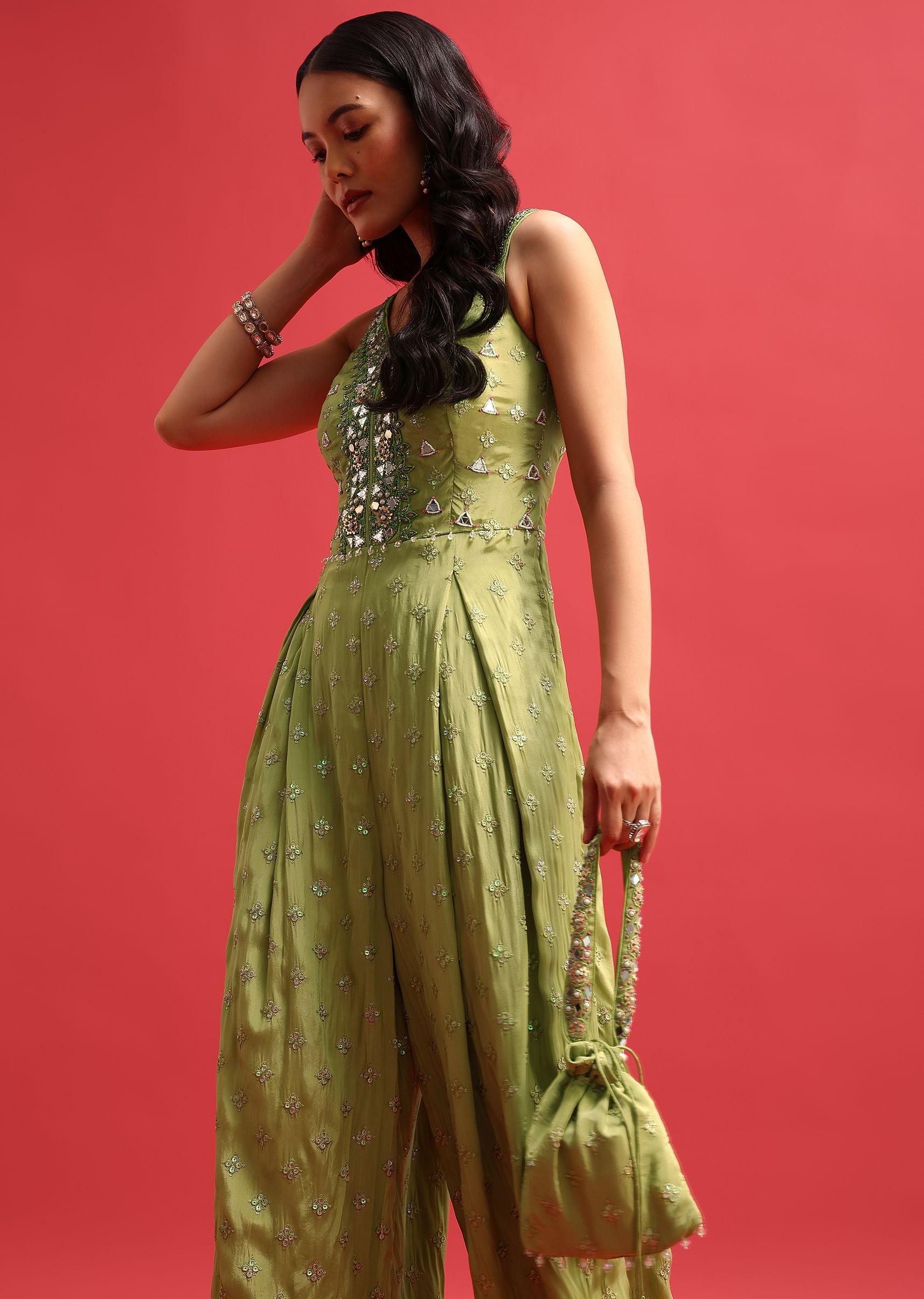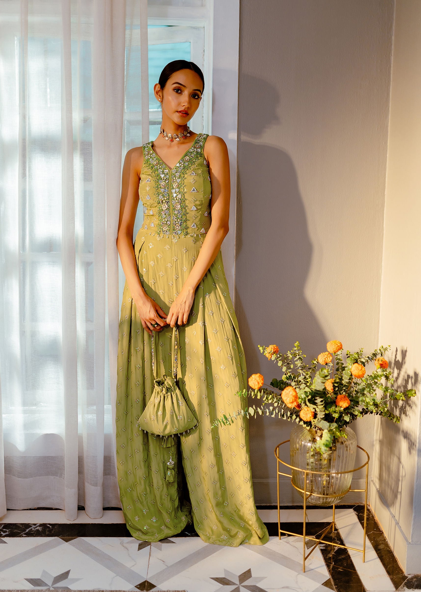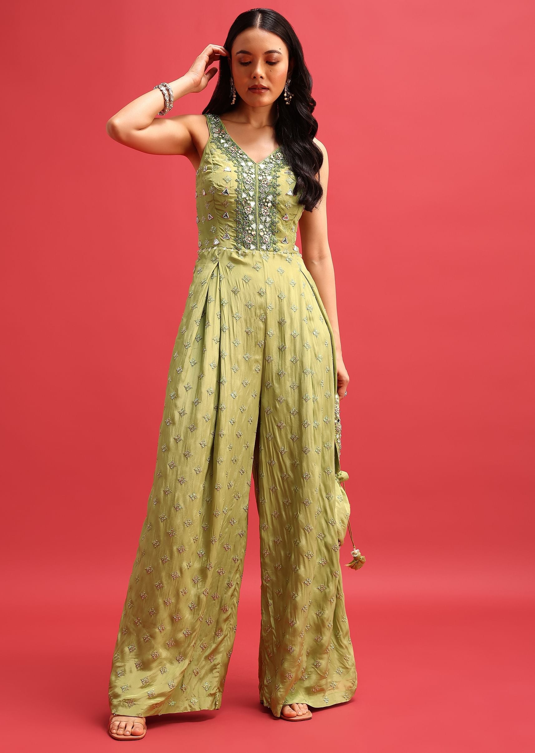 Emerald elegance takes flight! This embroidered jumpsuit stuns in shades of green, paired with a playful potli bag for the perfect party or mehendi look. Dance the night away in style and comfort, ready to embrace the festive vibes. Awarded as the Most Trusted Brand, we're delivering styles you love, just as promised.