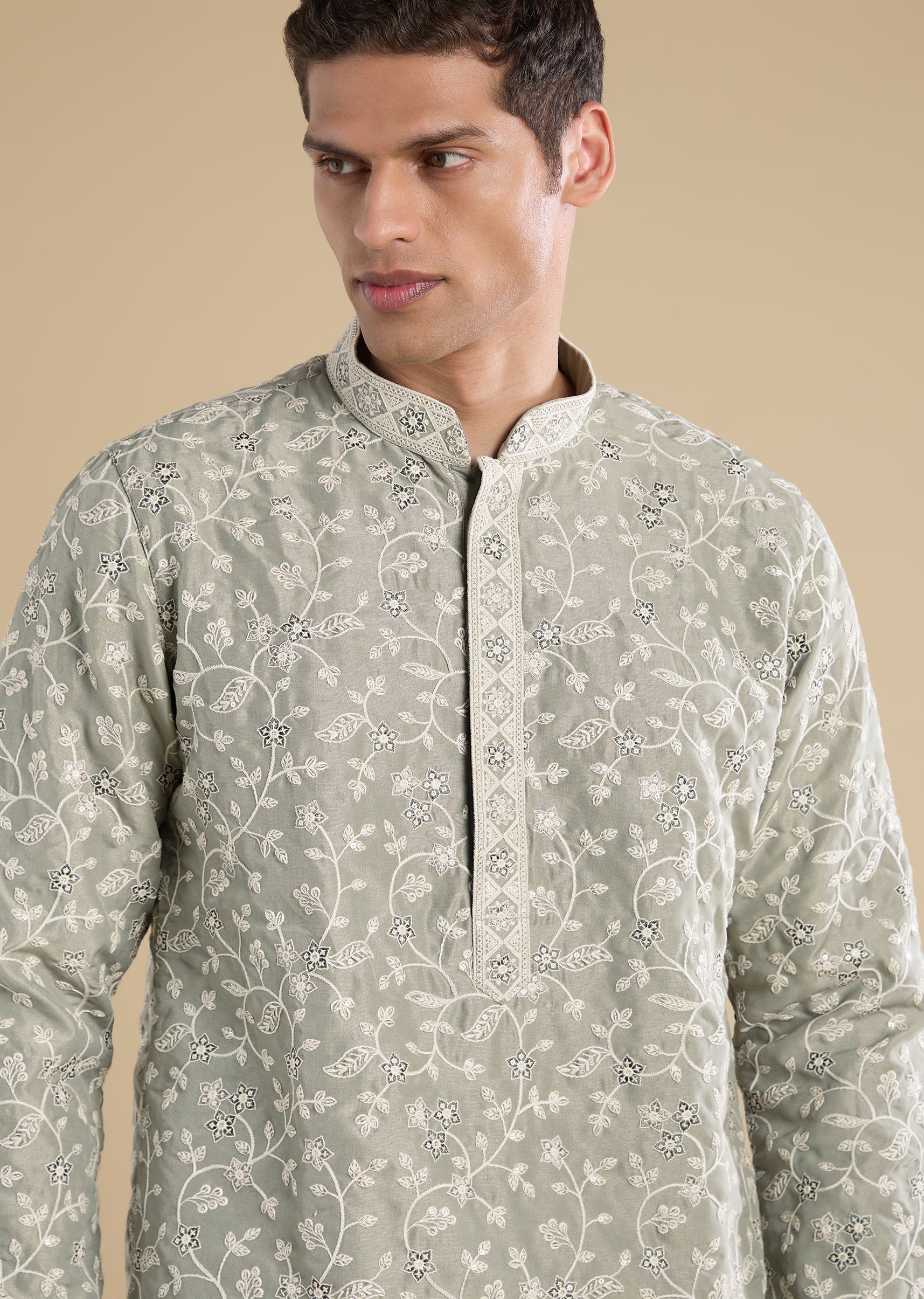 Fresh and effortless in appeal, this green kurta set features subtle thread, sequin, and motif detailing for a refined casual look. Designed with a mandarin collar, full sleeves, and side... More Product Details
