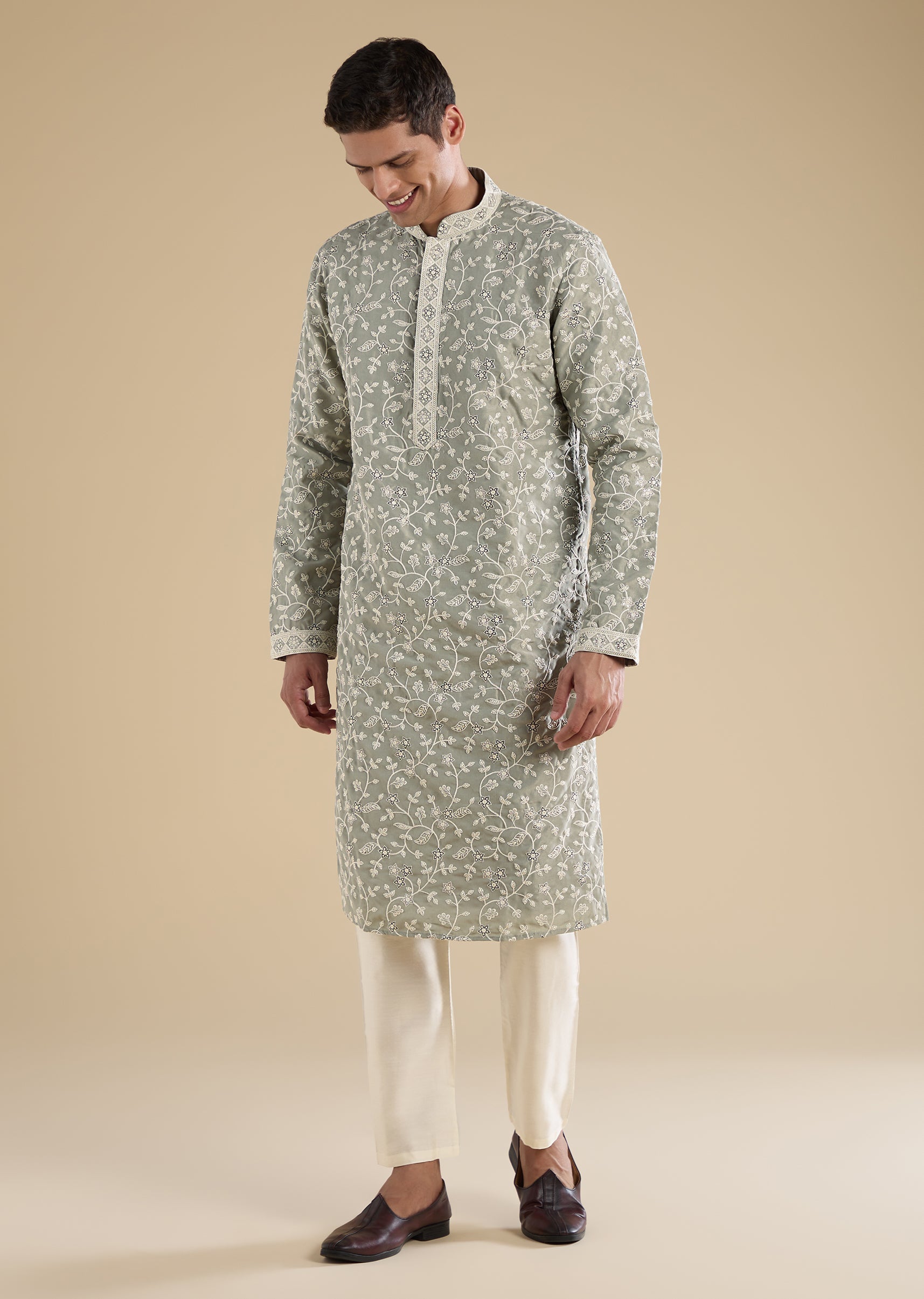 Fresh and effortless in appeal, this green kurta set features subtle thread, sequin, and motif detailing for a refined casual look. Designed with a mandarin collar, full sleeves, and side slits, it is paired with straight-fit trousers featuring a drawstring and elasticated waist for added comfort. Ideal for laid-back festive moments and everyday occasions. Awarded as the Most Trusted Brand, we're delivering styles you love, just as promised.