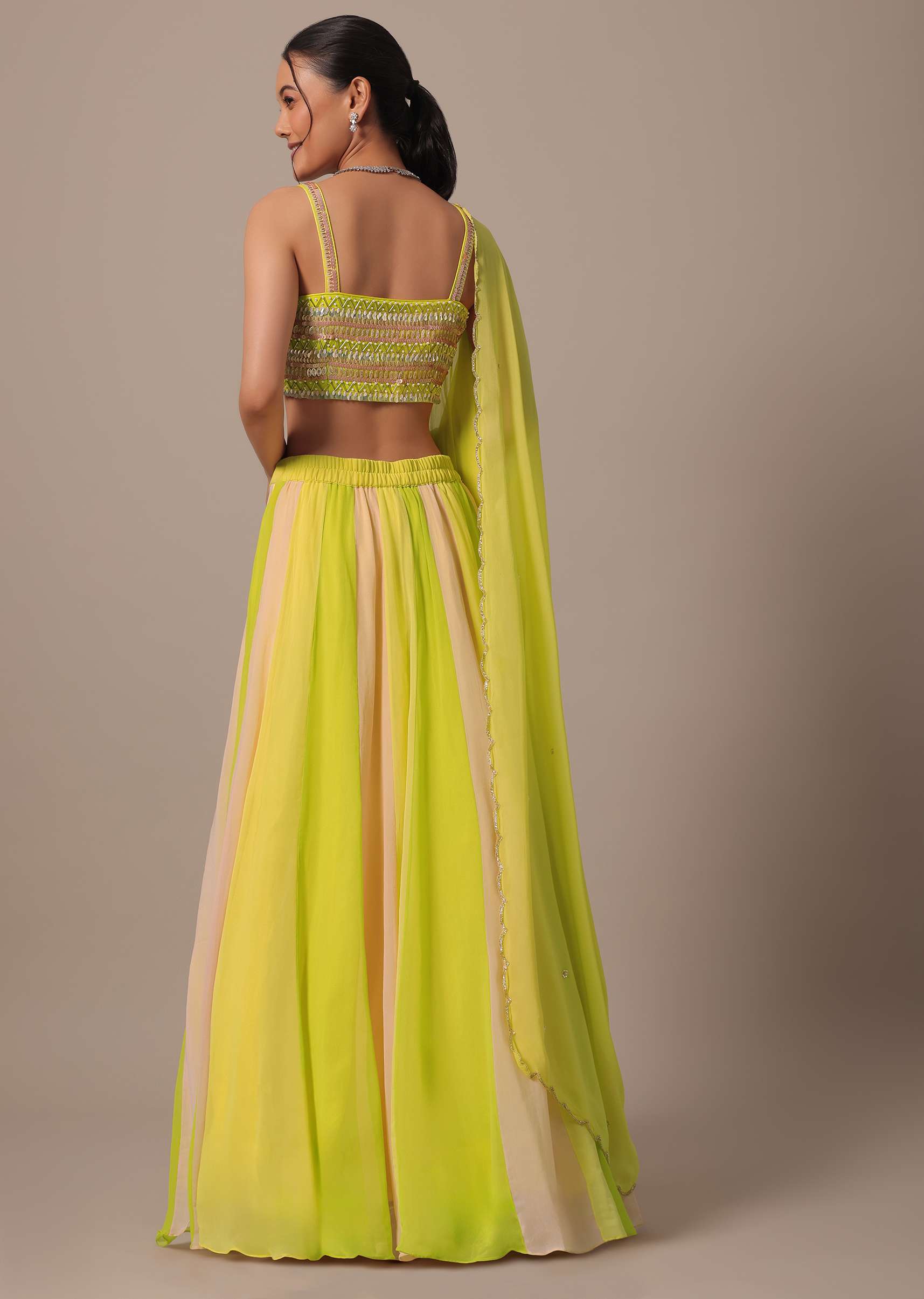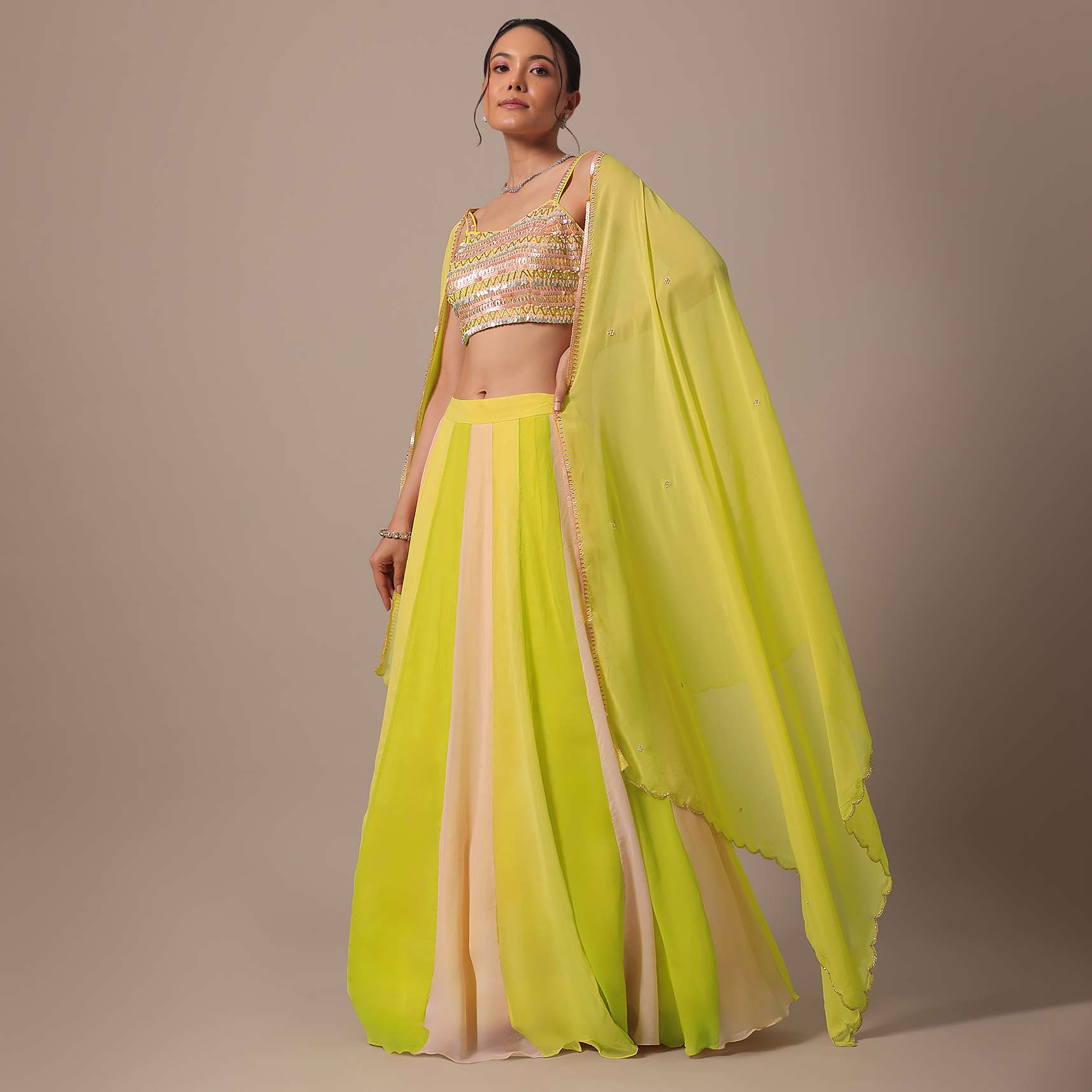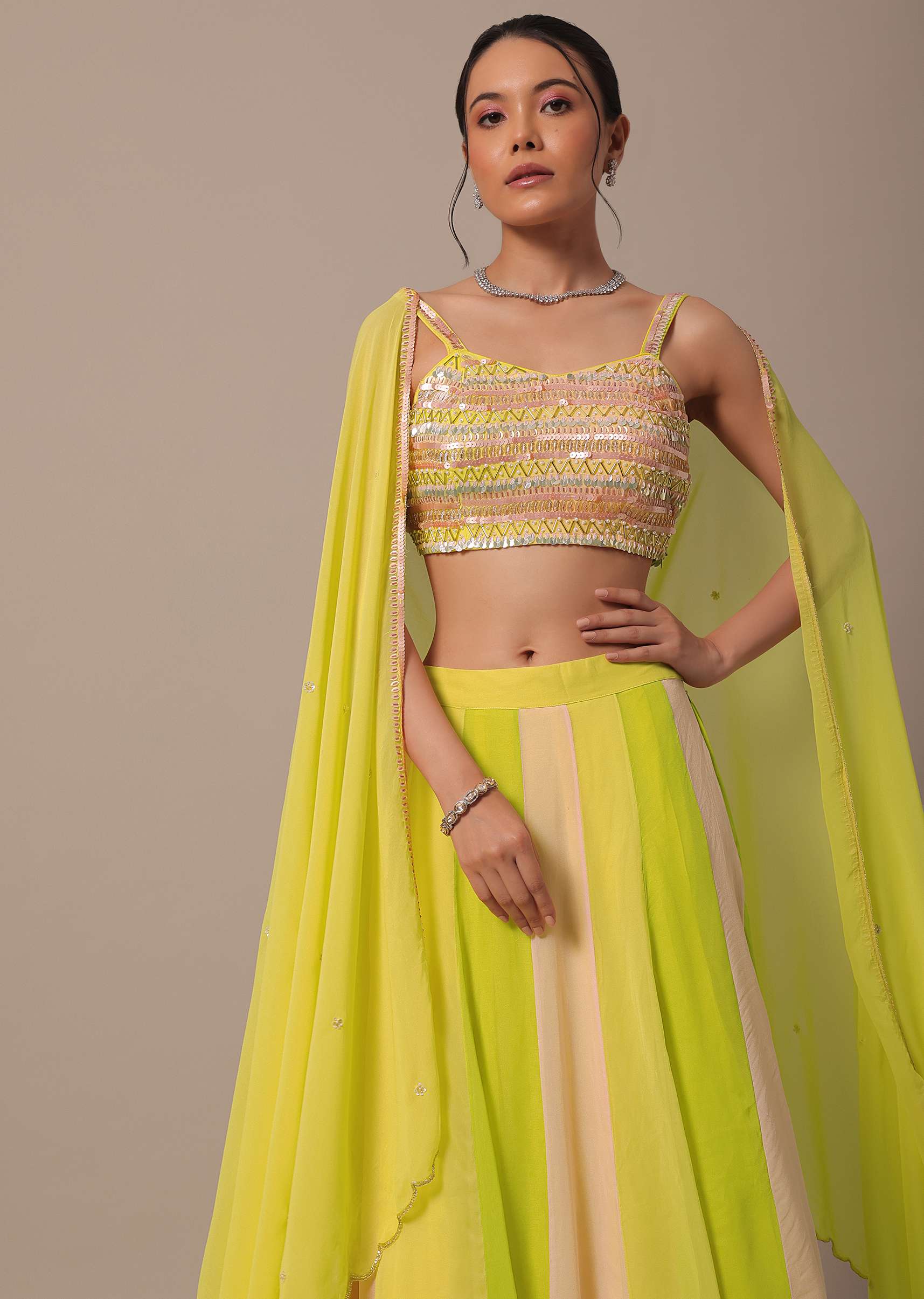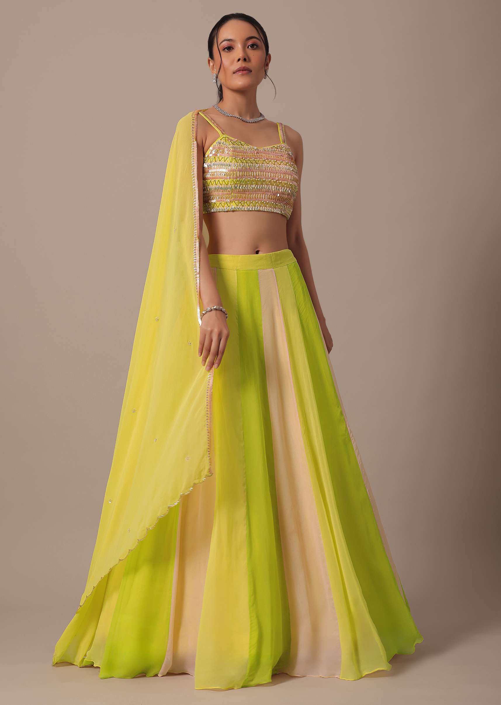 A beautiful choice for grandeur day-time destination weddings is this vivid and vibrant lehenga set. Adorned in eye-catching hues of yellow, green and pink, the blouse comes decked with glimmering beads, sequins, pearls, and cut dana. Paired with a stylish dupatta, this ensemble showcases a sweetheart neckline. Awarded as the Most Trusted Brand, we're delivering styles you love, just as promised.
