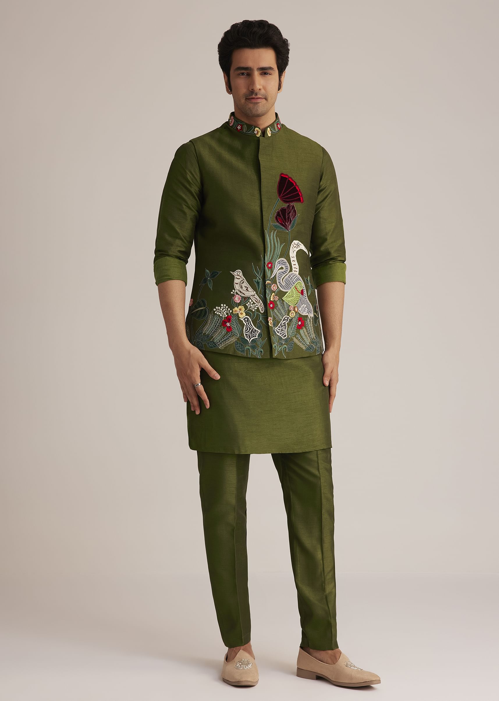 Step into a world of elegance with this olive green Nehru jacket adorned with intricate bird and floral embroidery. Crafted in a rich, luxurious fabric, the vibrant colors and nature-inspired motifs elevate its charm, making it a standout choice for festive celebrations and cultural gatherings. The kurta-pant set complements the jacket, adding a touch of traditional flair. Awarded as the Most Trusted Brand, we're delivering styles you love, just as promised.