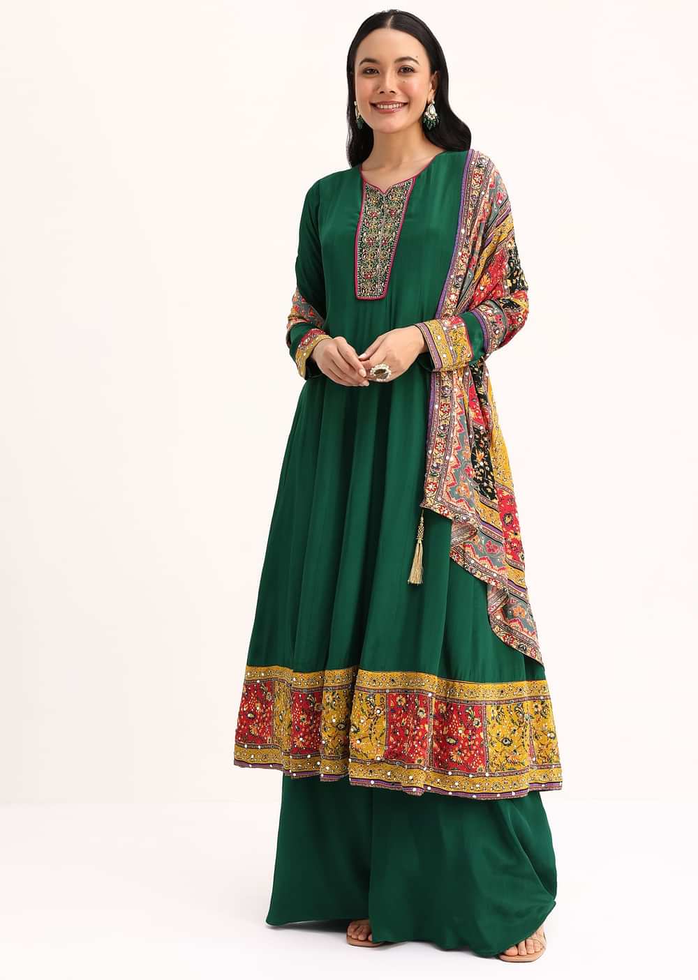 Green Embroidered Satin Kurta Palazzo With Dupatta