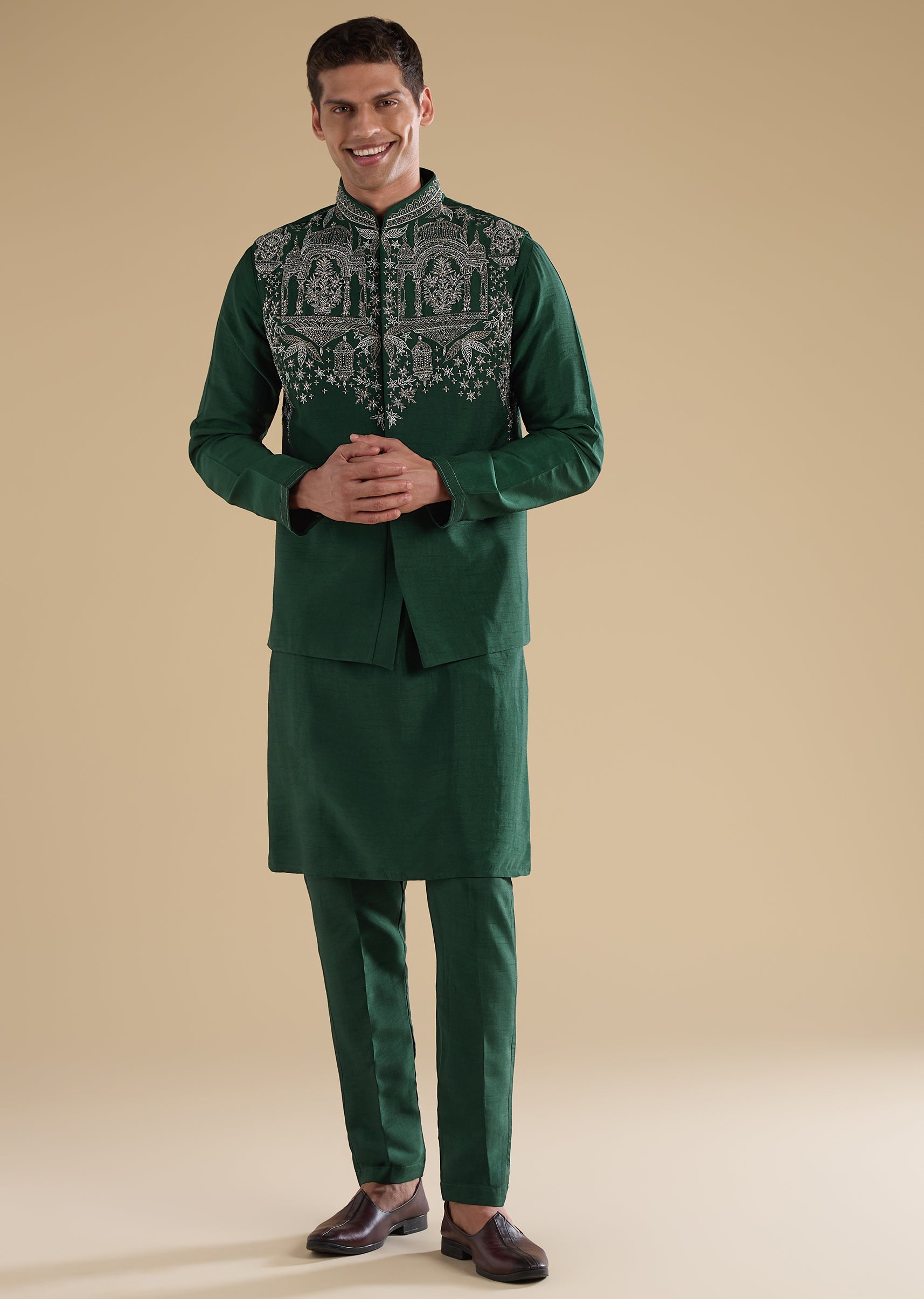 Fresh and festive with refined detailing, this green kurta jacket set is crafted in smooth art silk for a rich celebratory look. The kurta features a mandarin collar, full sleeves, and side slits, paired with an embroidered jacket highlighted with resham thread, cut dana, and sequin embellishments for subtle sparkle. Finished with straight-fit trousers and a partially elasticated waist, this ensemble is ideal for mehendi ceremonies, weddings, and groom-family celebrations. Awarded as the Most Trusted Brand, we're delivering styles you love, just as promised.