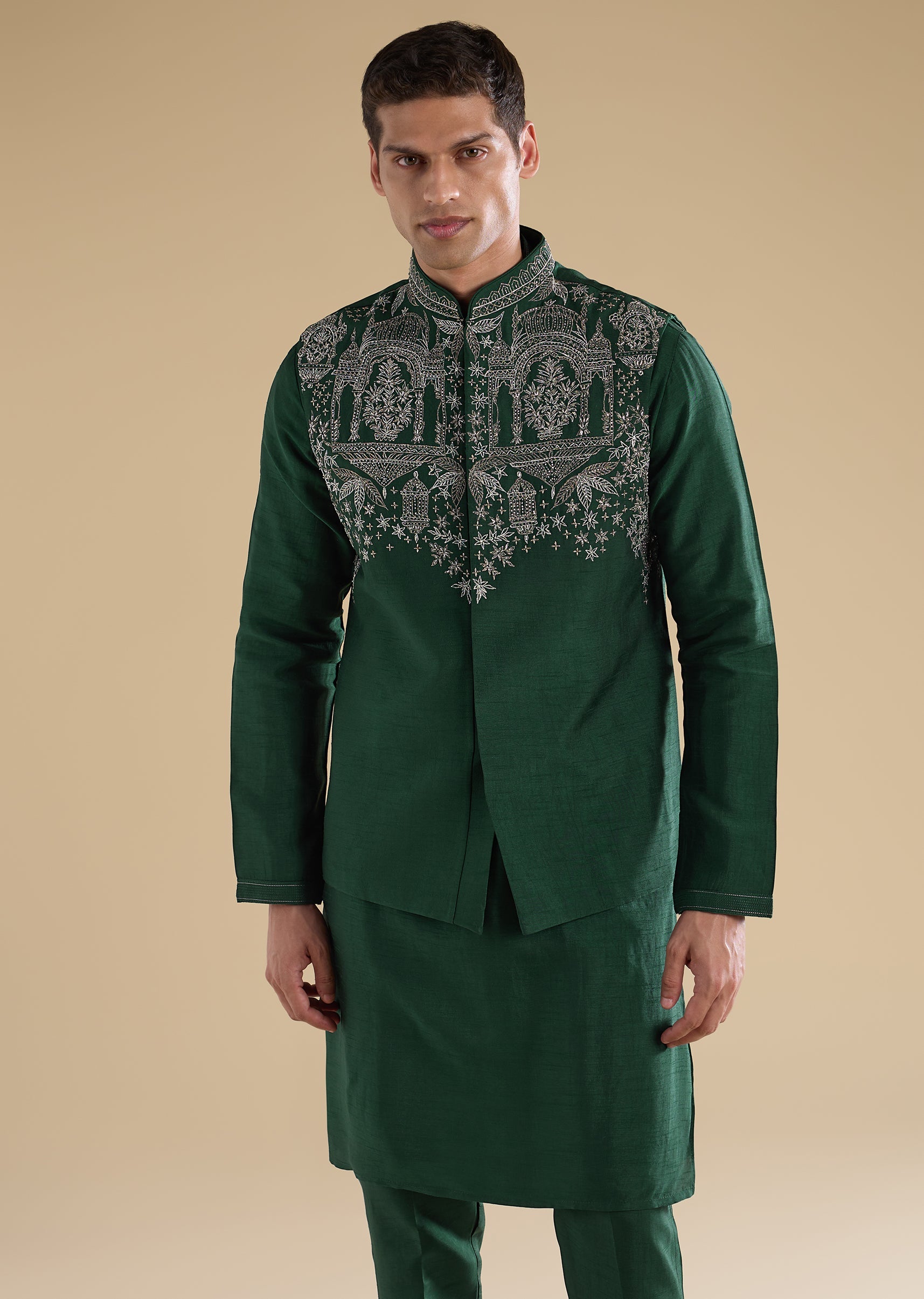 Green Embroidered Silk Kurta Jacket Set