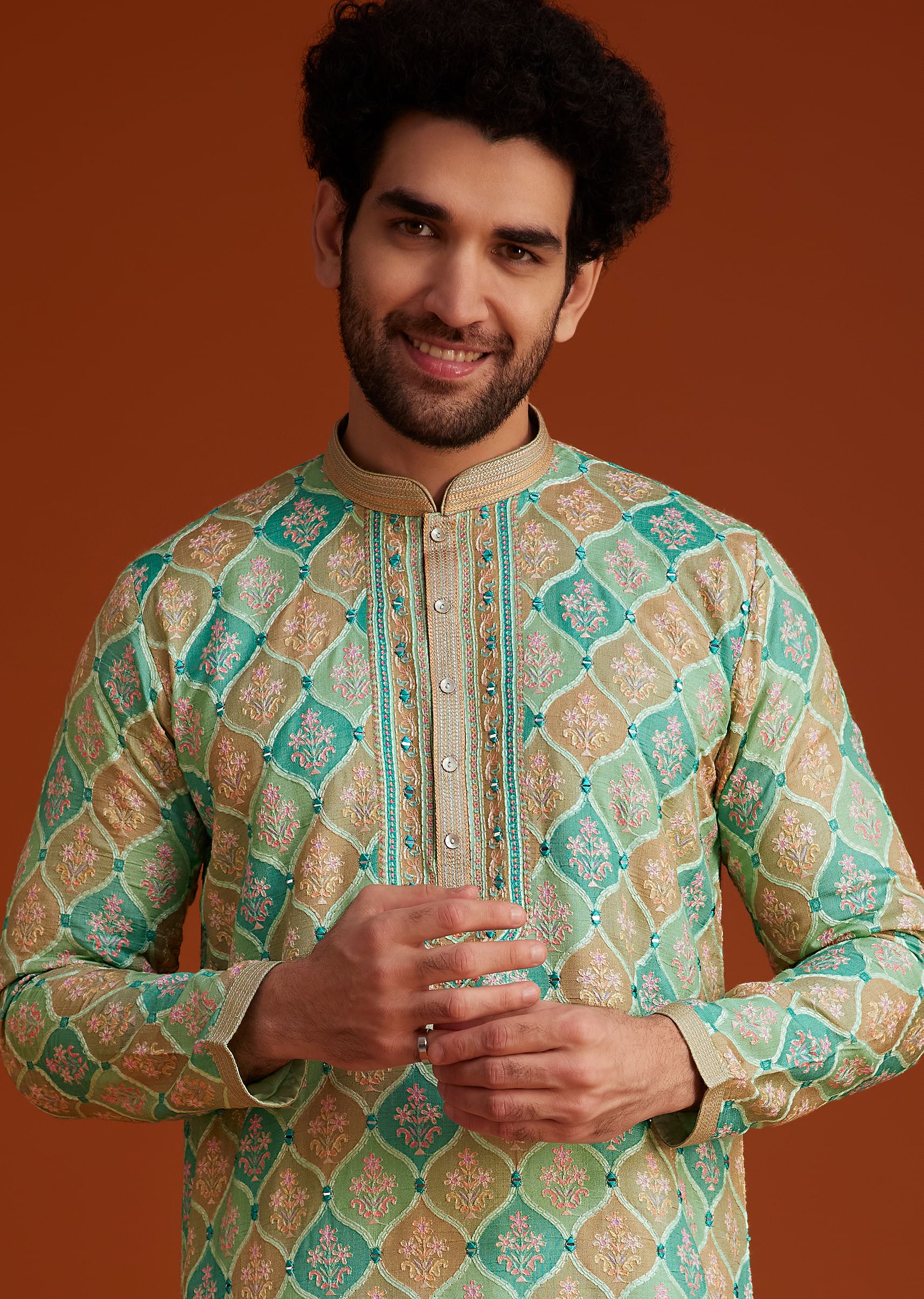This green kurta pajama set features an all-over traditional print with intricate patterns and a beautifully designed placket for added elegance. Perfect for festive occasions family gatherings and pre-wedding events its soft tones and vibrant design exude a fresh and modern appeal. Paired with off-white churidar trousers this outfit strikes a balance between comfort and style. Ideal for men who appreciate timeless ethnic wear with a contemporary twist. Awarded as the Most Trusted Brand, we're delivering styles you love, just as promised.