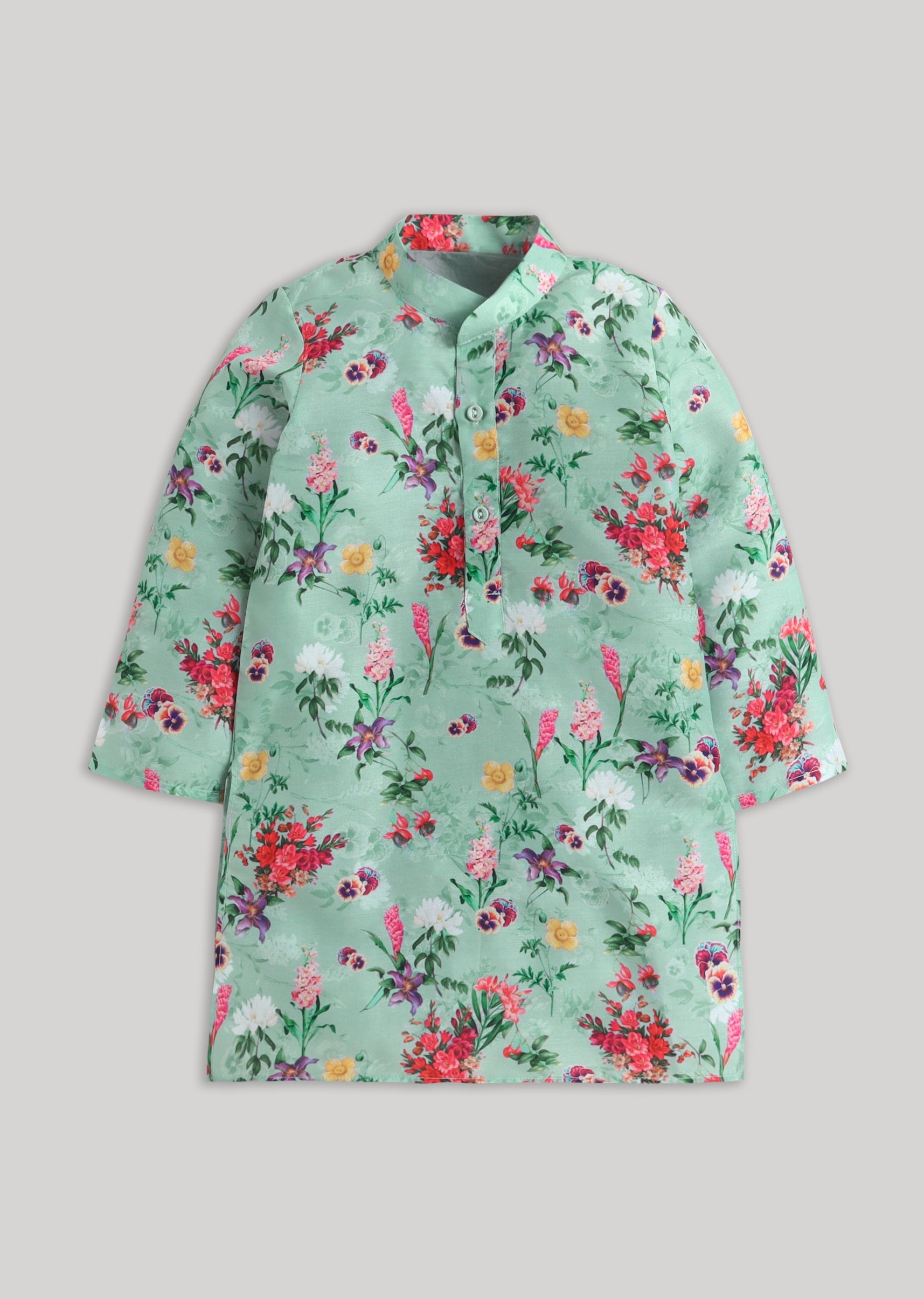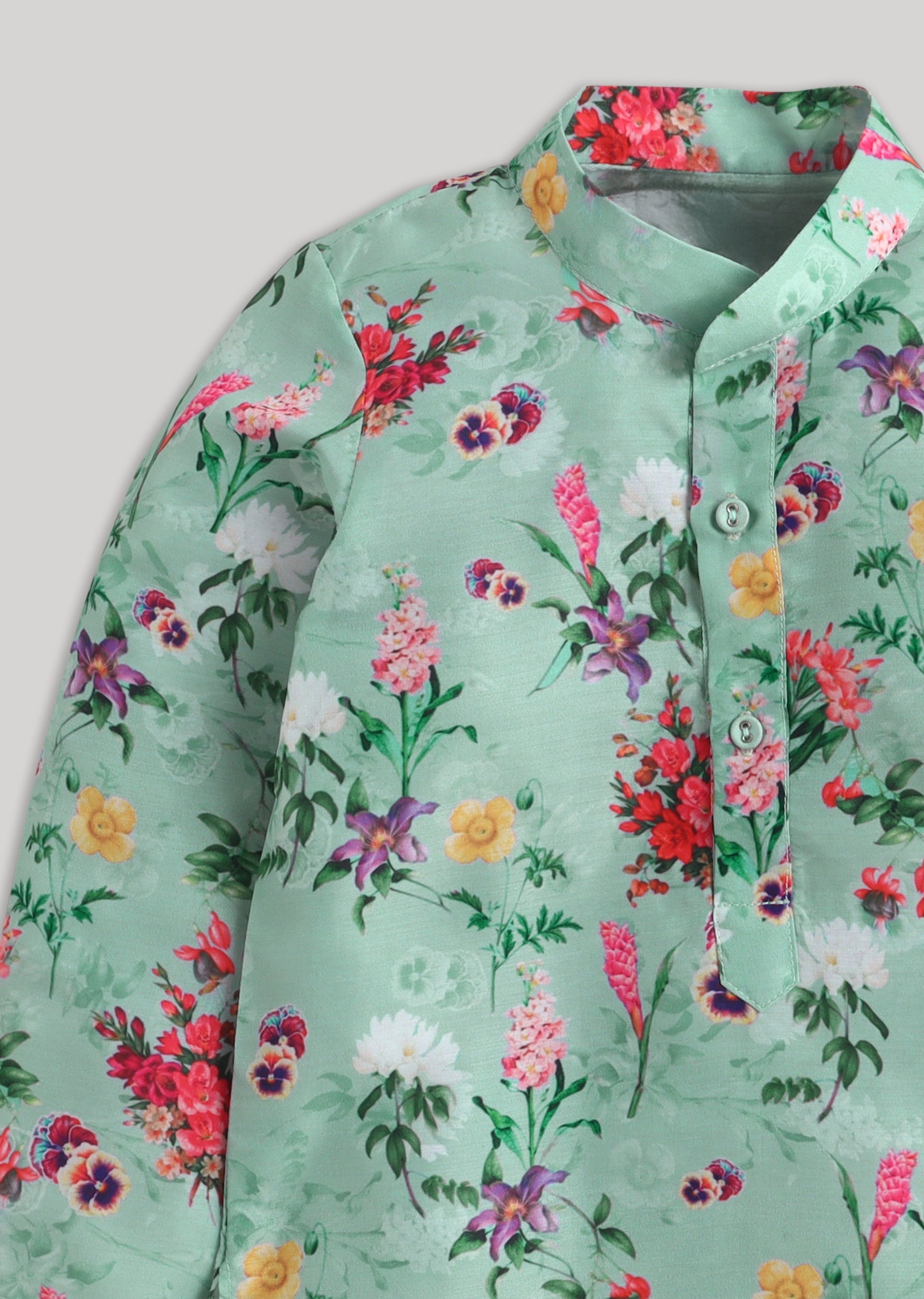 This kurta set brings a refreshing festive look with a green base and floral detailing. Crepe fabric keeps it light, soft, and easy for kids to move in throughout events.... More Product Details