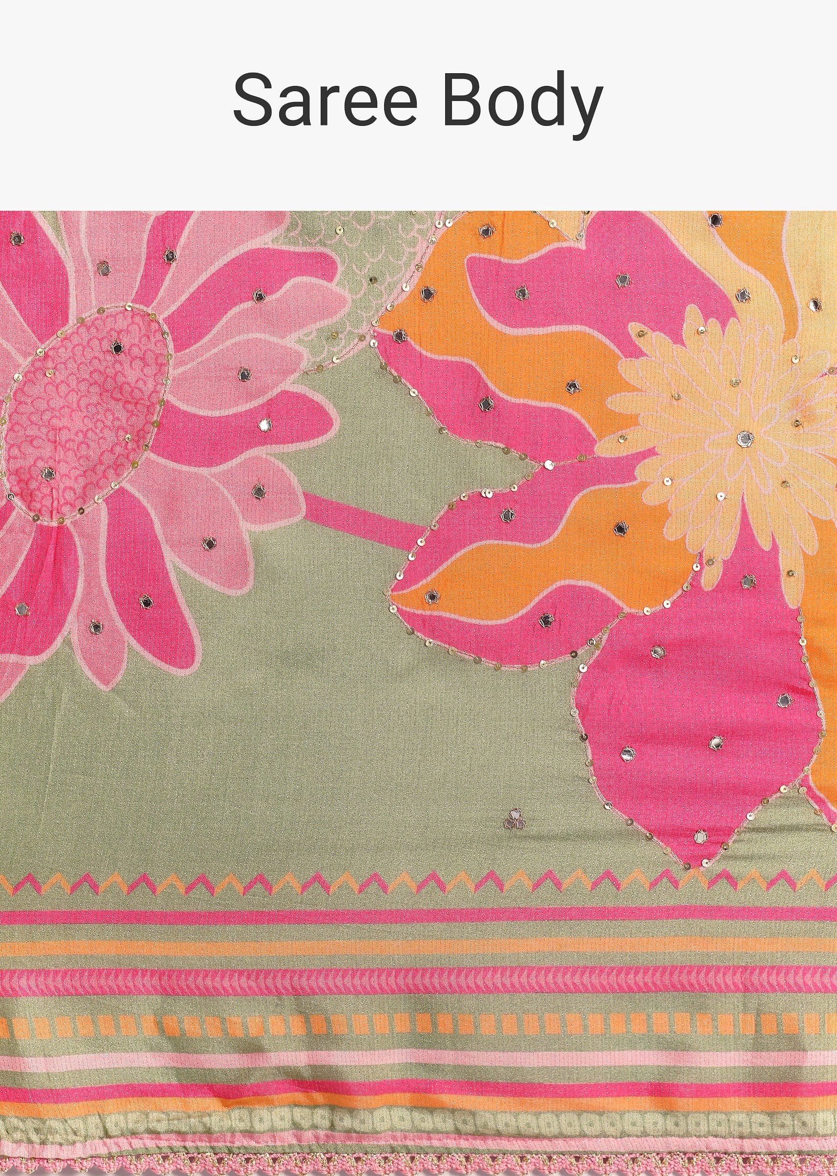 Green Floral Print Saree with Mirror Work