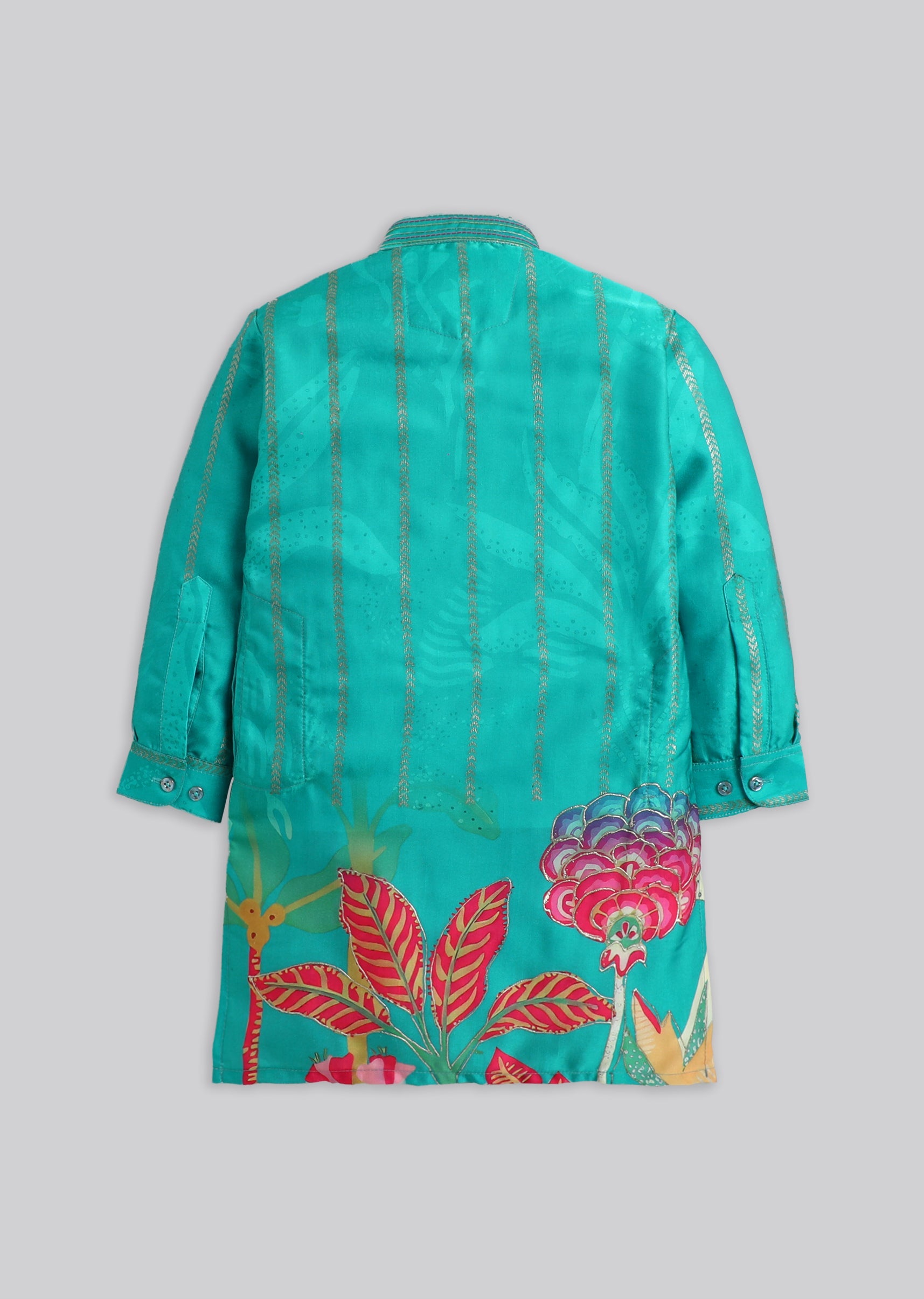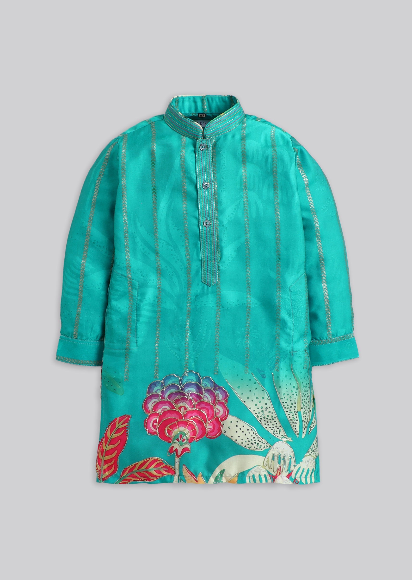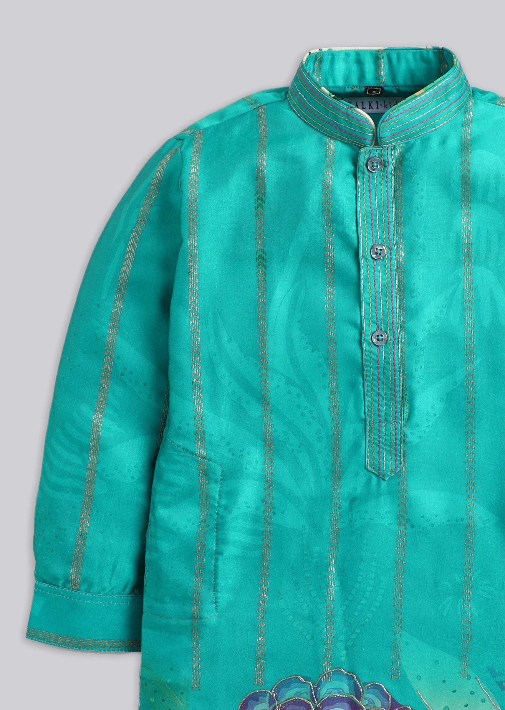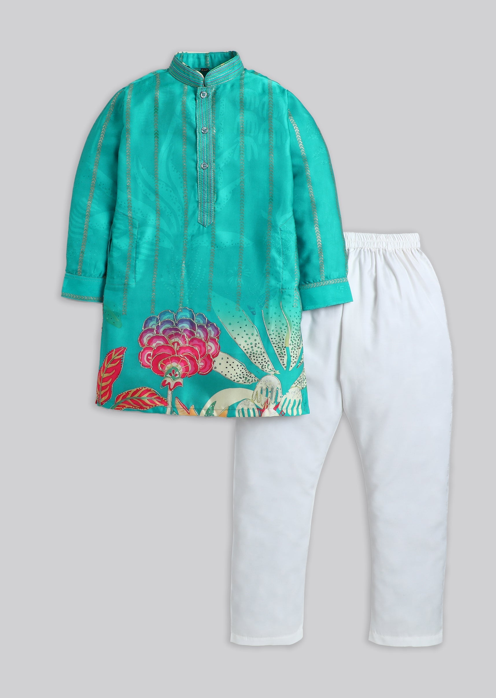 A bright green silk kurta set with floral print detailing, designed with a mandarin collar and front buttons. Paired with matching pants—great for festive celebrations. Awarded as the Most Trusted... More Product Details