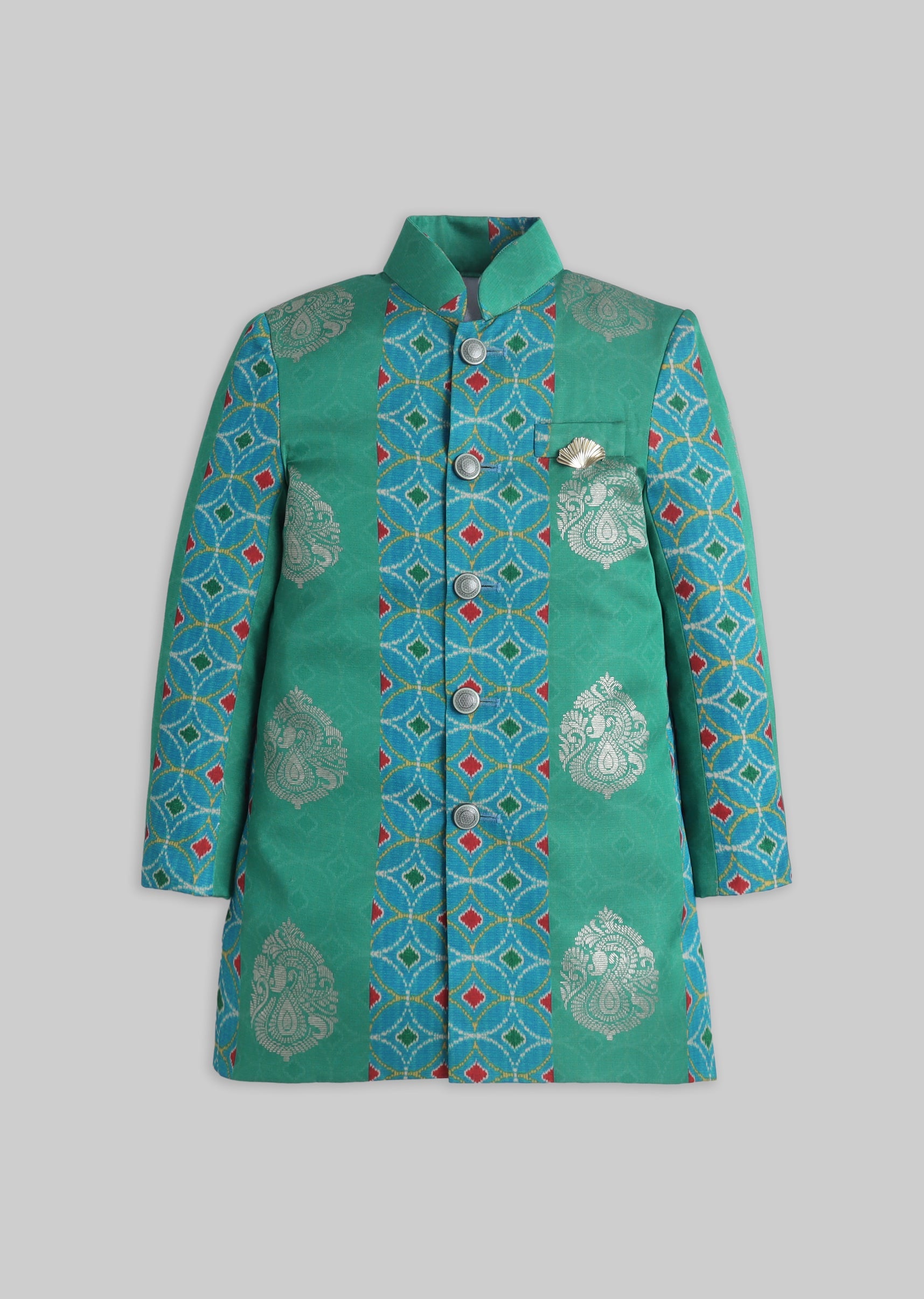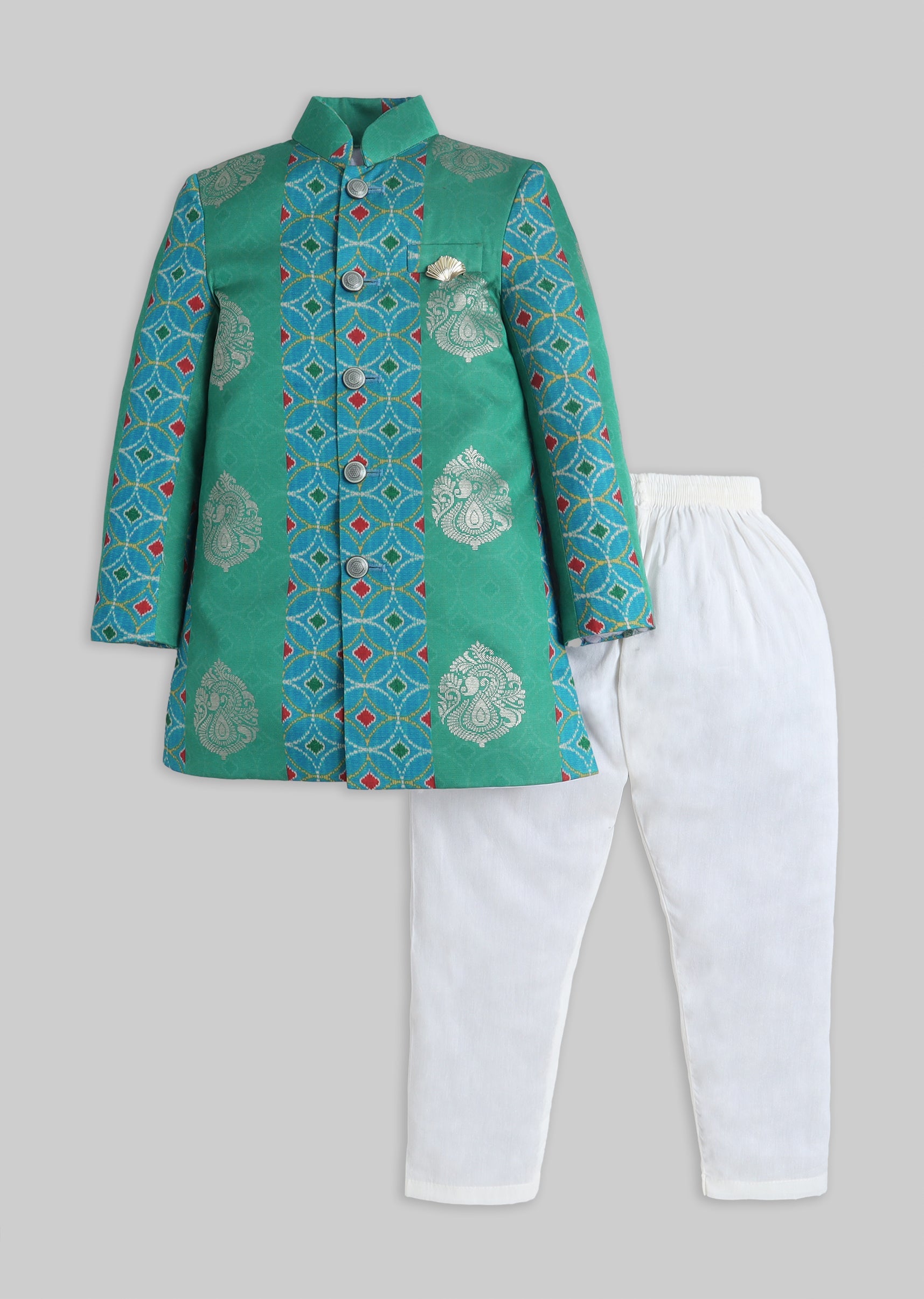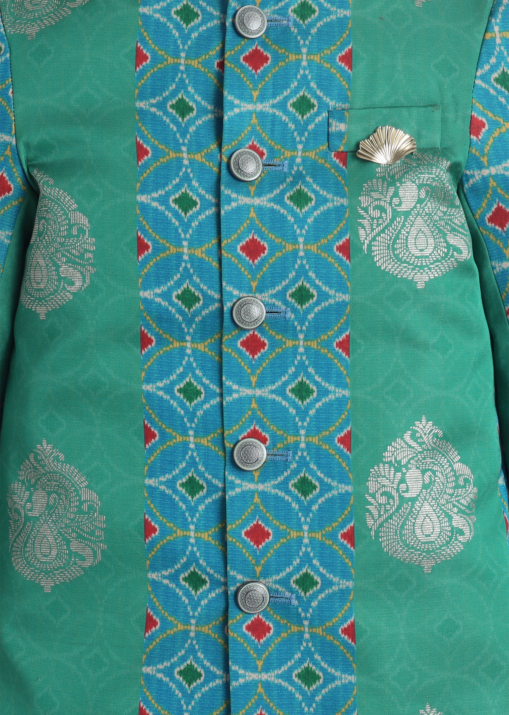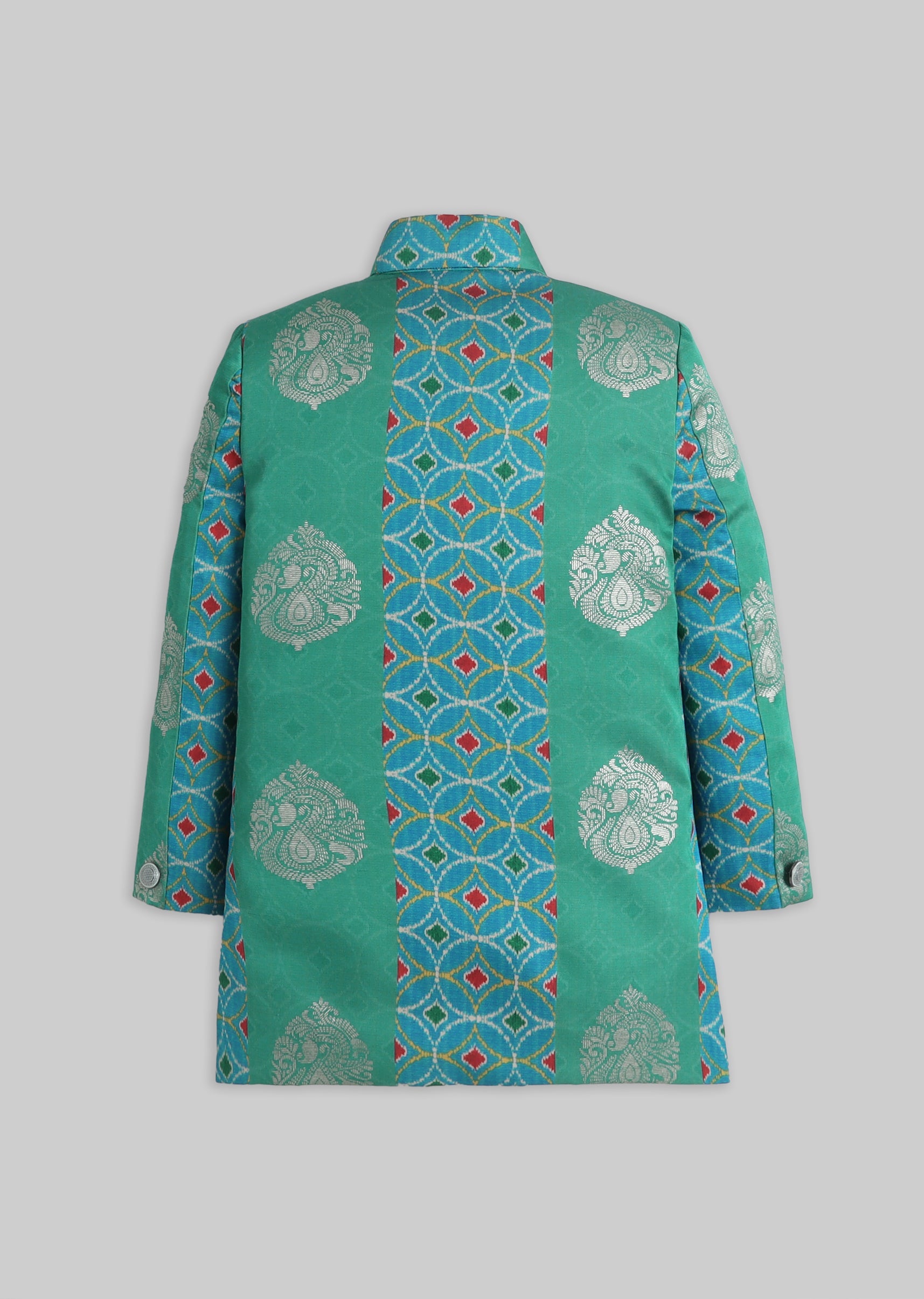A festive silk kurta set in green with foil detailing, styled with a mandarin collar and front buttons. Comes with matching pants—made for special occasions and wedding functions.