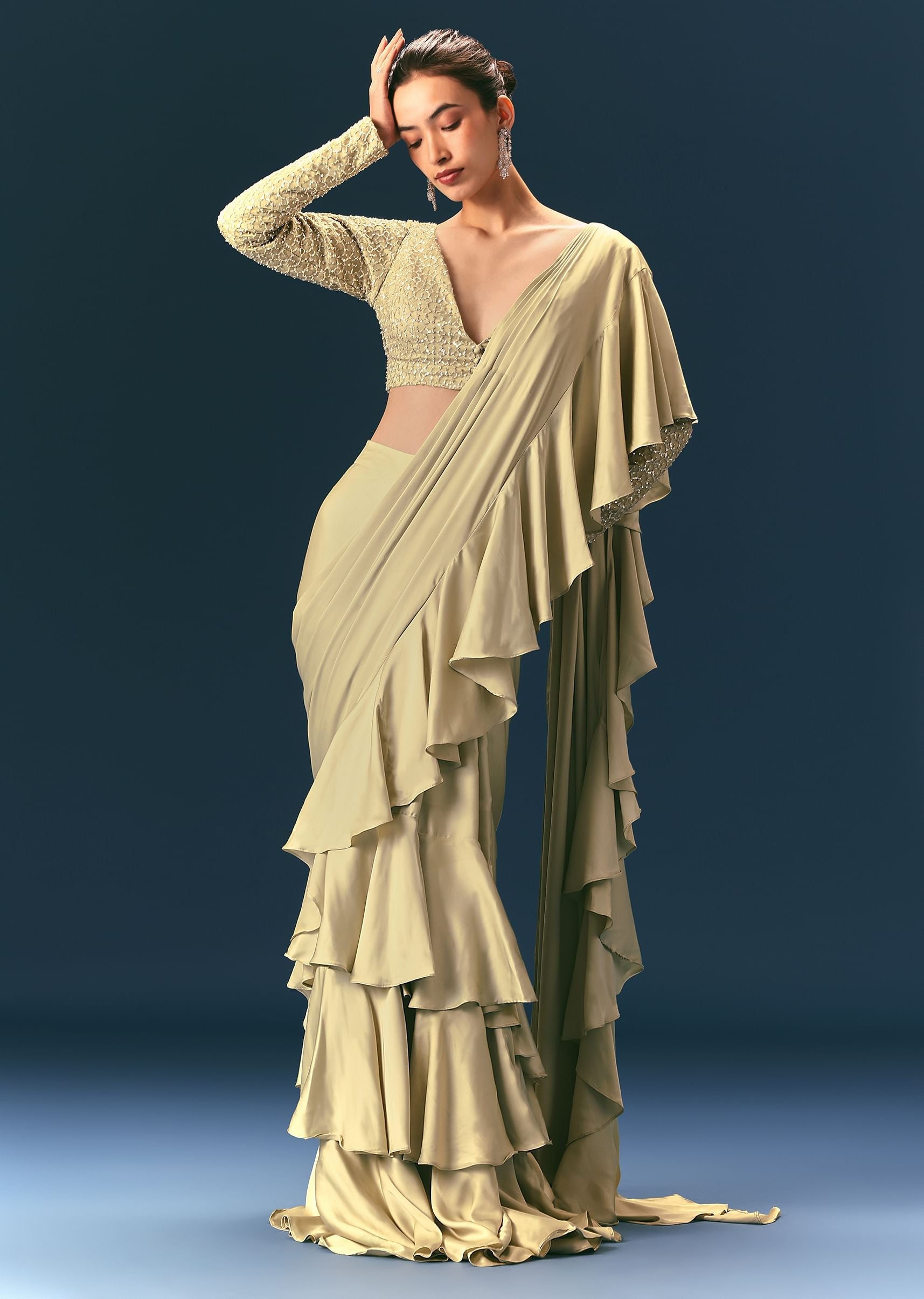 Green Frill Draped Saree With Embellished Blouse