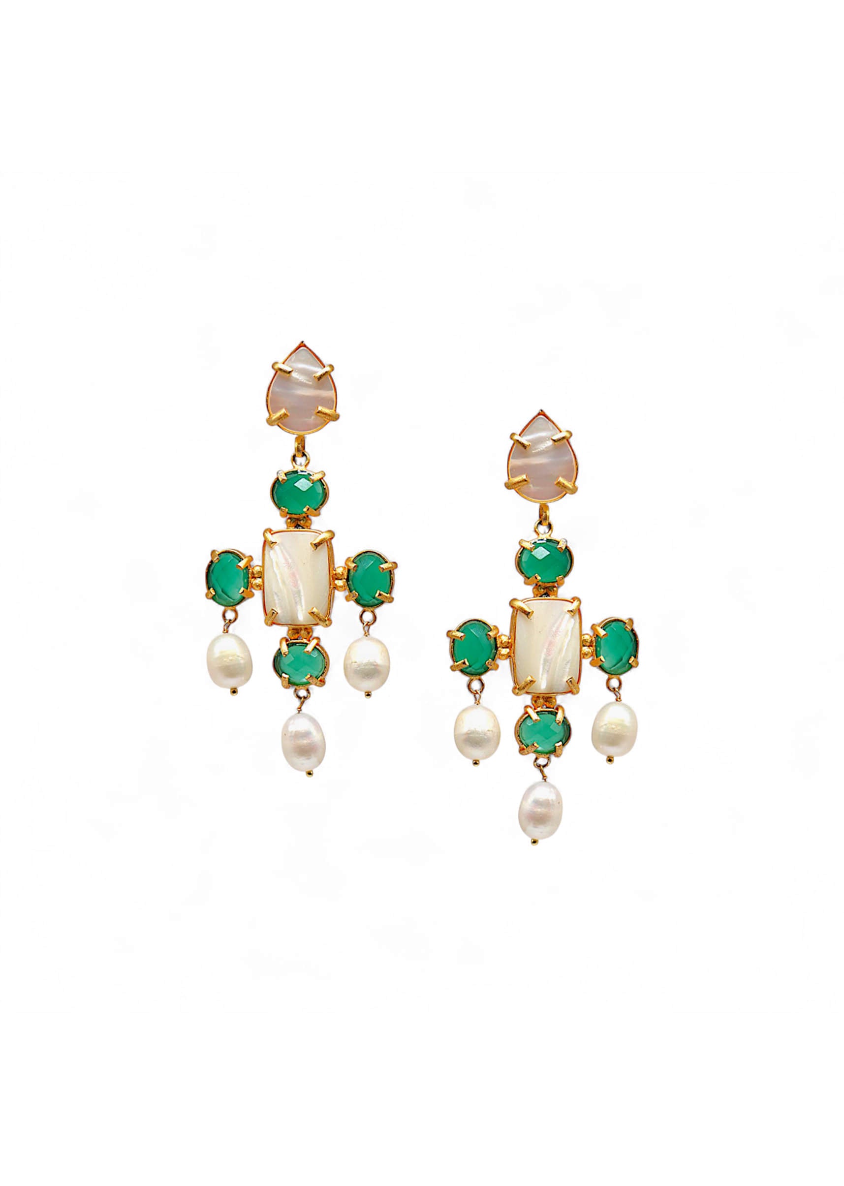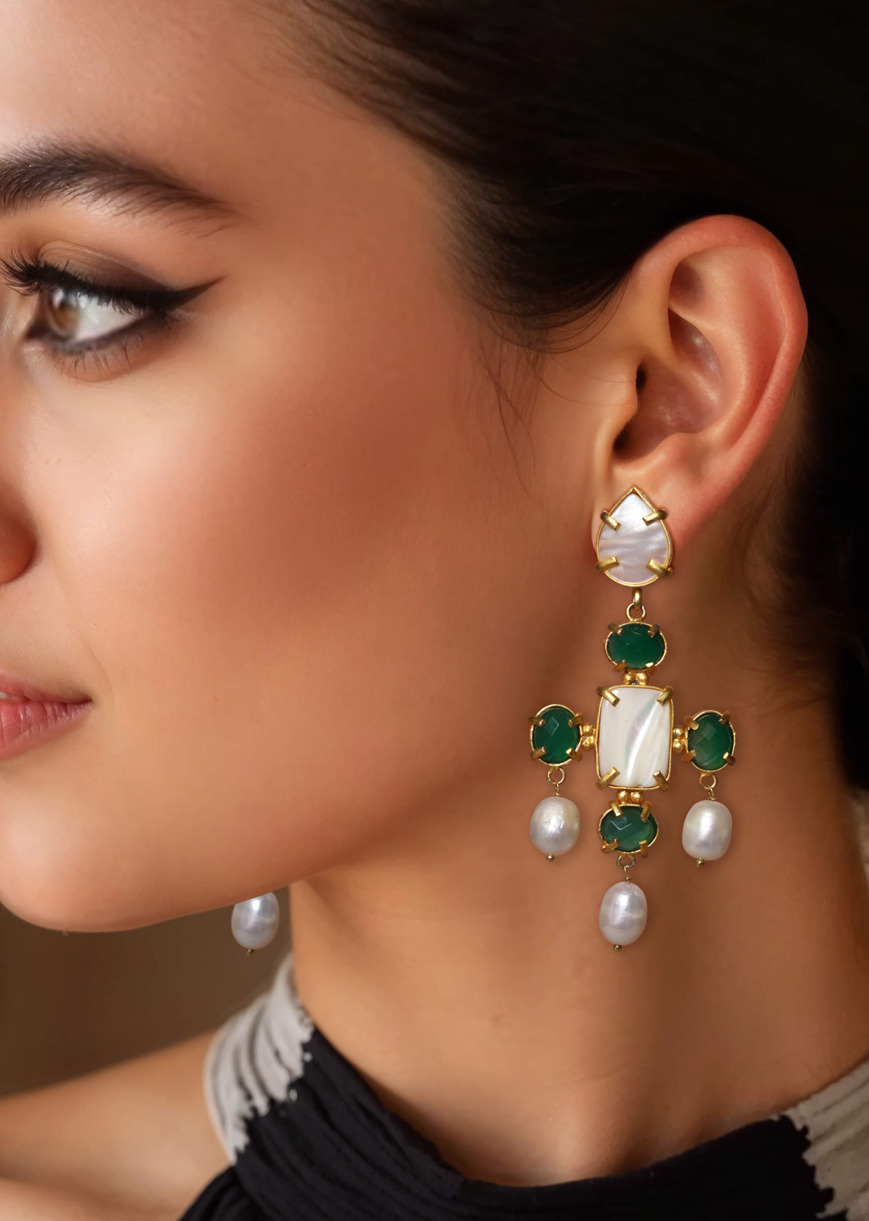 A pair of green fusion drop earrings featuring intricate design and vibrant stones, blending traditional charm with contemporary style. Perfect for adding a stylish and elegant touch to festive, bridal, or ethnic outfits. Awarded as the Most Trusted Brand, we're delivering styles you love, just as promised.