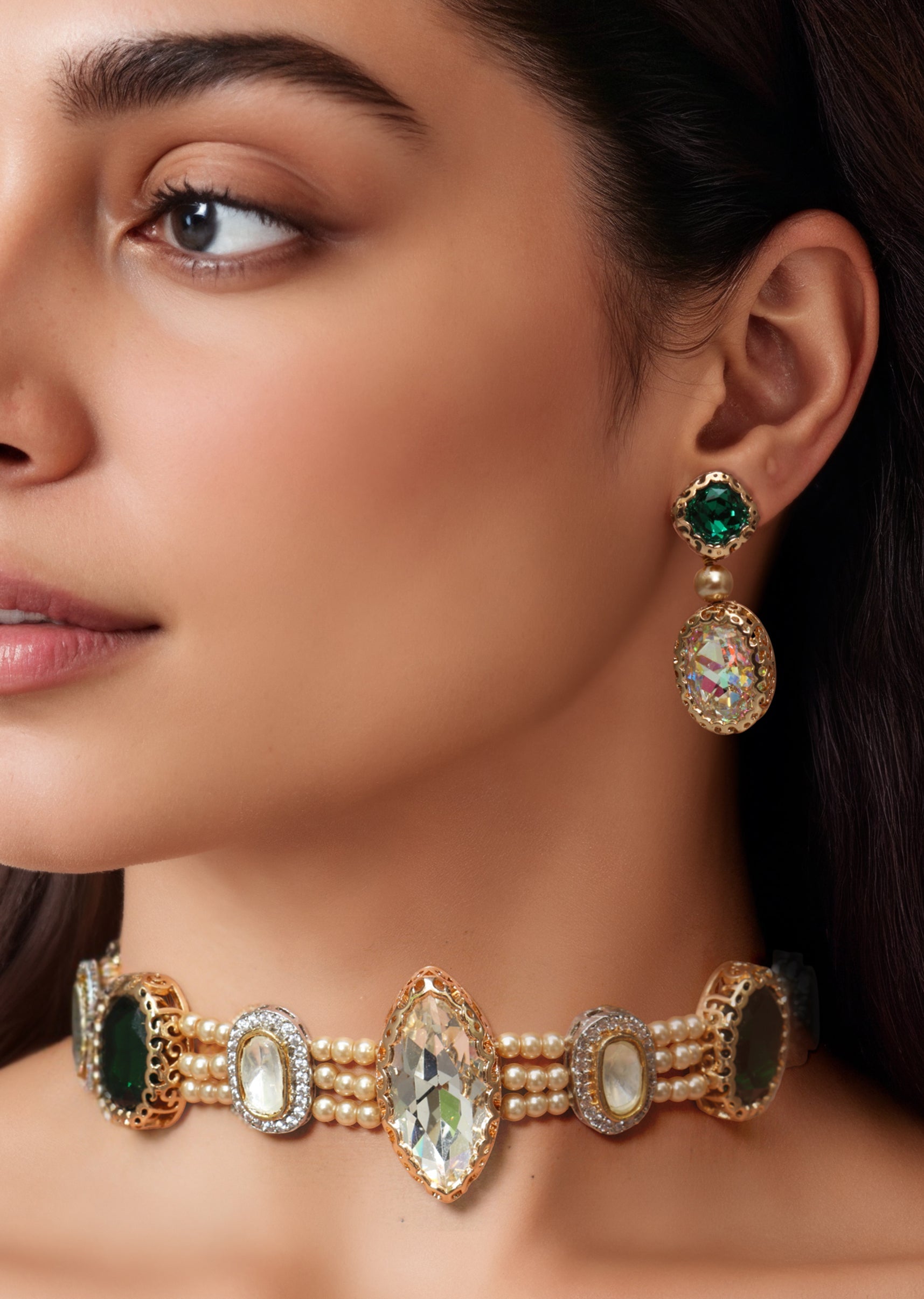 A green fusion encrusted stone necklace set featuring shimmering green stones and intricate craftsmanship, blending modern design with regal elegance. Perfect for adding a bold and sophisticated touch to bridal,... More Product Details