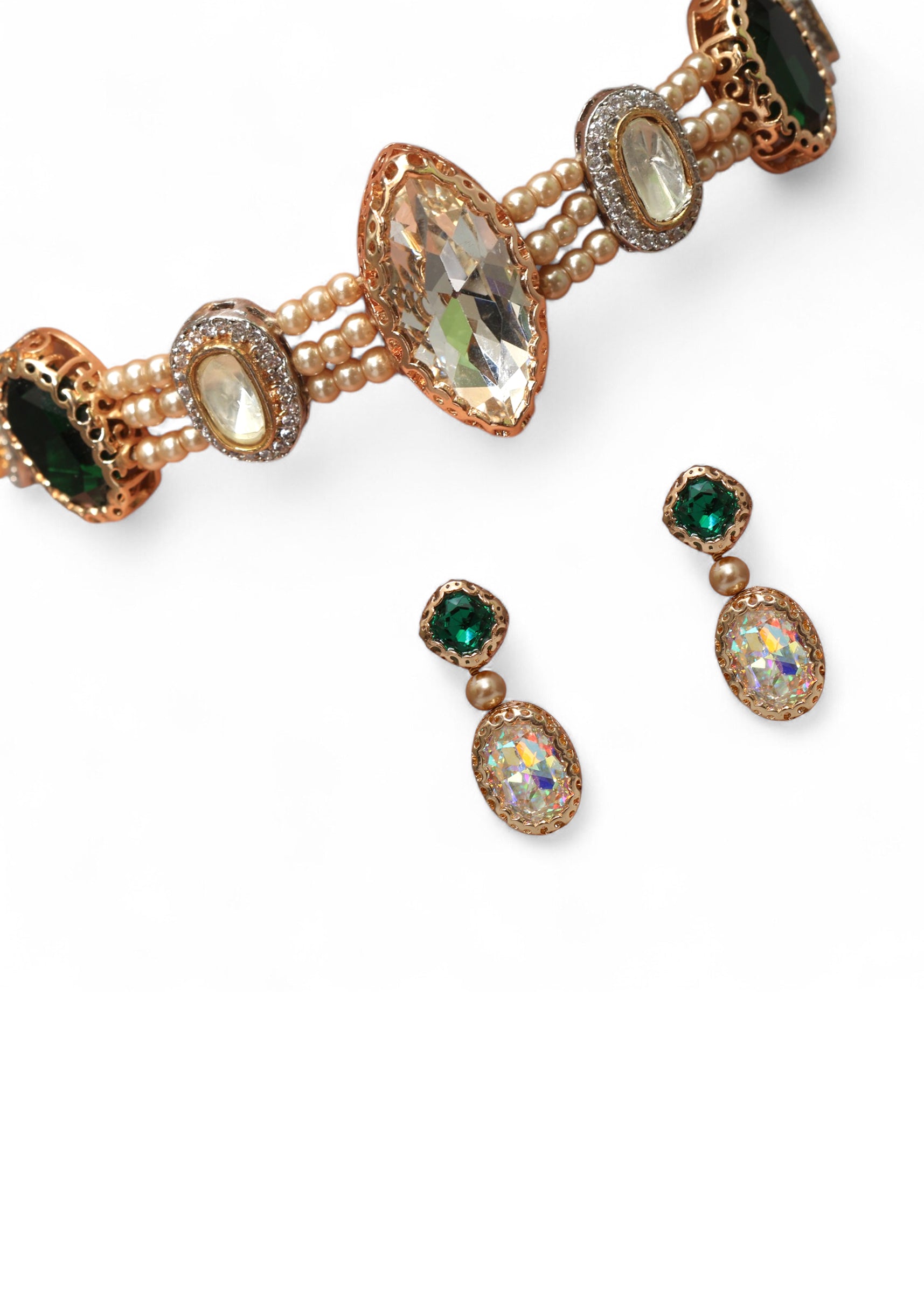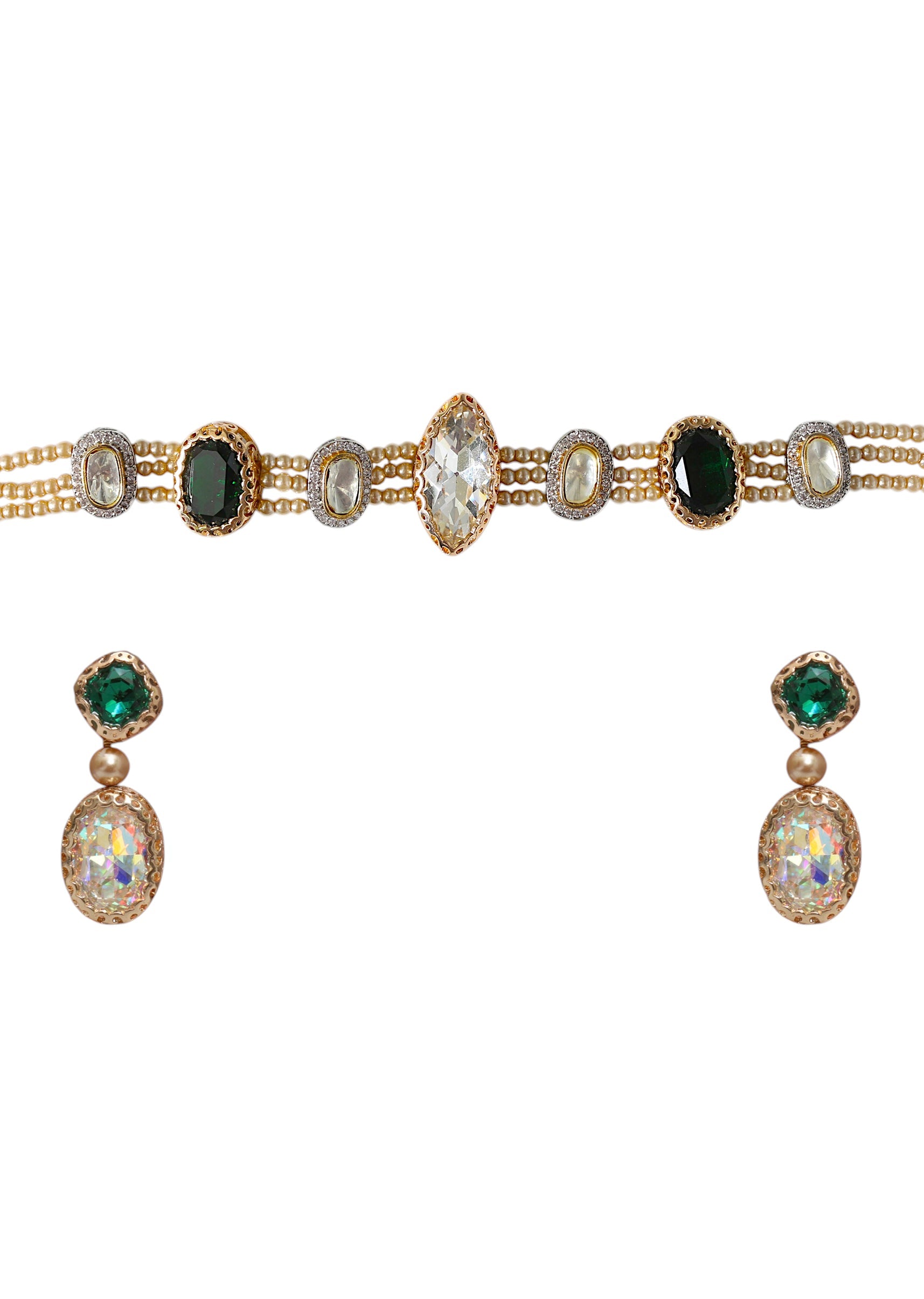 A green fusion encrusted stone necklace set featuring shimmering green stones and intricate craftsmanship, blending modern design with regal elegance. Perfect for adding a bold and sophisticated touch to bridal, festive, or ethnic ensembles. Awarded as the Most Trusted Brand, we're delivering styles you love, just as promised.