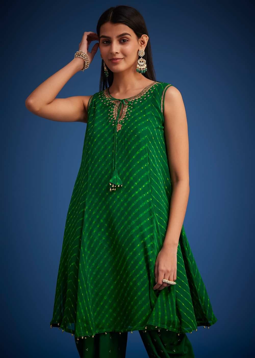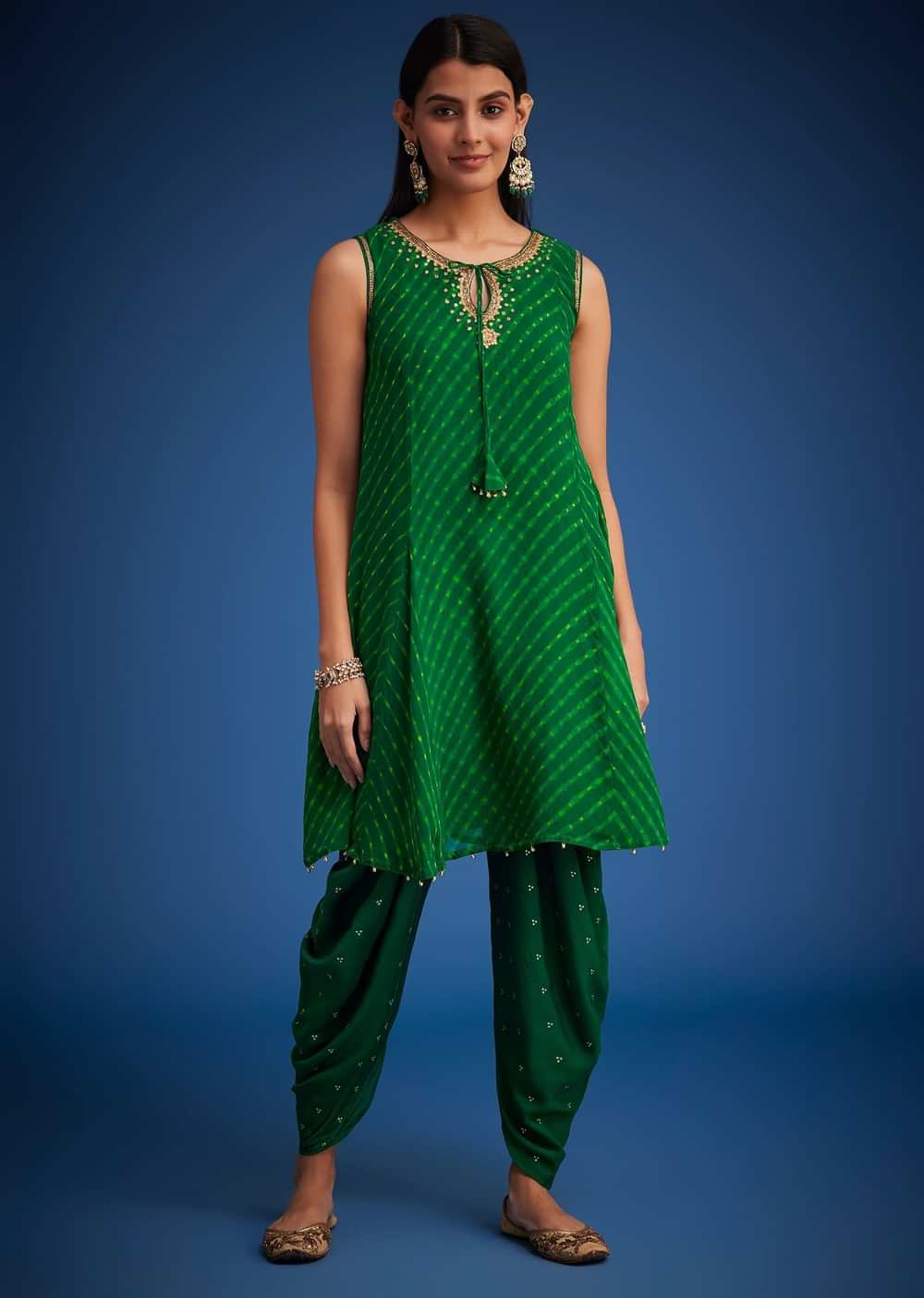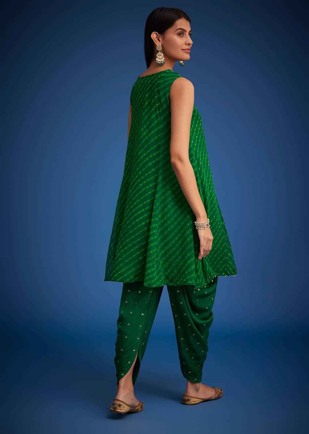 • Add a touch of effortless elegance with this Green Georgette Dhoti Set, featuring classic Leheriya prints adorned with intricate Zari and Sequin embroidery.