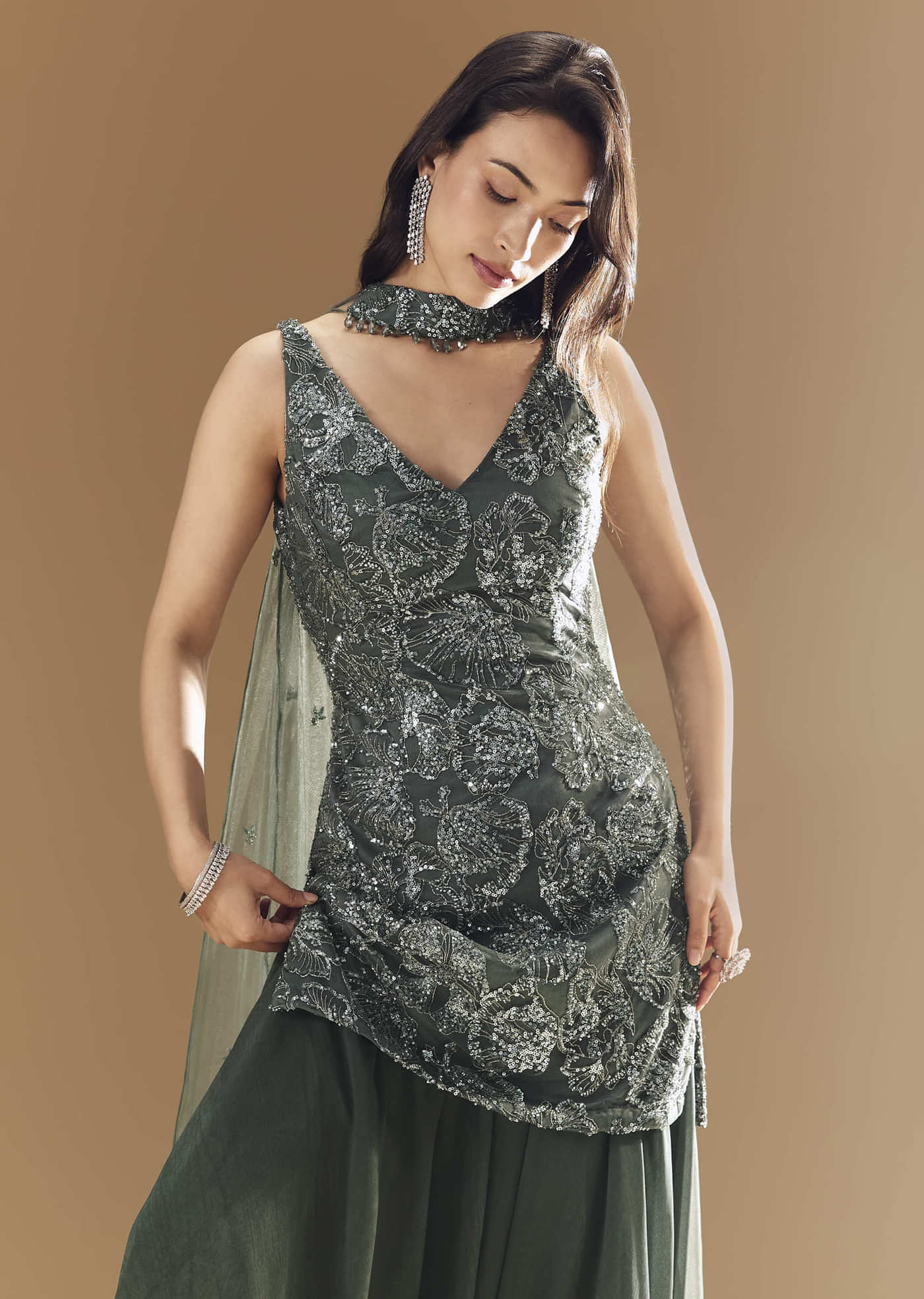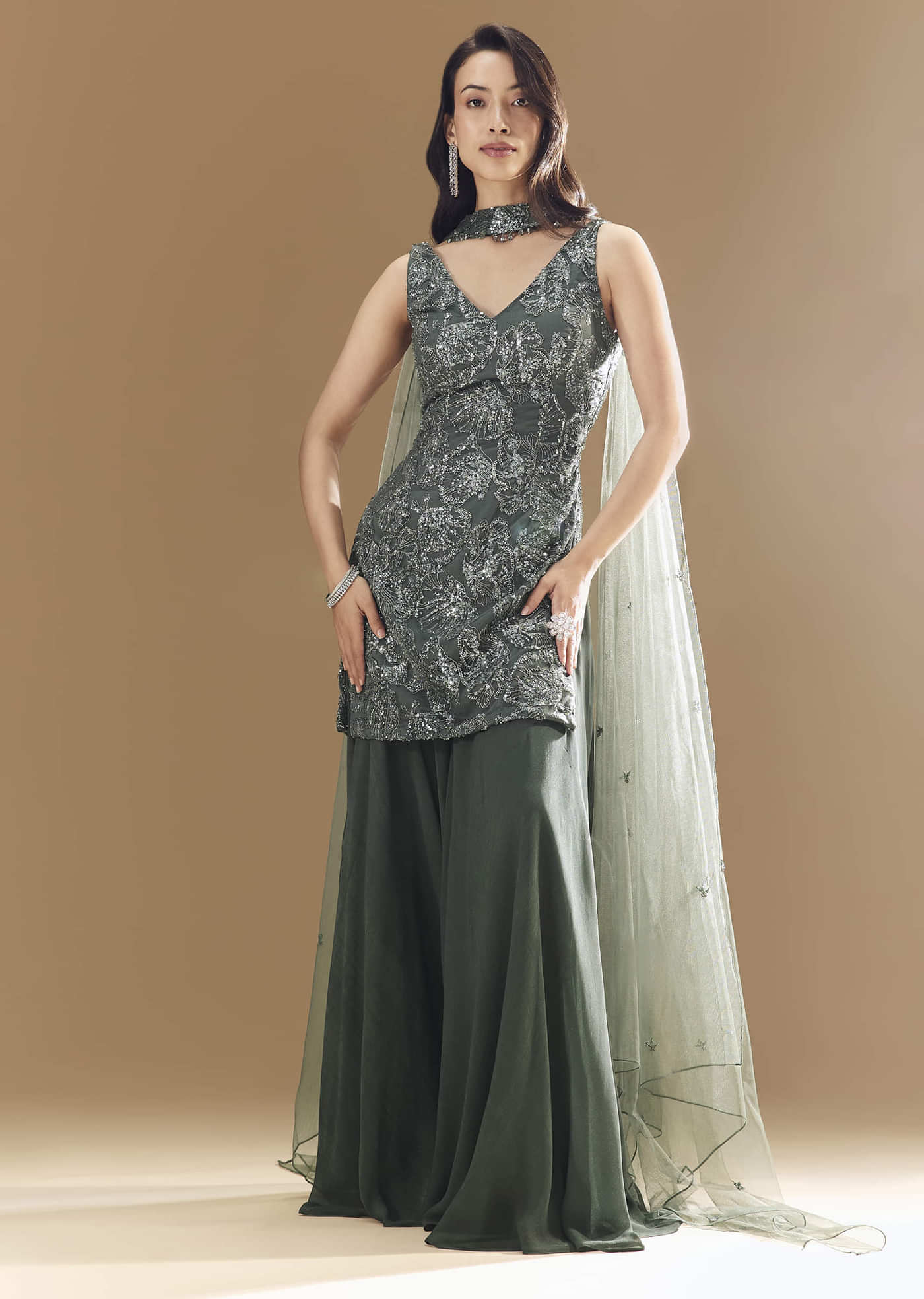 A chic fusion of modern elegance and festive charm, this green georgette palazzo set stands out with its fluid silhouette and delicate detailing. The embellished crop top features fine cutdana... More Product Details