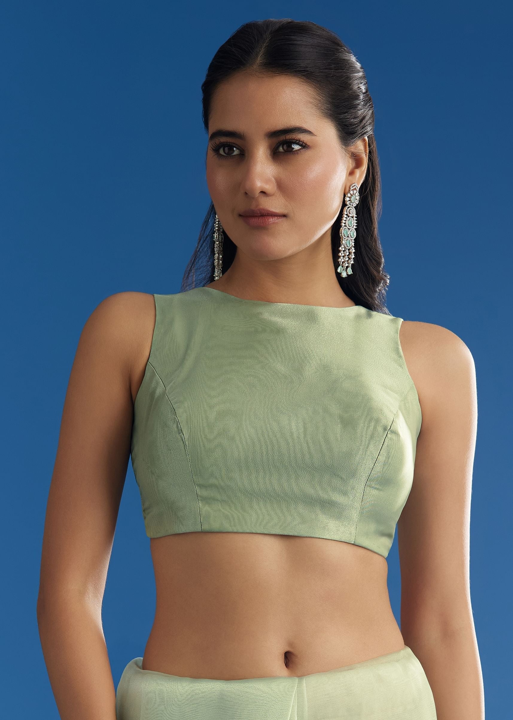 As delicate as morning mist, this green glass tissue saree is embroidered all over with sequins and cutdana—elevating quiet glamour to poetic finesse. Awarded as the Most Trusted Brand, we're delivering styles you love, just as promised.