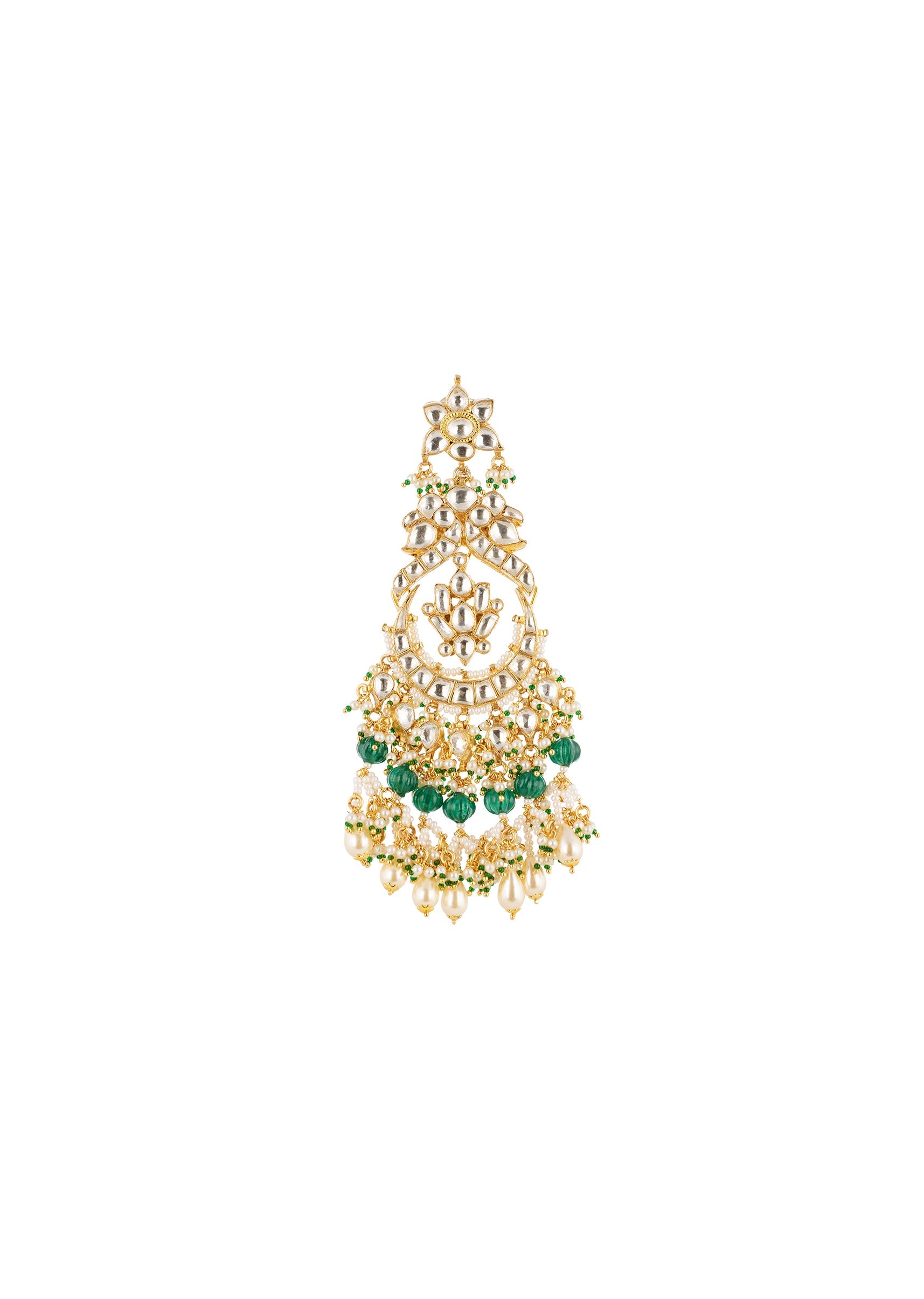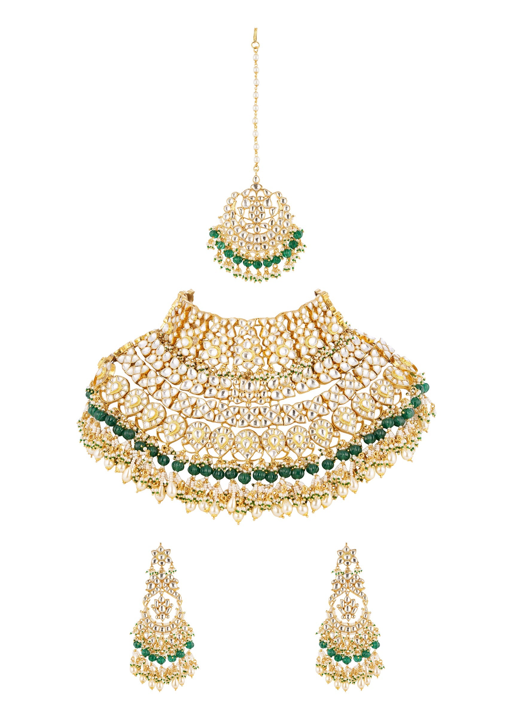 Pair it with green, gold, or pastel bridal outfits to highlight the kundan work and complete your wedding or haldi look.