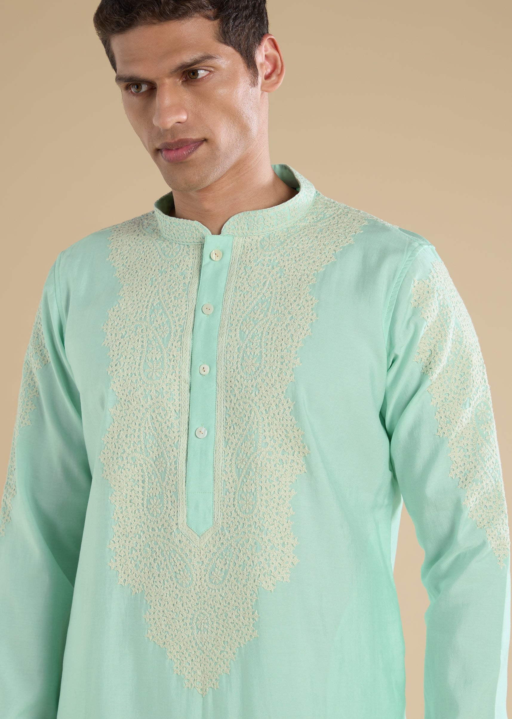 Fresh and understated, this green kurta set showcases detailed Gujarati hand embroidery on lightweight Chanderi fabric. Designed with a mandarin collar, full sleeves, and side slits, it blends traditional craftsmanship... More Product Details