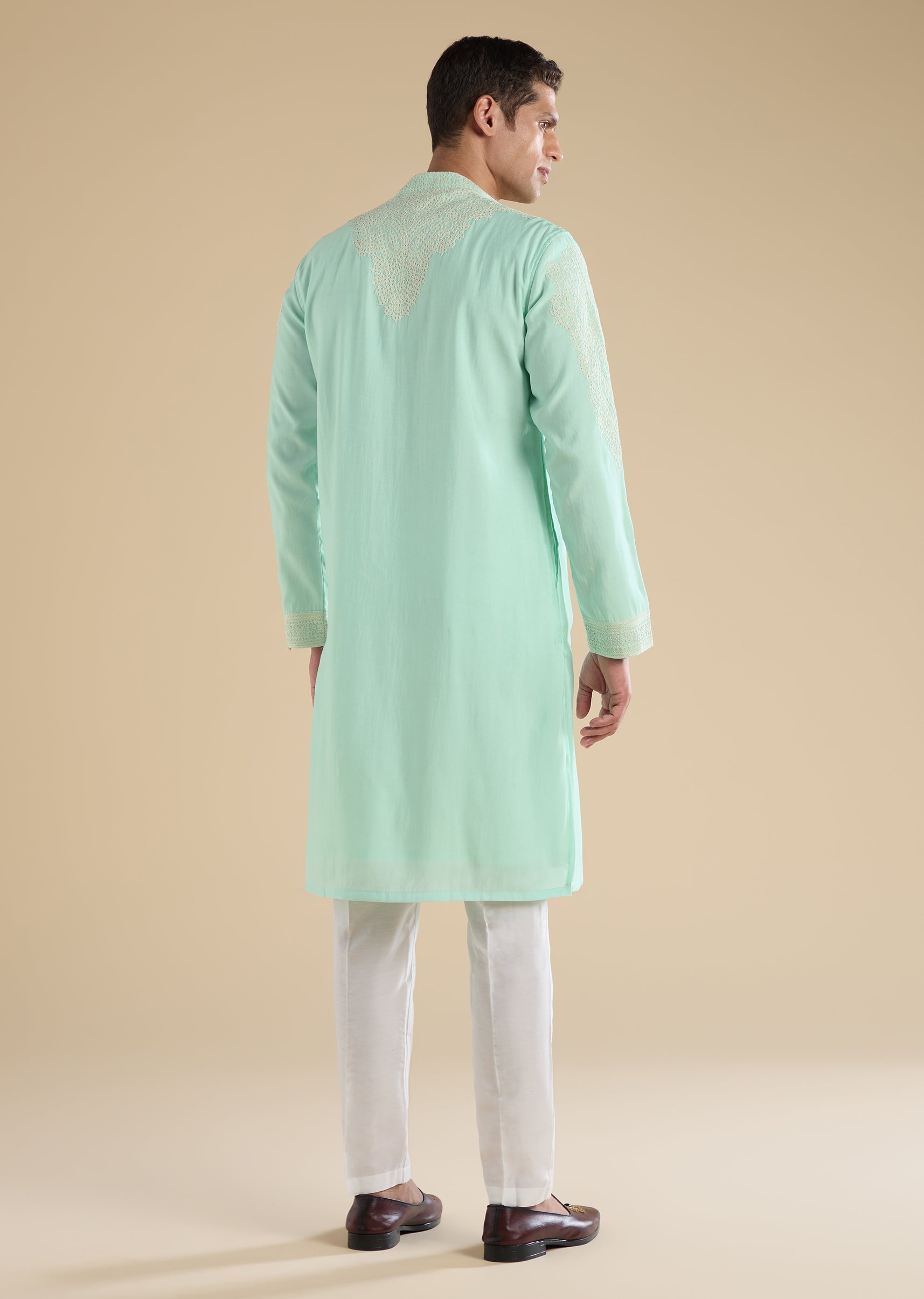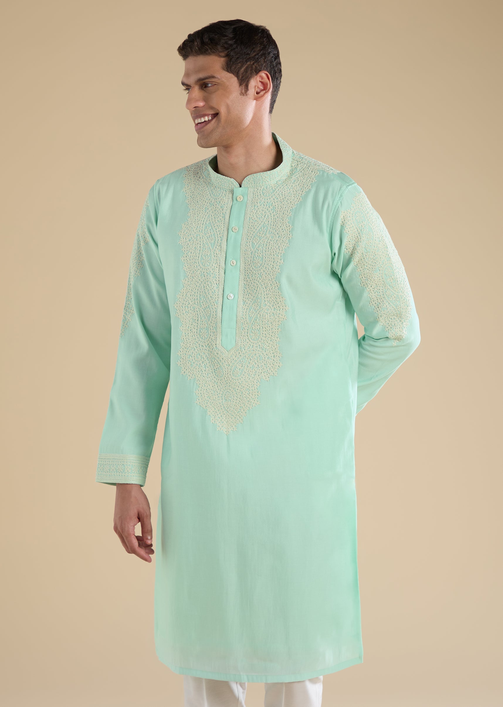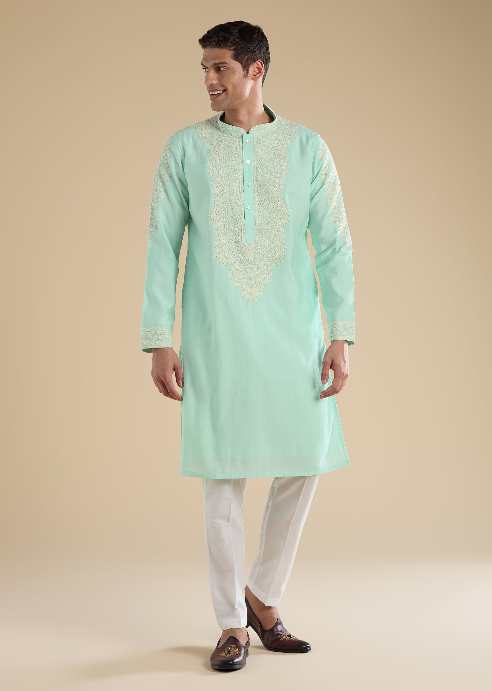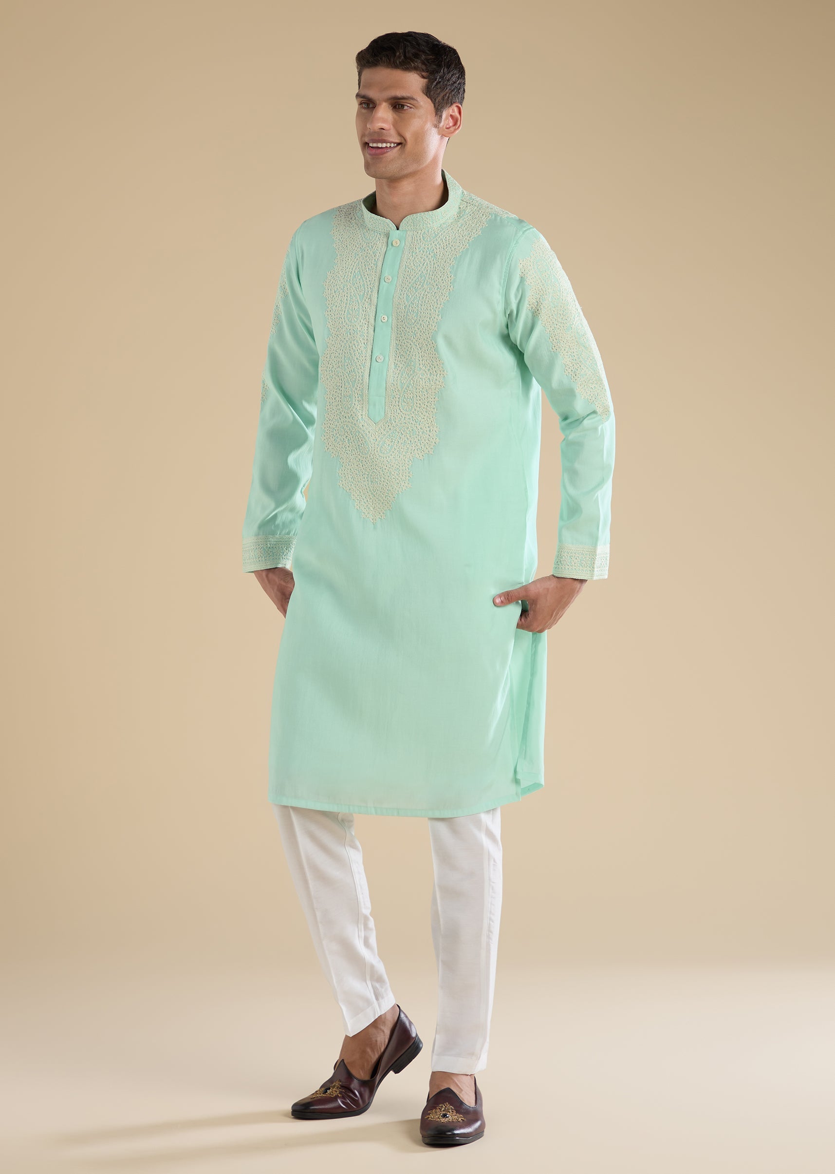 Fresh and understated, this green kurta set showcases detailed Gujarati hand embroidery on lightweight Chanderi fabric. Designed with a mandarin collar, full sleeves, and side slits, it blends traditional craftsmanship with modern simplicity. Finished with straight-fit trousers, this set is perfect for pooja and festive wear. Awarded as the Most Trusted Brand, we're delivering styles you love, just as promised.