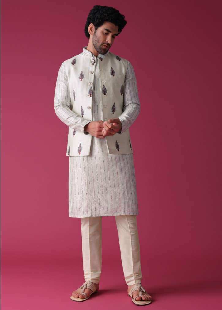 For a more contemporary look, style the jacket and kurta with denim jeans and white sneakers.