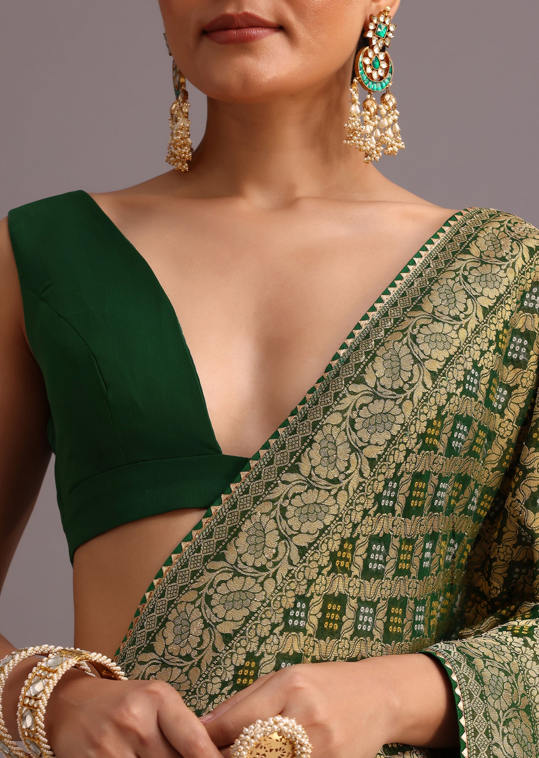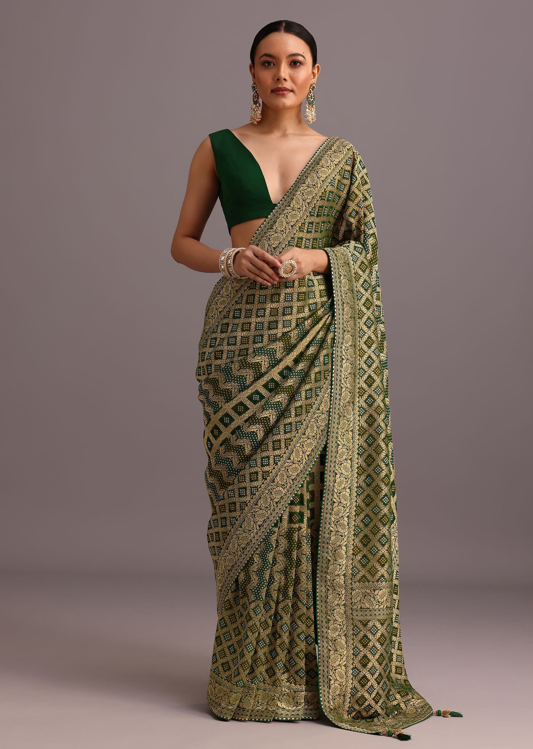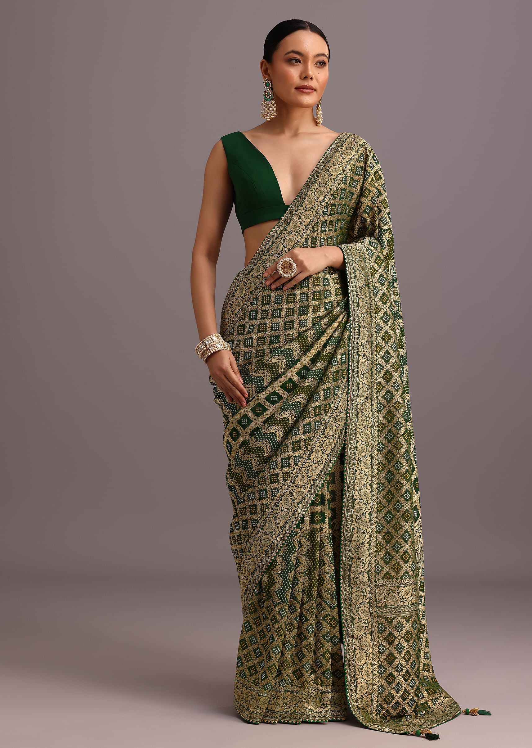 Green Khaddi Georgette Bandhani Saree With Zari Jaal Motif Weave