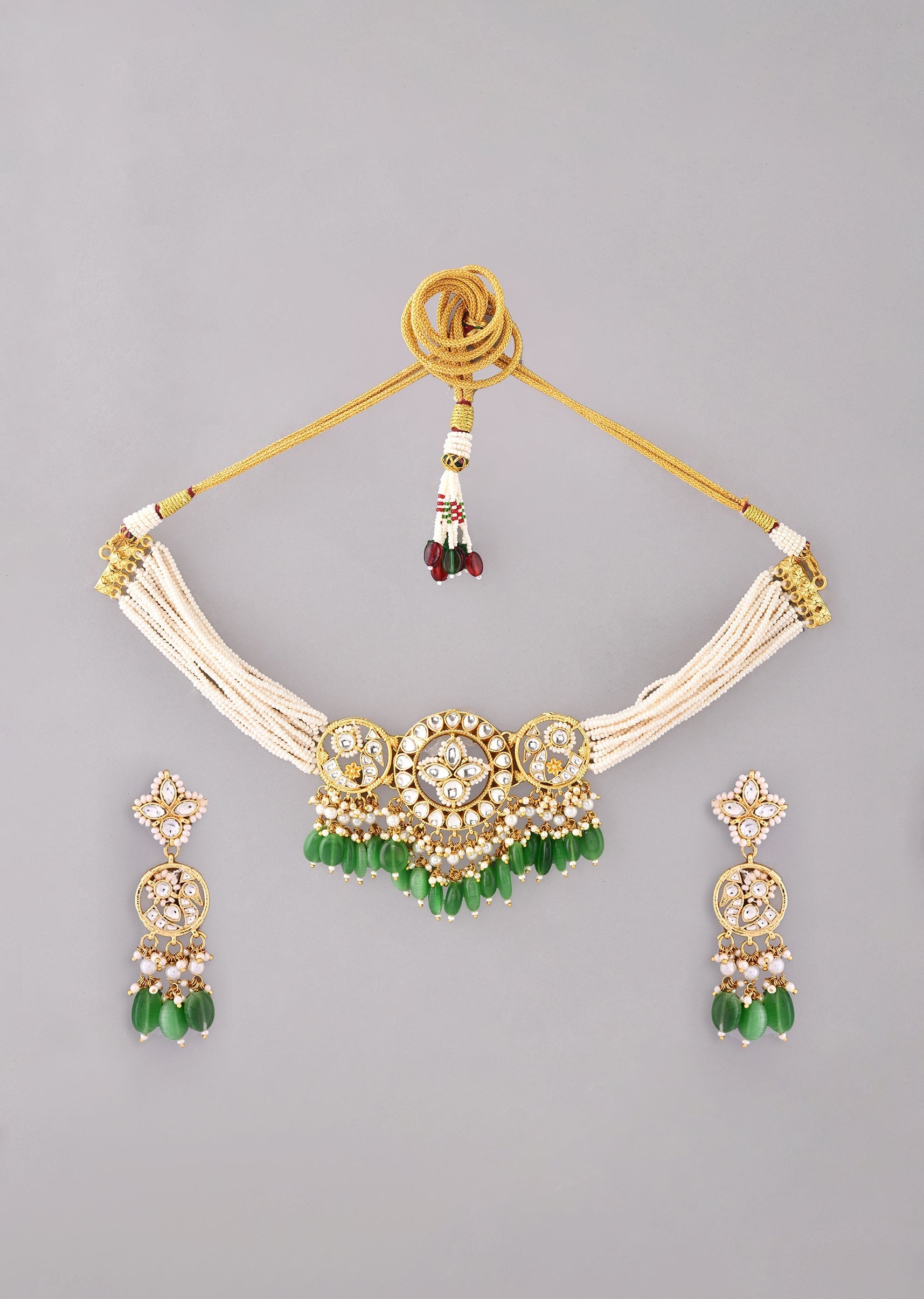 Brighten your festive look with this green kundan pendant necklace and earrings set, accented with elegant bead drops for a refined touch. Perfect for weddings or celebrations, it adds a... More Product Details
