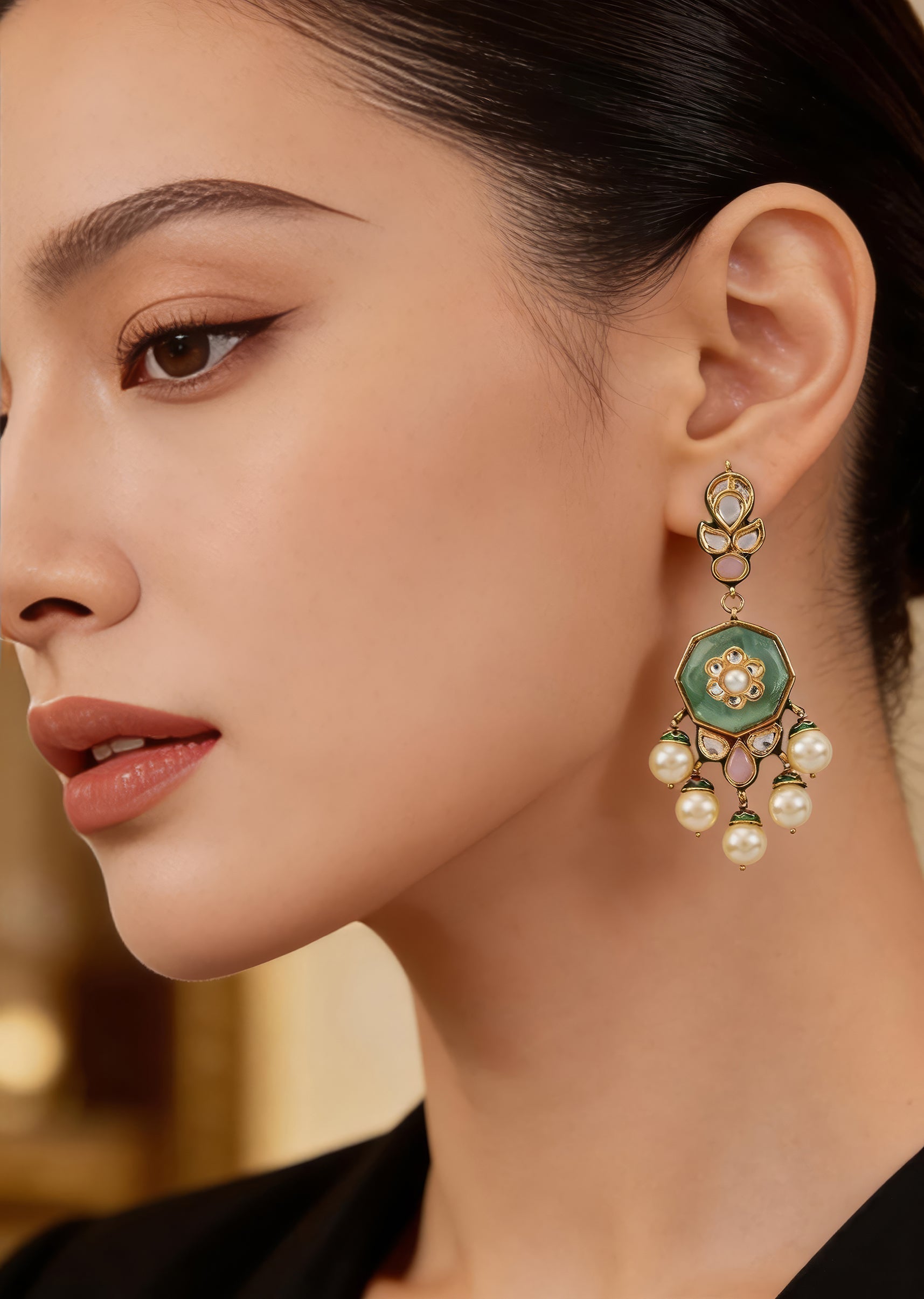 Elevate your look with these handcrafted earrings featuring vibrant green enamel, intricate Kundan detailing & elegant pearl drops. A timeless accessory,perfect for festive & special occasions. Product dimensions may vary... More Product Details