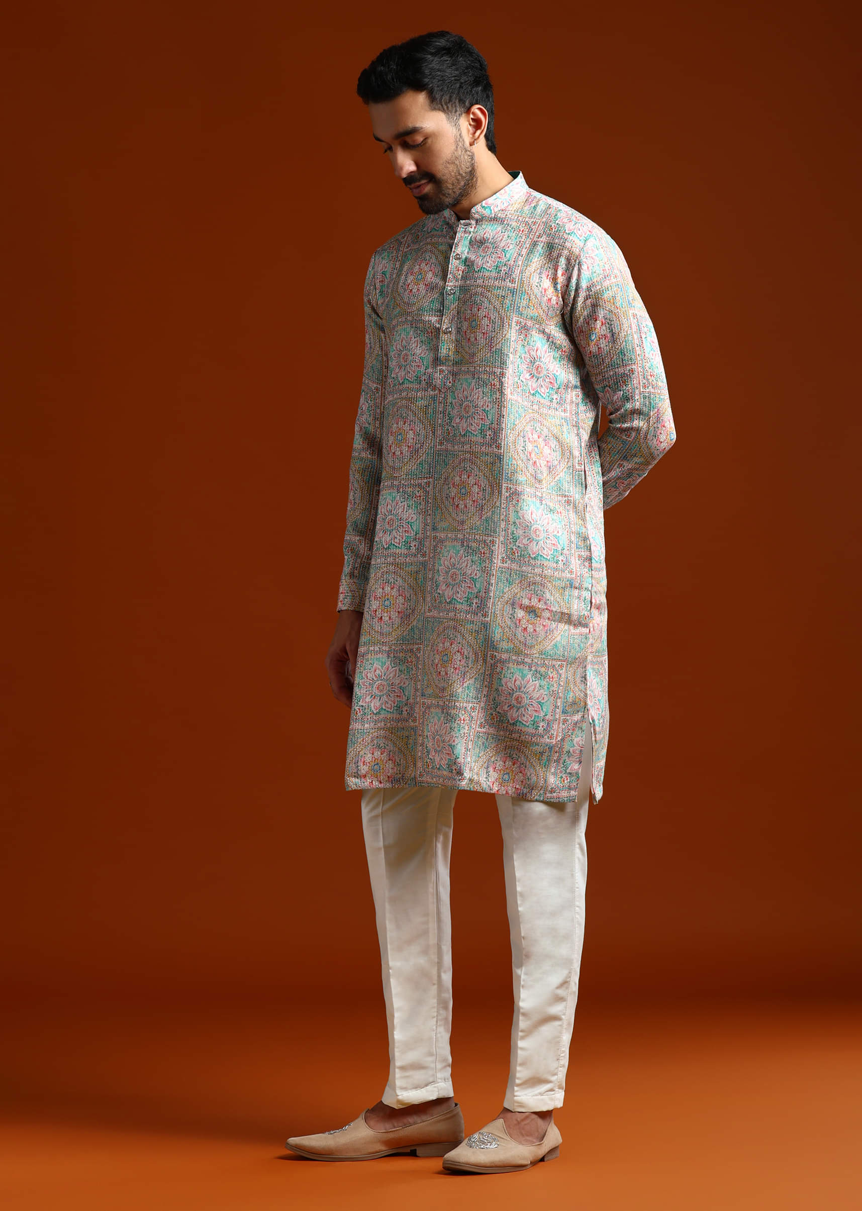 Easy to wear and easy to style, this green linen blend men’s kurta set uses kantha lines to add quiet interest across the surface. The stitches bring just enough character... More Product Details