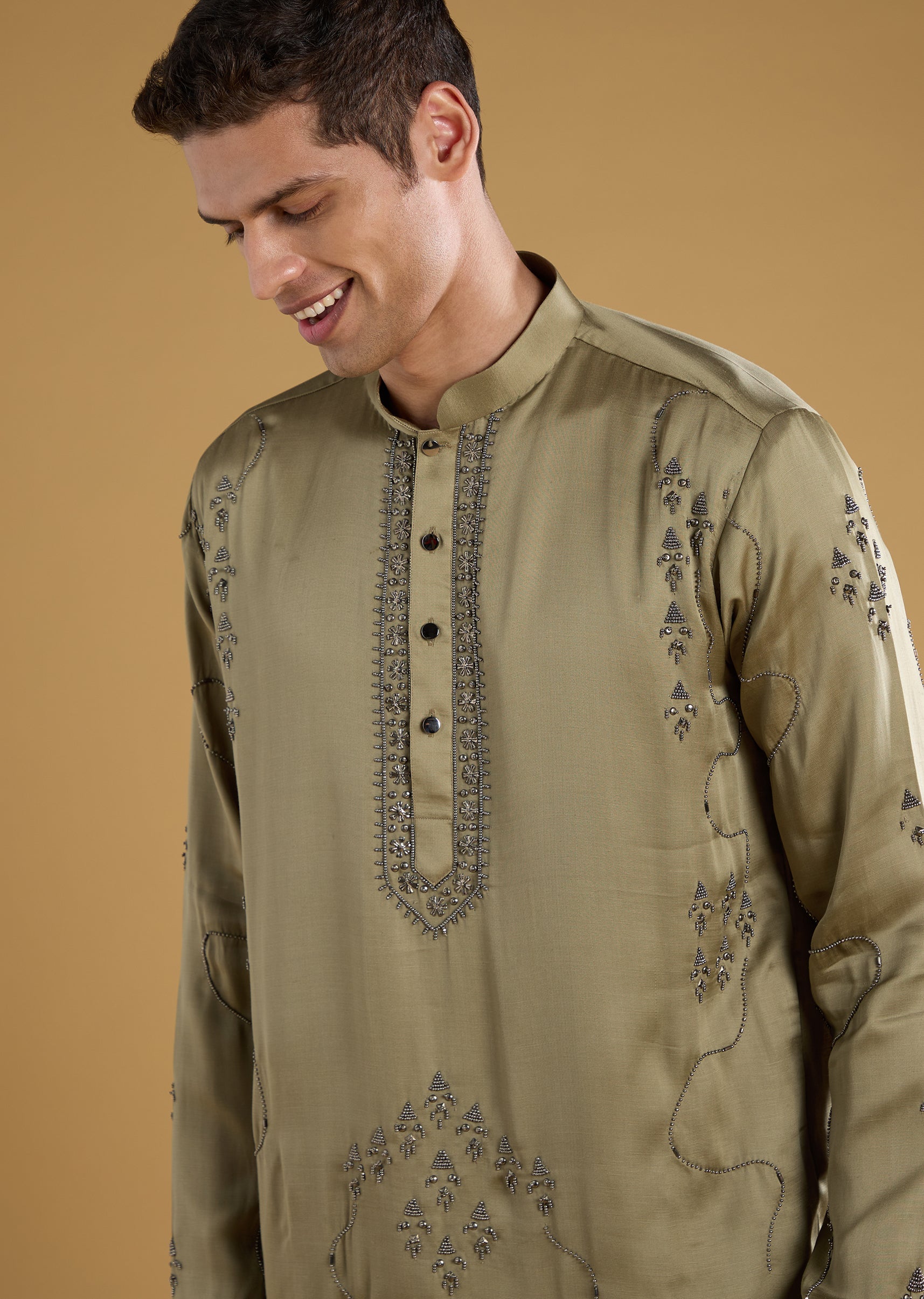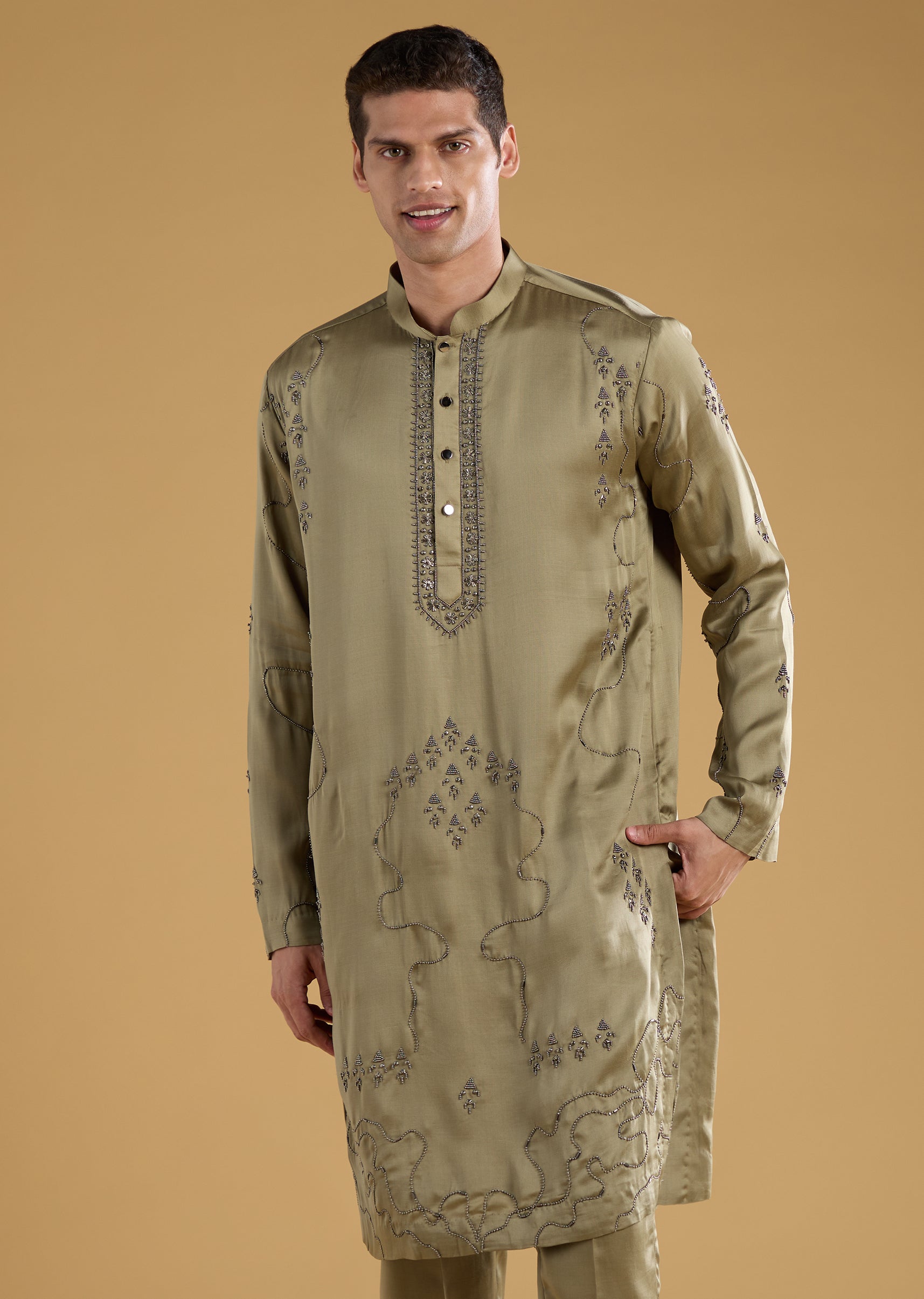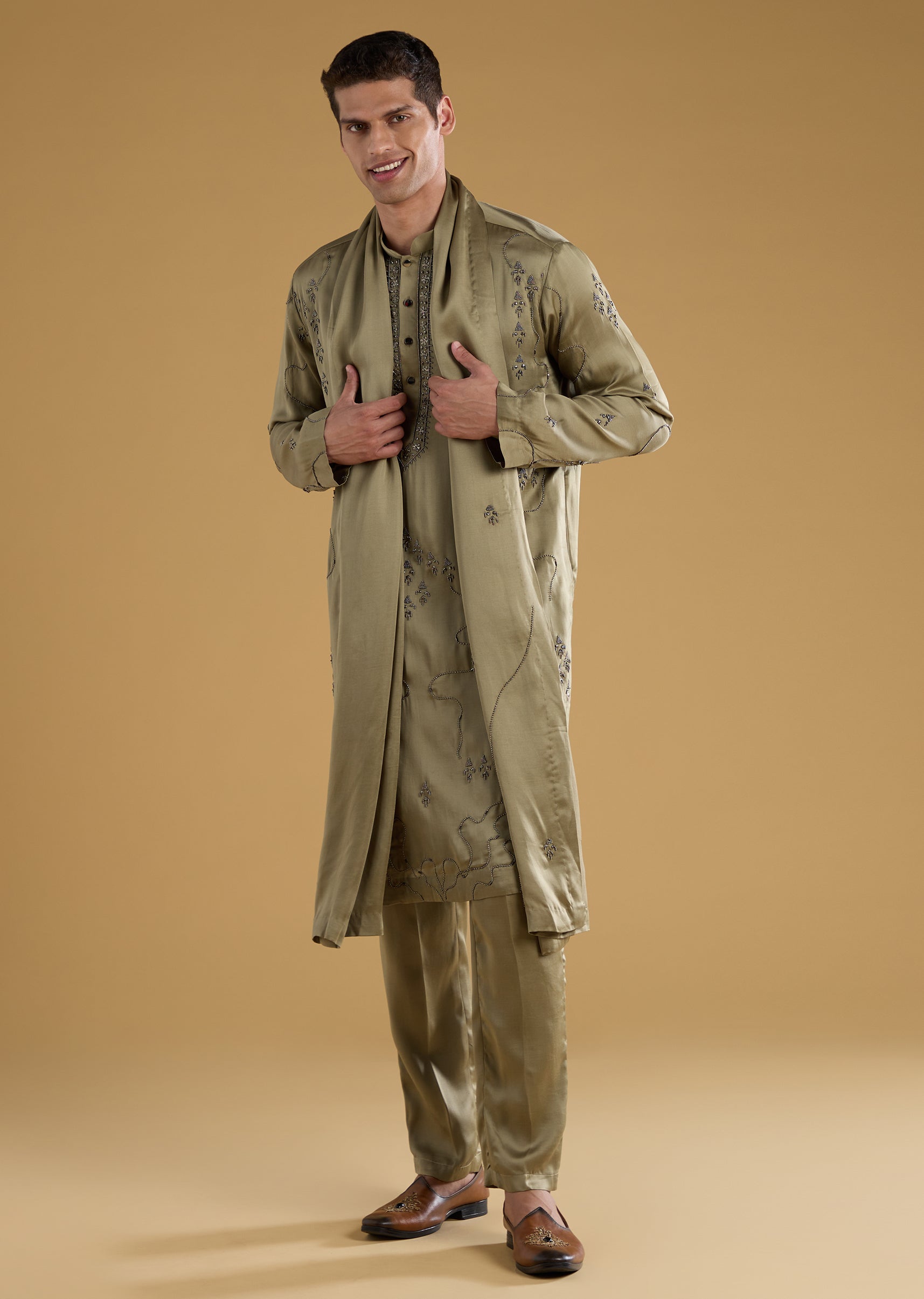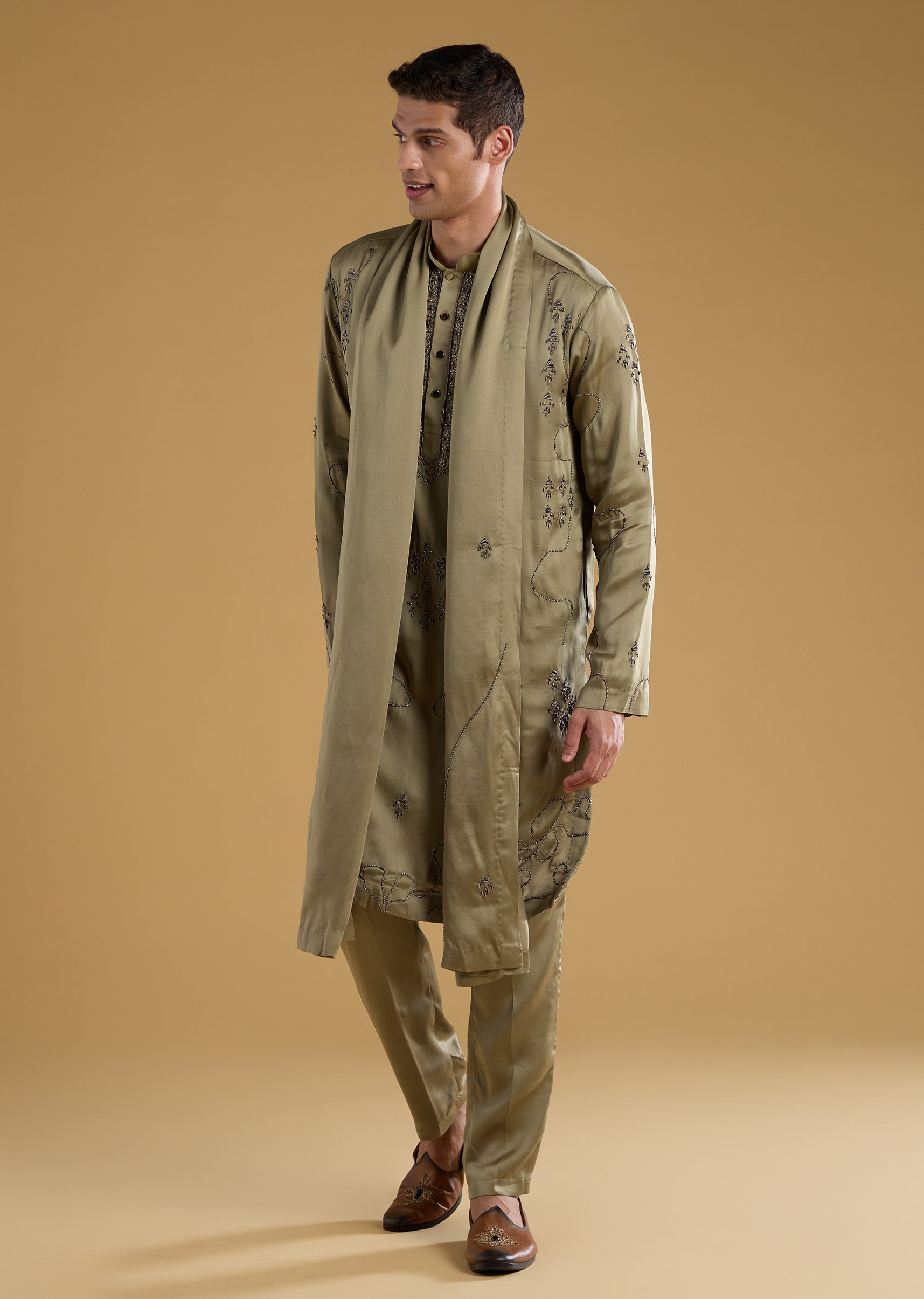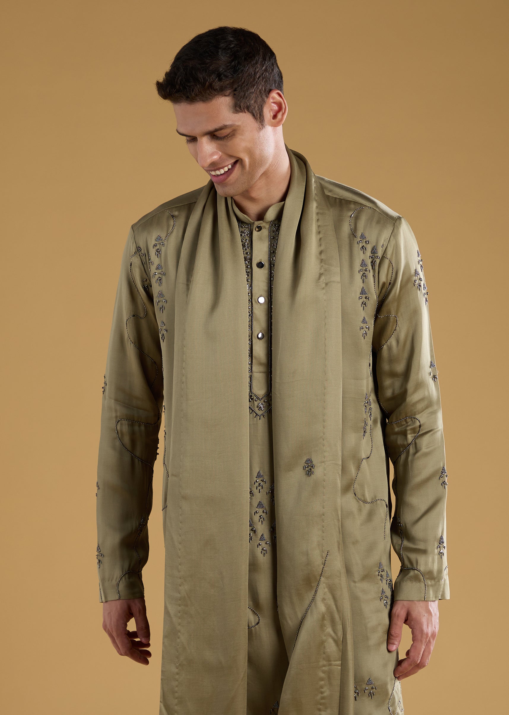 Green Linen Blend Silk Embroidered Mens Kurta Set with Dupatta