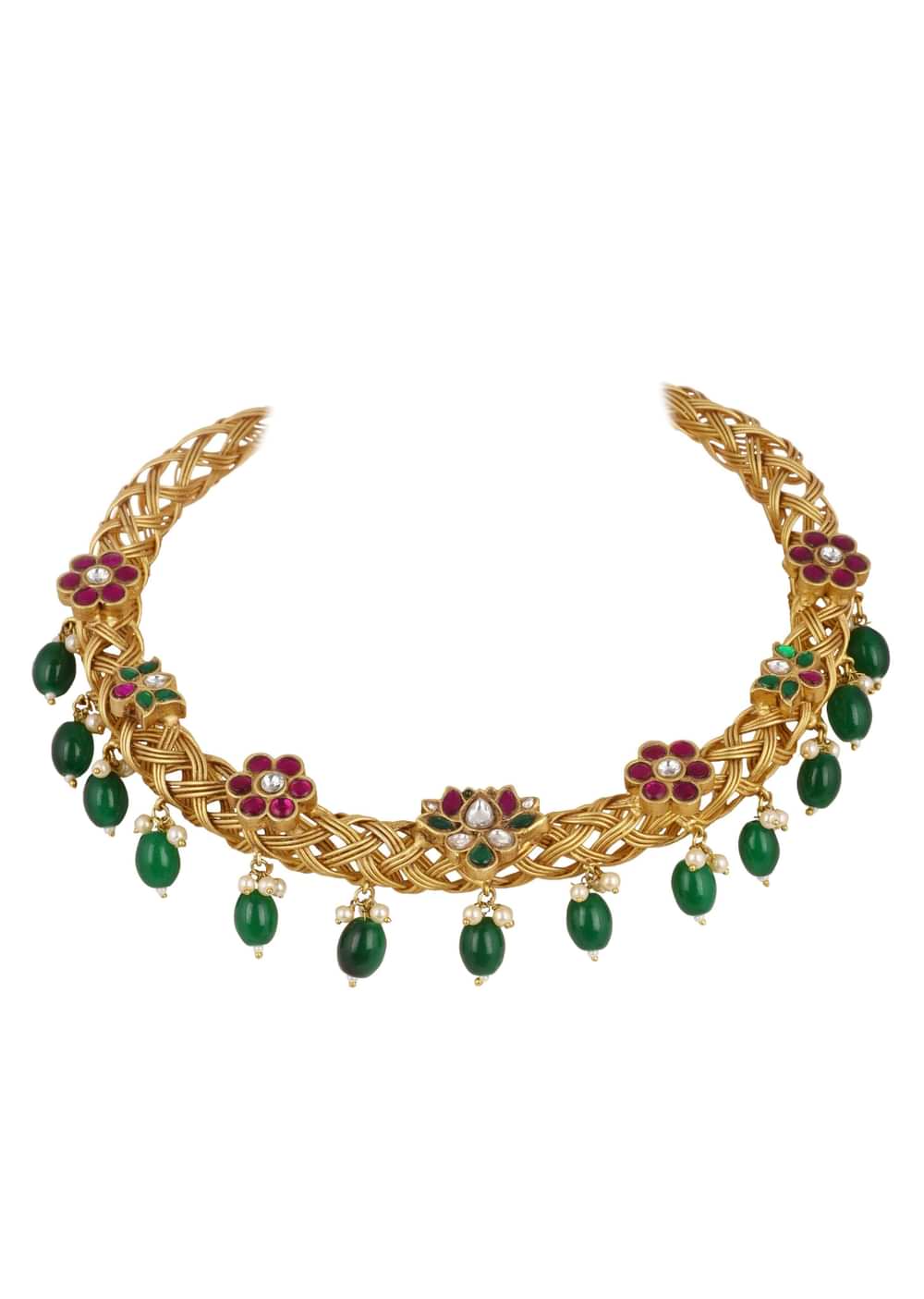 Green Meenakari Choker Necklace In Gold Finish With Pearls