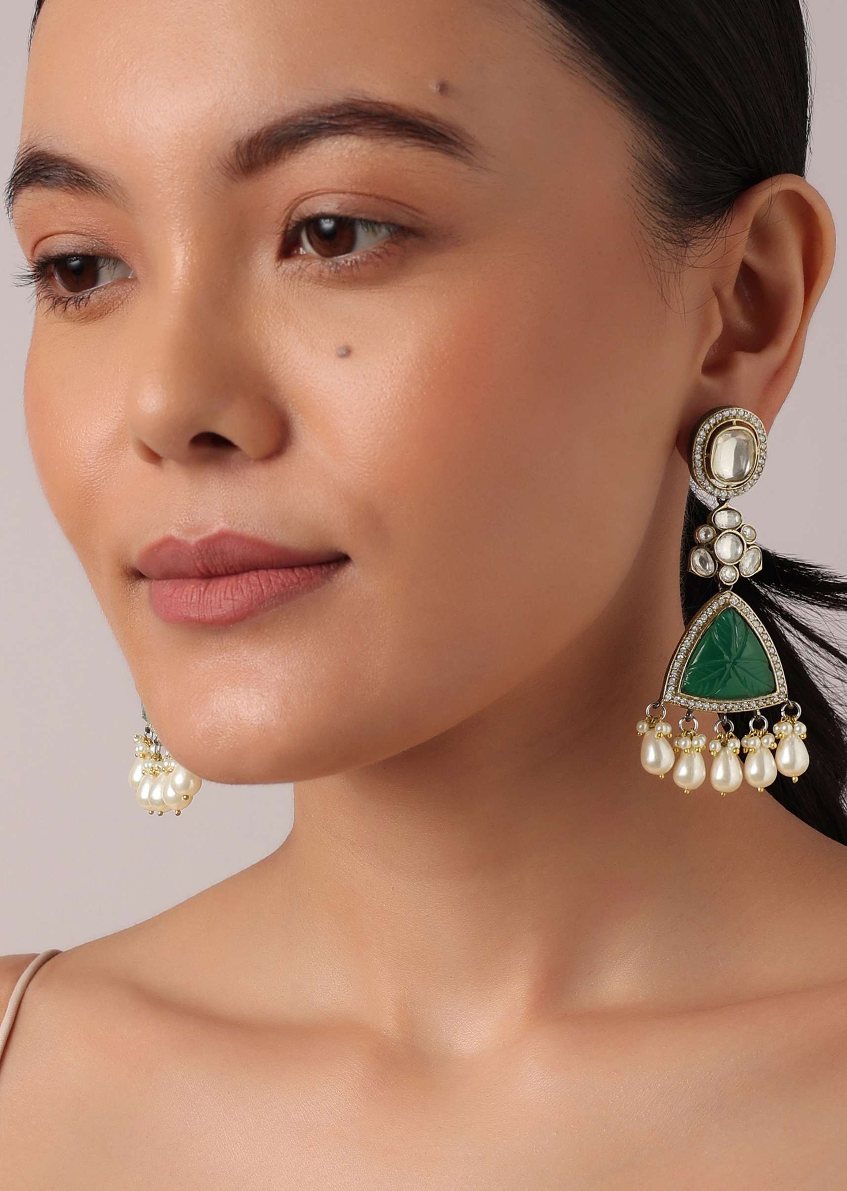 Green Mossainte Polki Danglers With Carved Stones And Pearls
