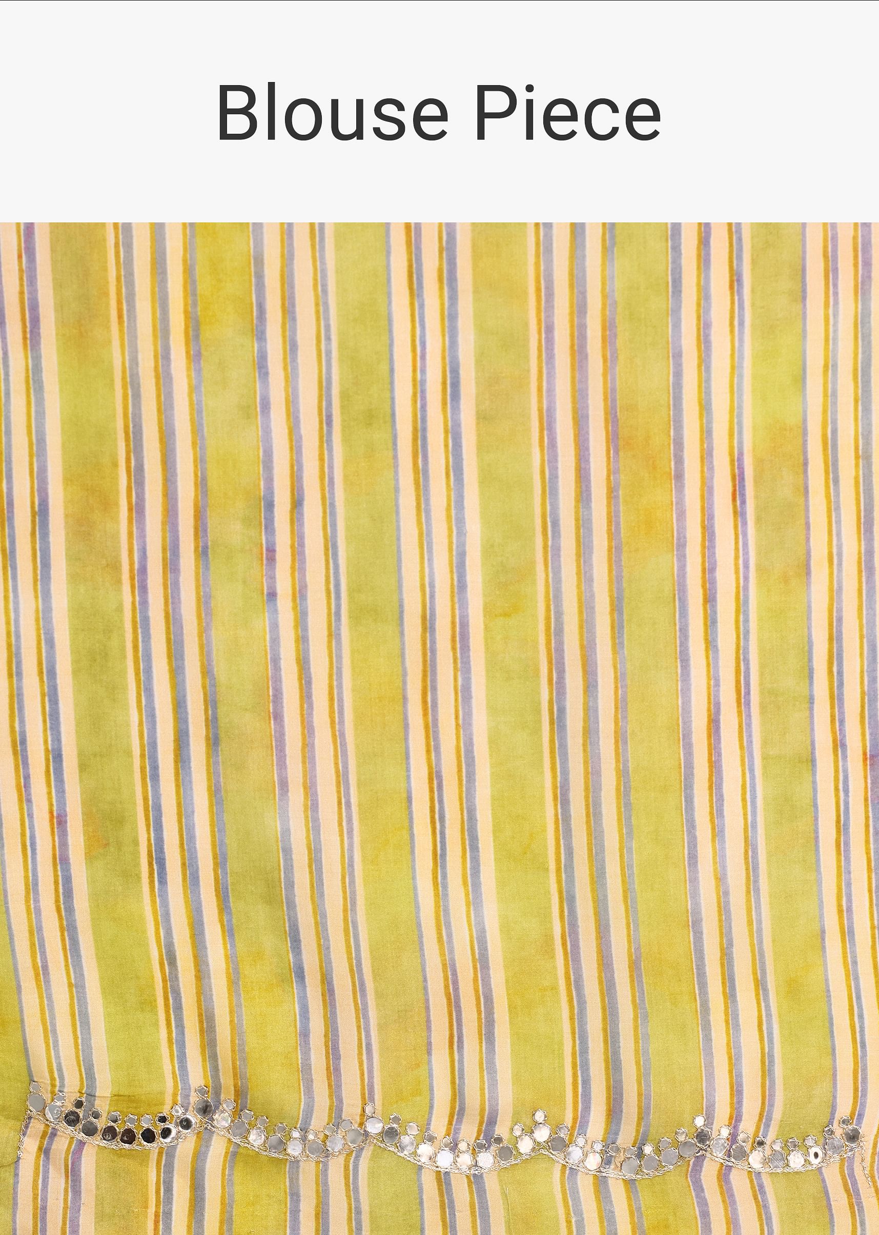 Dive deep into mesmering prints and vibrant hues with this shaded green muslin saree. Adorned with glistening mirror work on the border it is elevated with exquisite printed motifs. A stunning addition for colorful and joyous festivities this saree exudes elegance while keeping you comfortable. The unstitched blouse allows for custom tailoring and embracing your style. Awarded As The Most Trusted Brand We'Re Delivering Styles You Love Just As Promised.