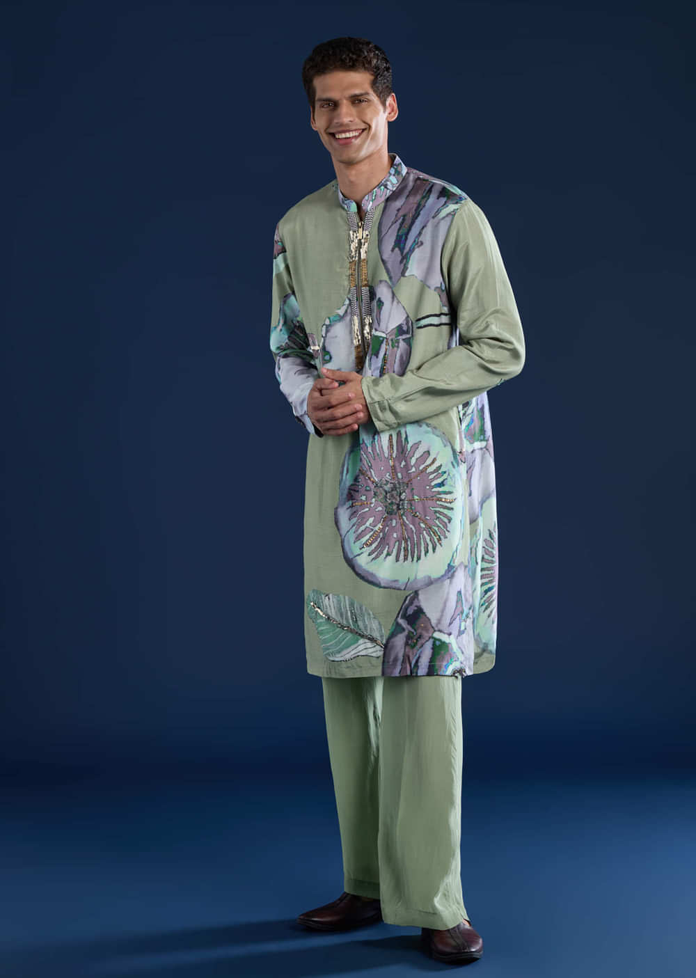 Green Muslin Sequin Work Mens Kurta and Pant Set