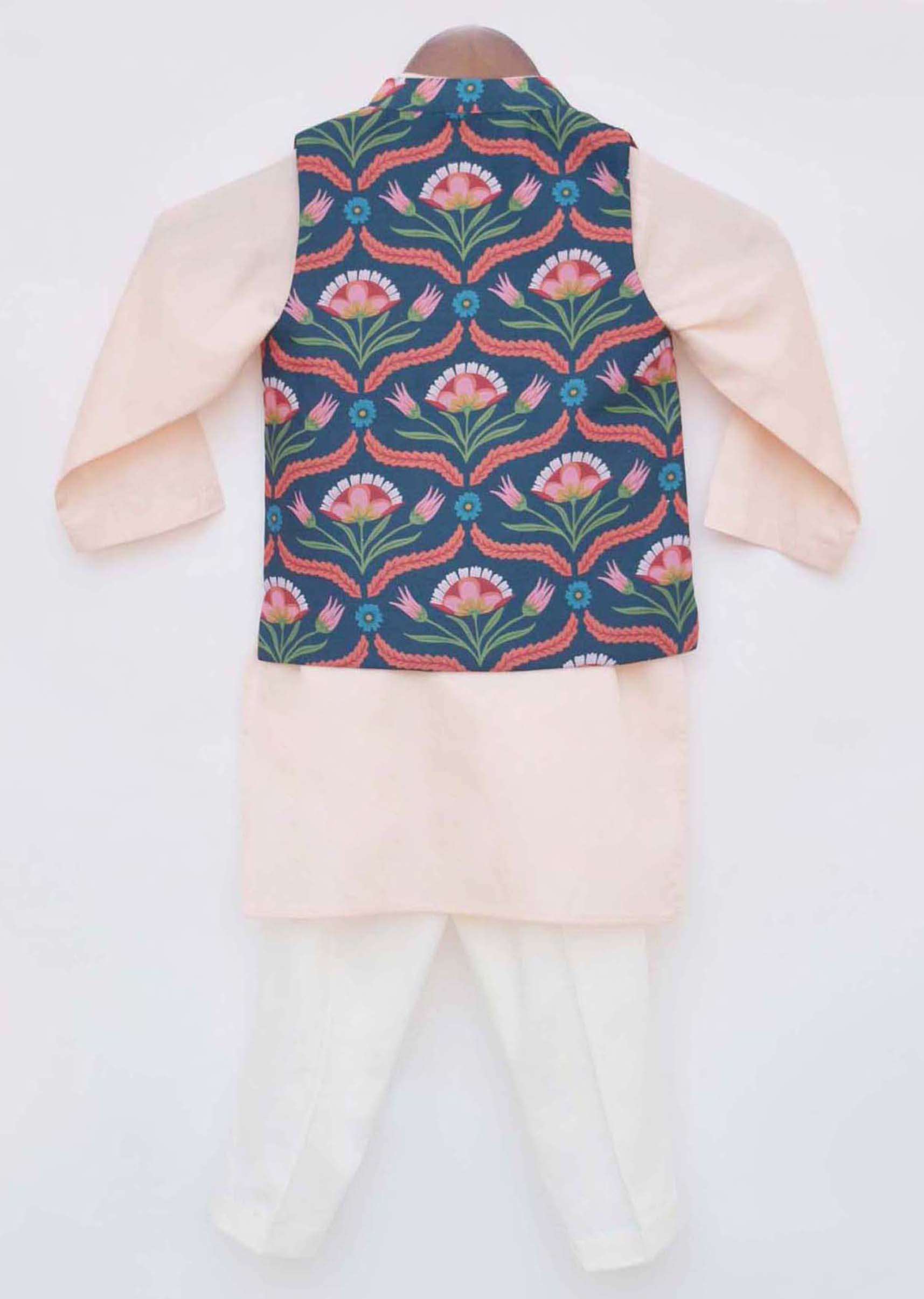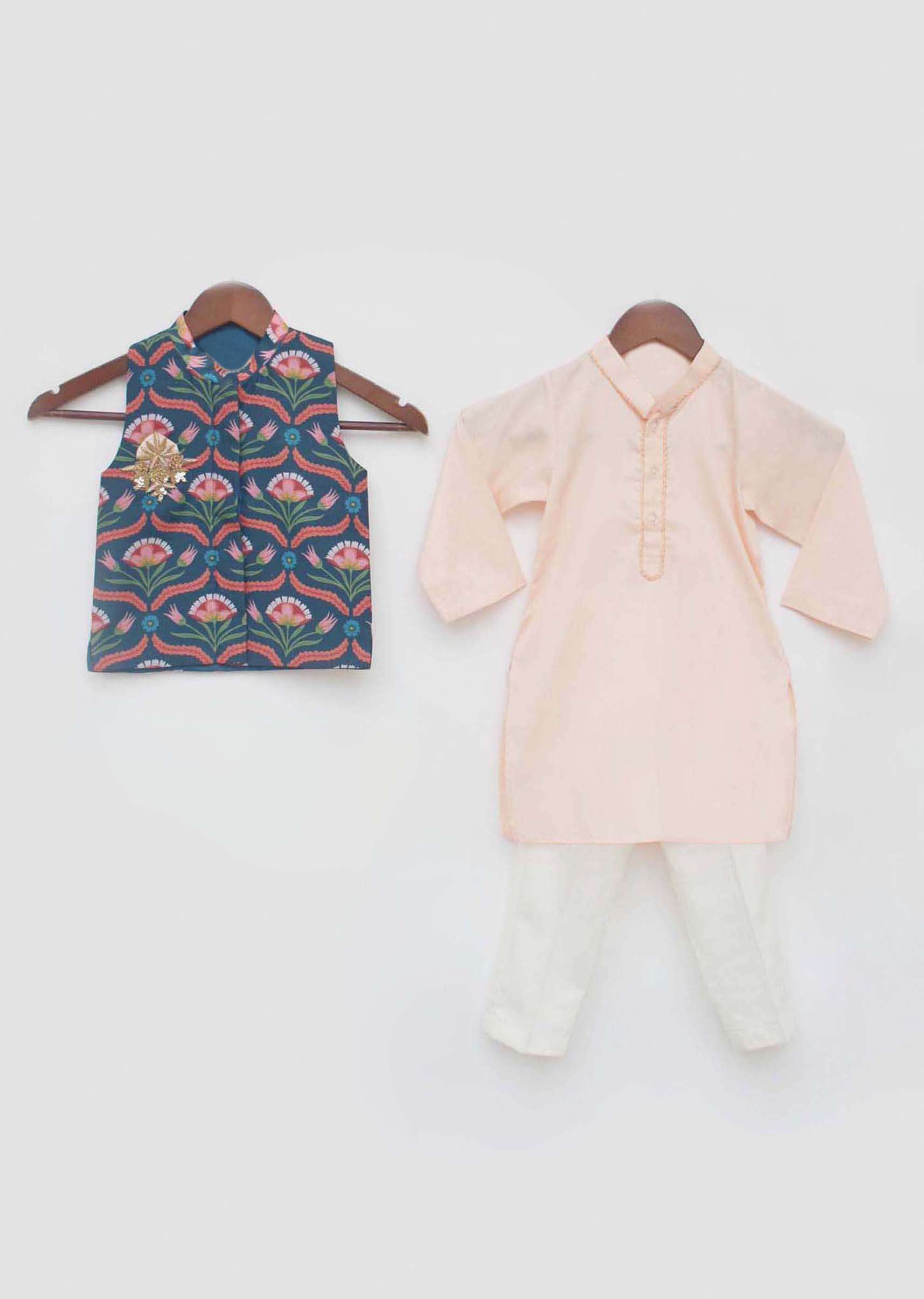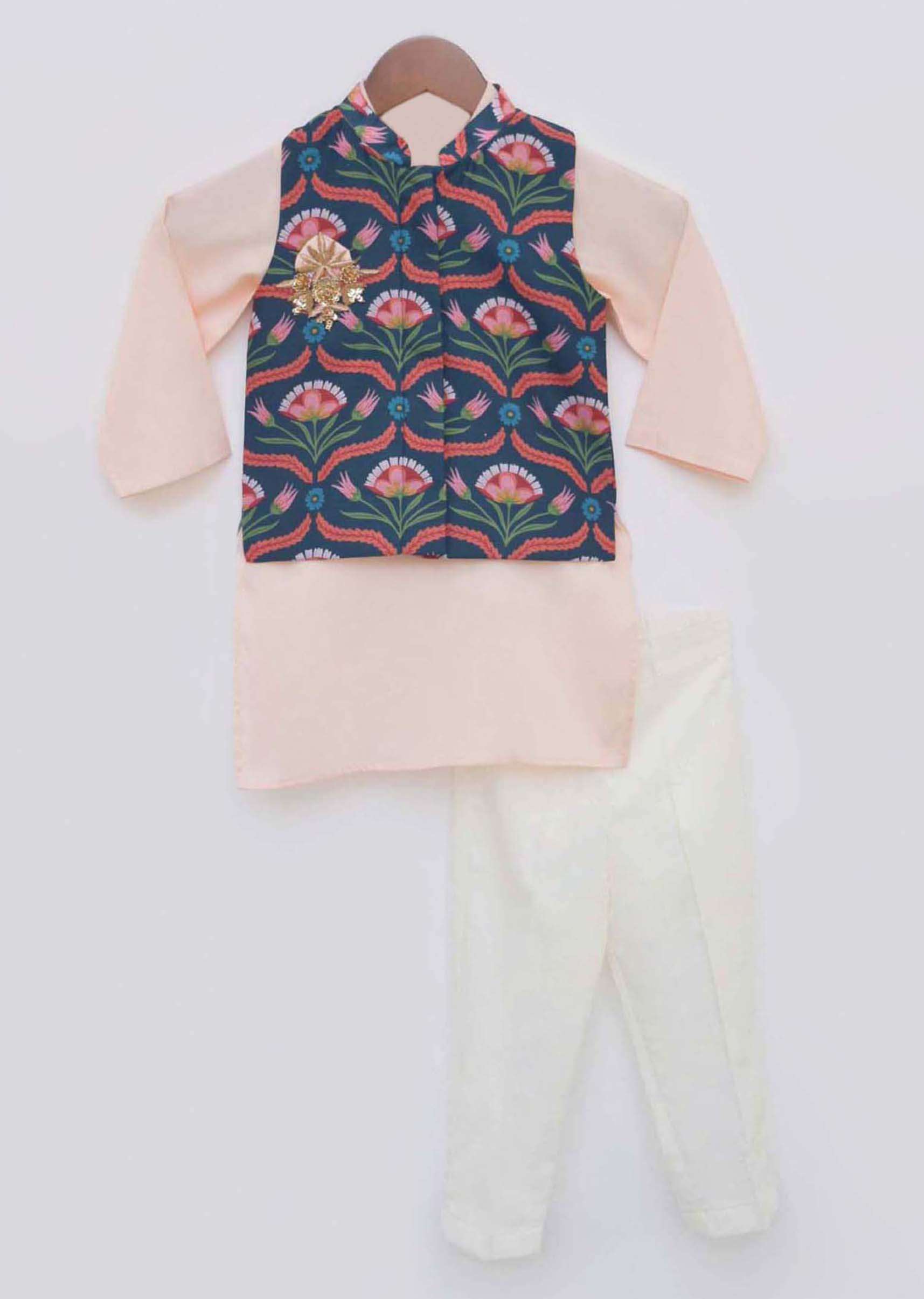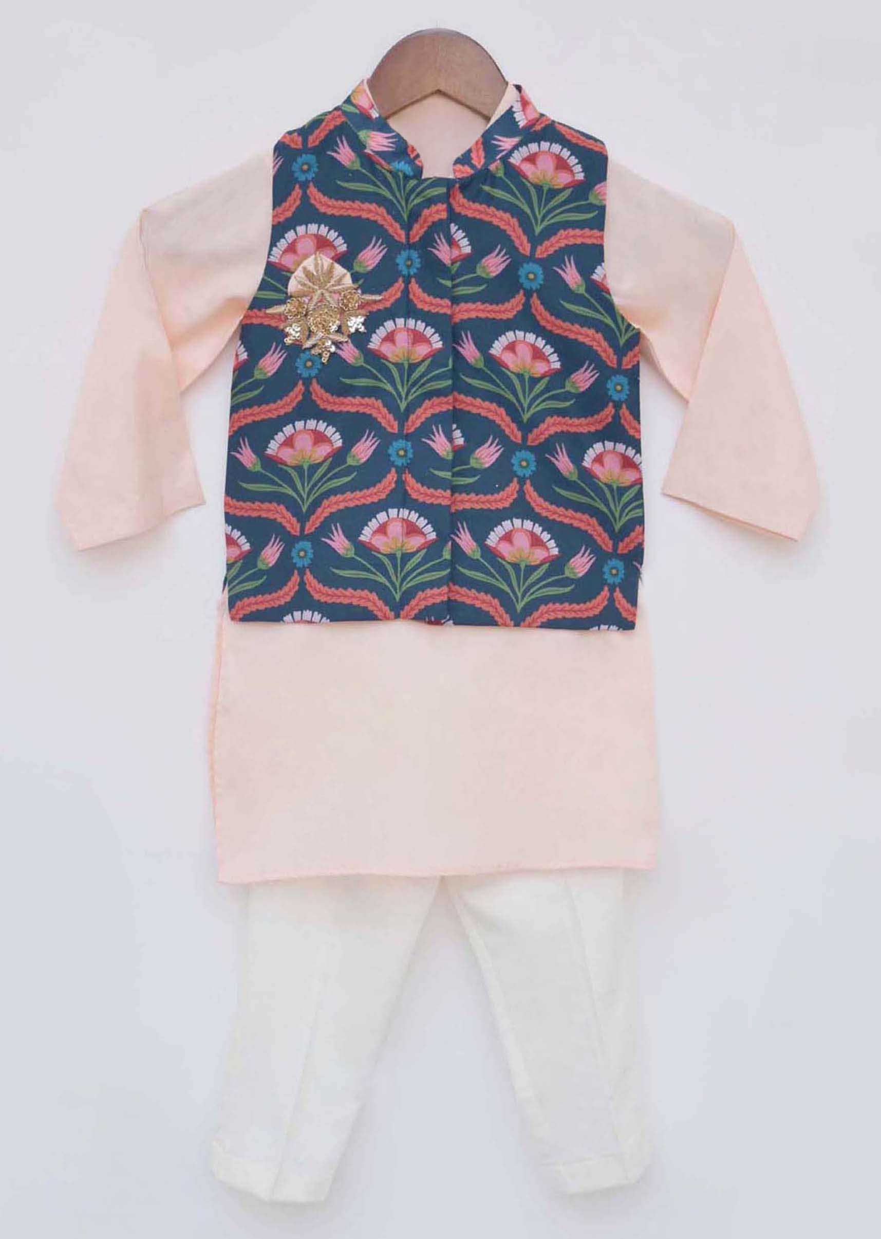 Prints, patterns and designs; we can just never get enough of them and never goes out of fashion. Let your champs be the most stylish one and wear this super smart and stylish Green floral printed jacket along with motif on the pocket with peach kurta and pant set. The colour combination is here with this beautiful green and peach. Awarded as the Most Trusted Brand, we're delivering styles you love, just as promised.