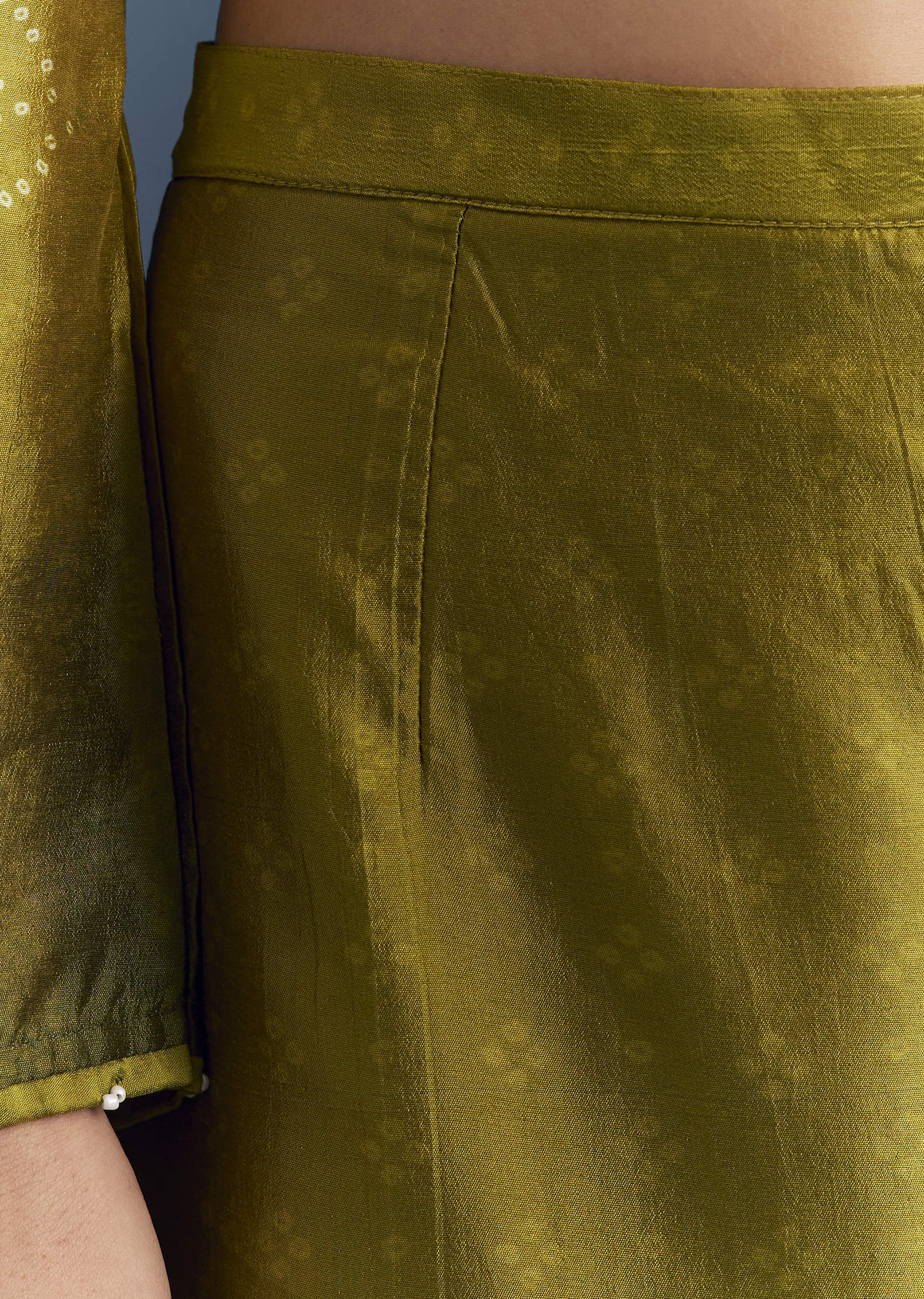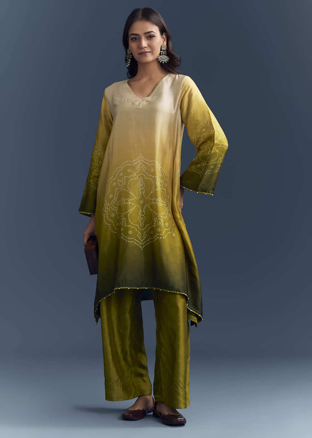 Green Ombre Satin Bandhani Co Ord Set With Moti Work