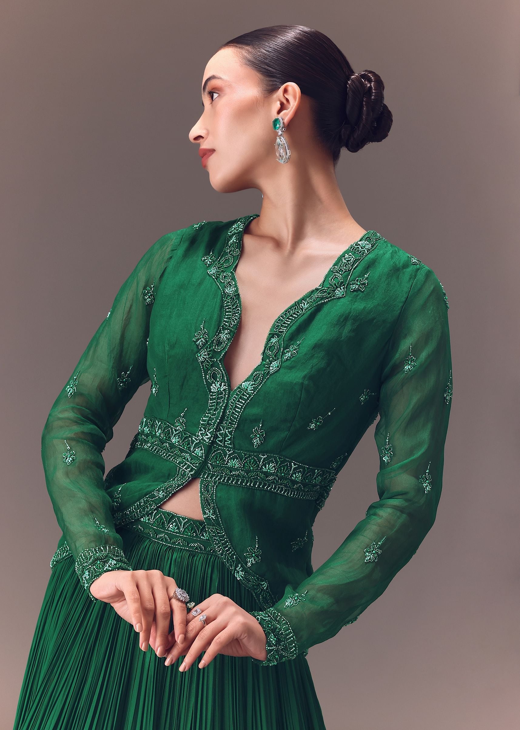 Green Organza Ruched Lehenga With Hand Embellished Jacket