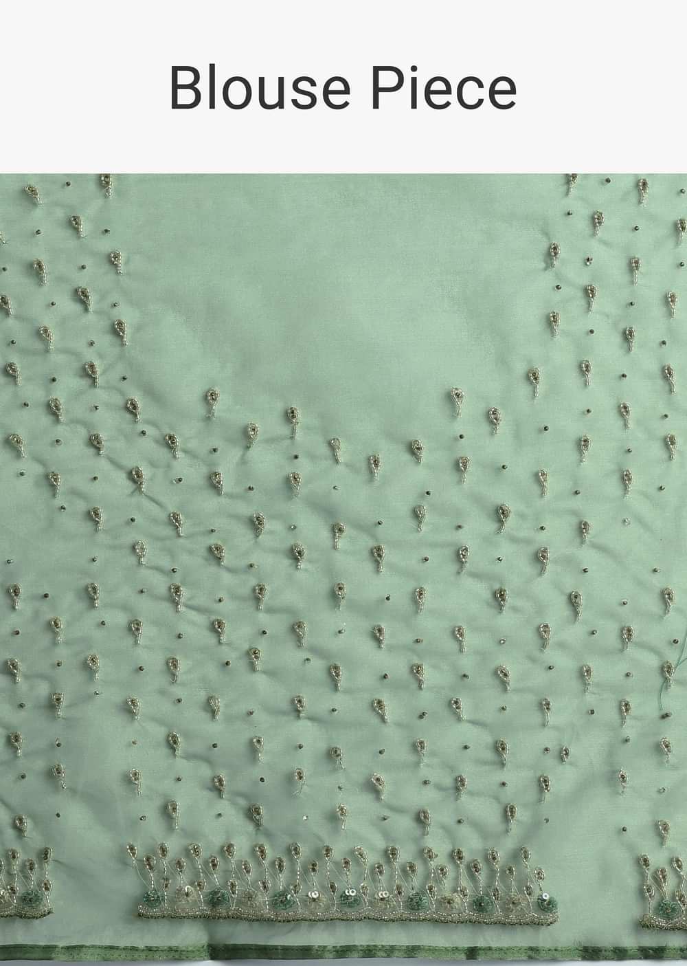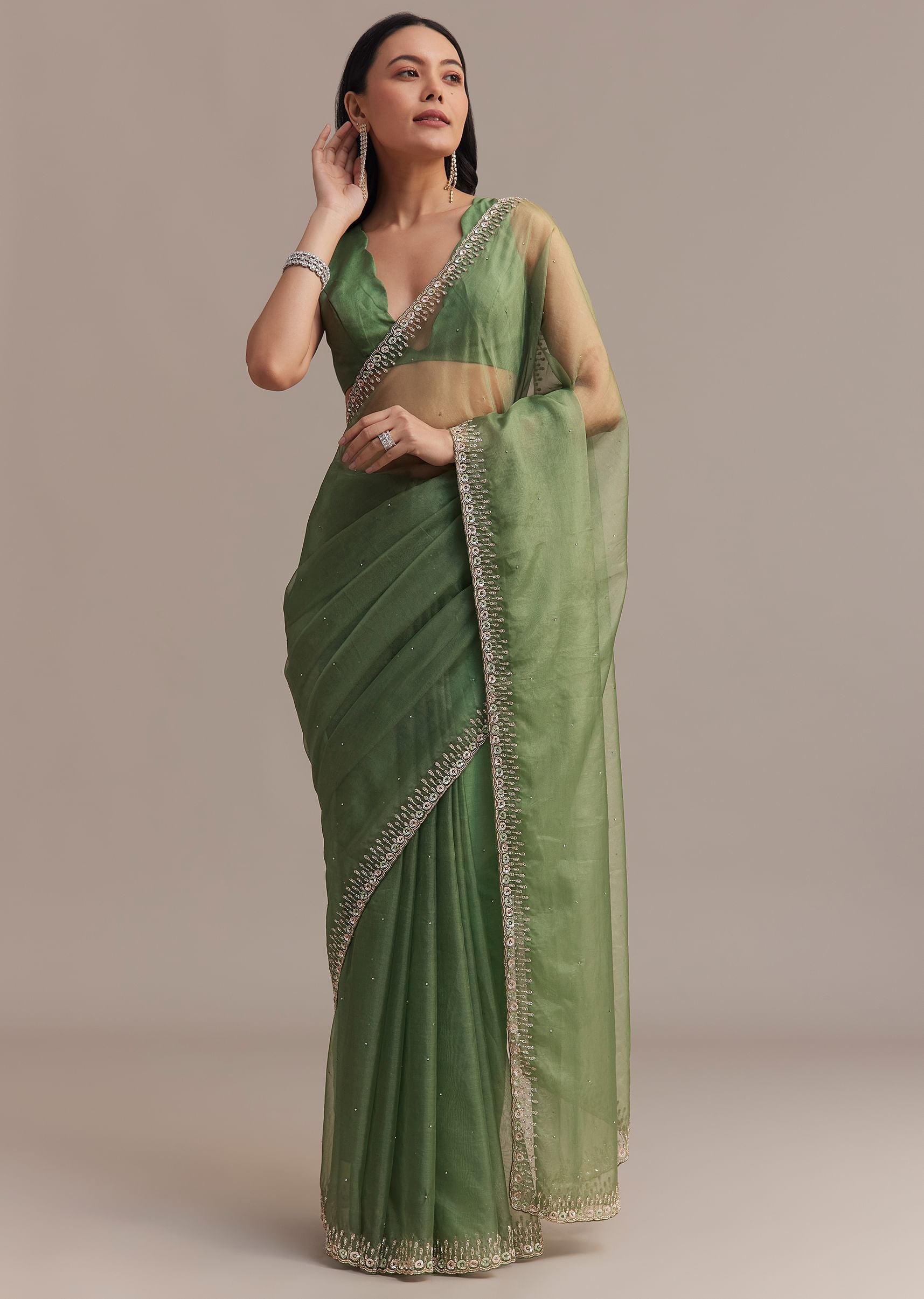 - A Vision Of Grace This Green Organza Saree Shimmers With Delicate Sequin And Cutdana Embellishments Along Its Border.