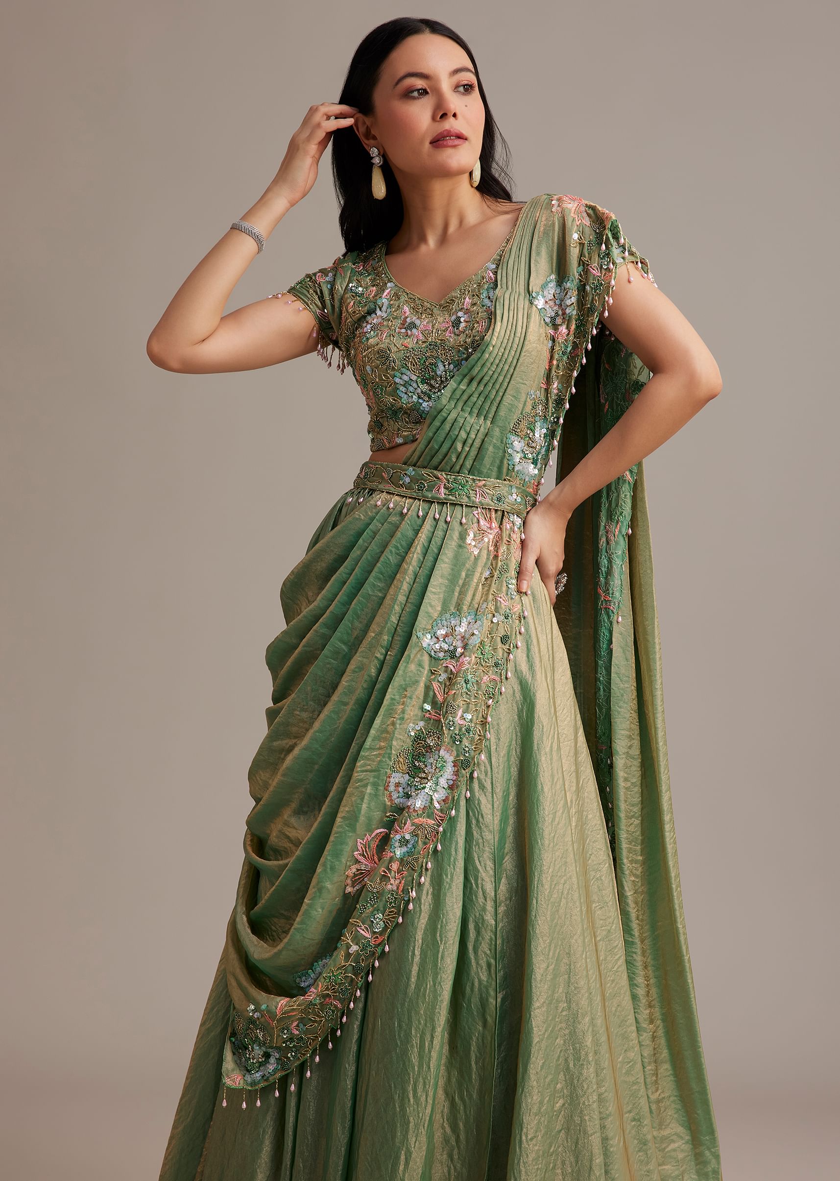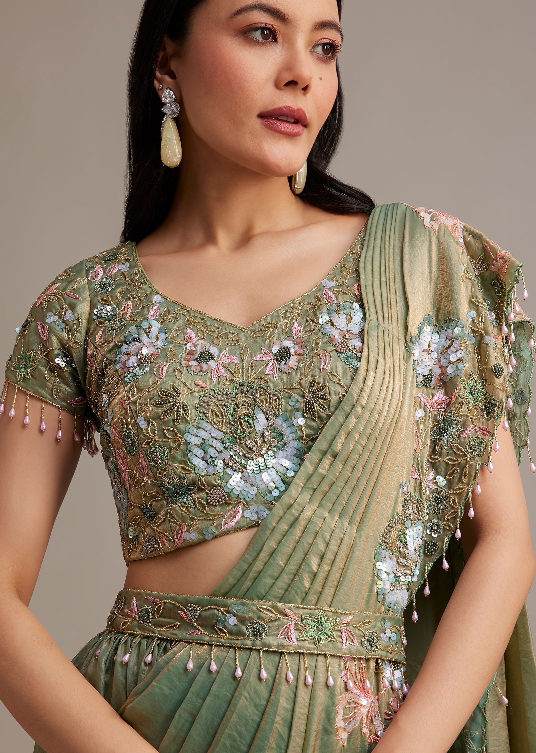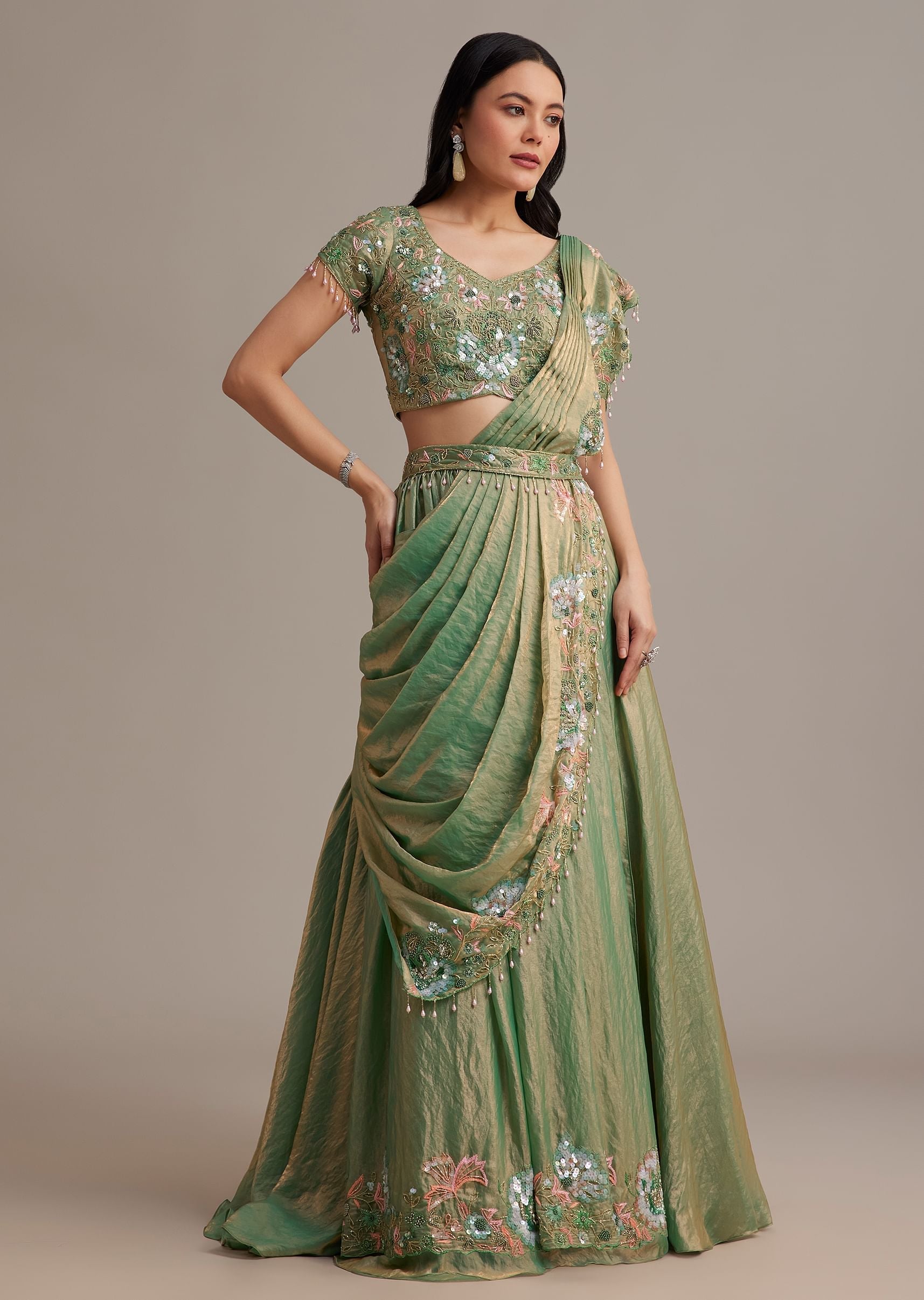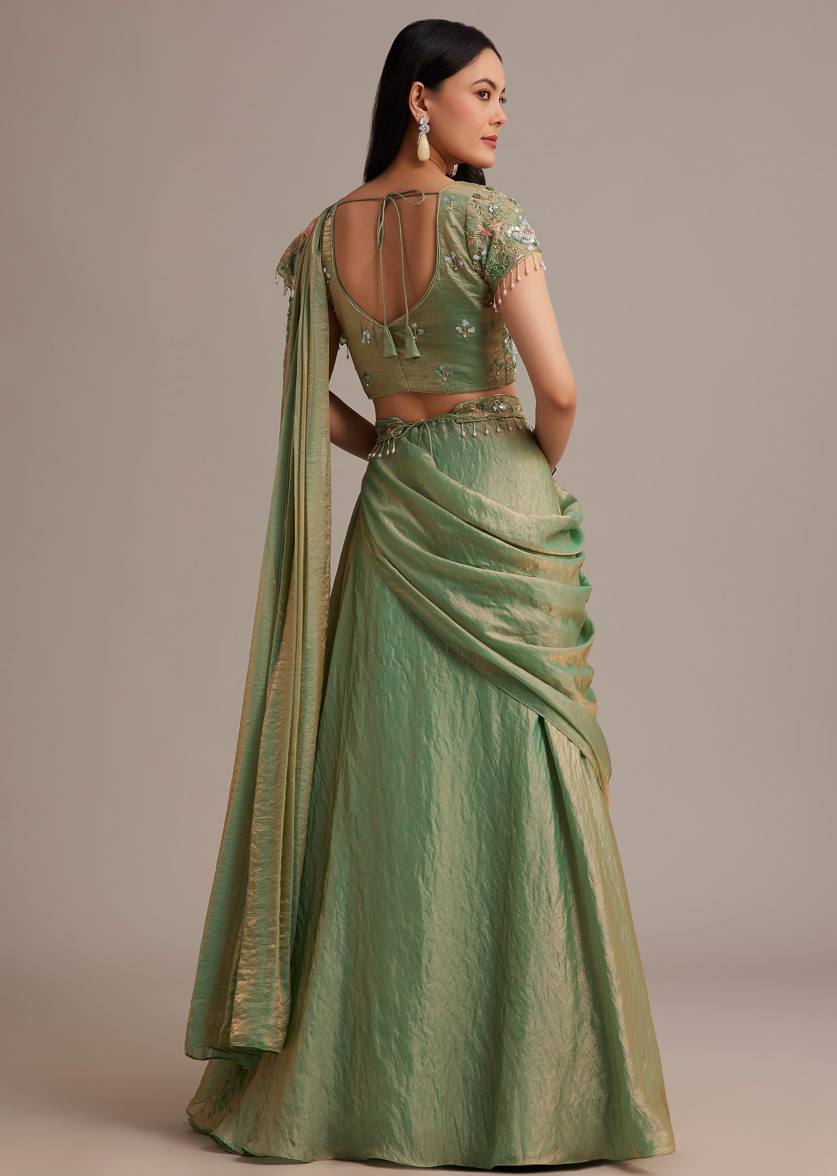 Green Organza Tissue Lehenga Set With Sequins And Bead Work