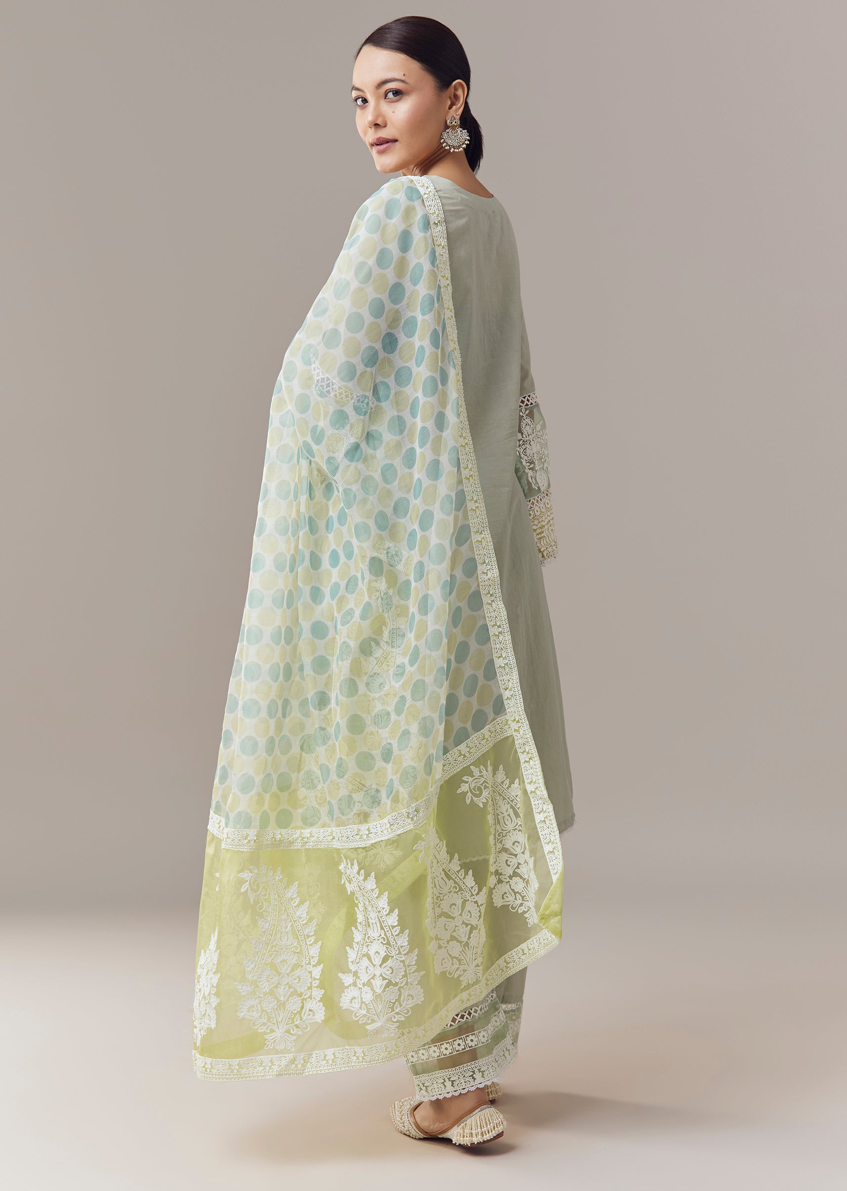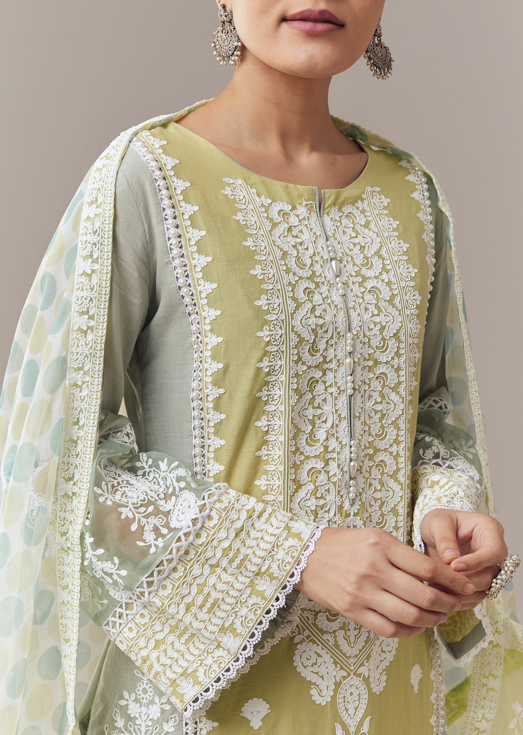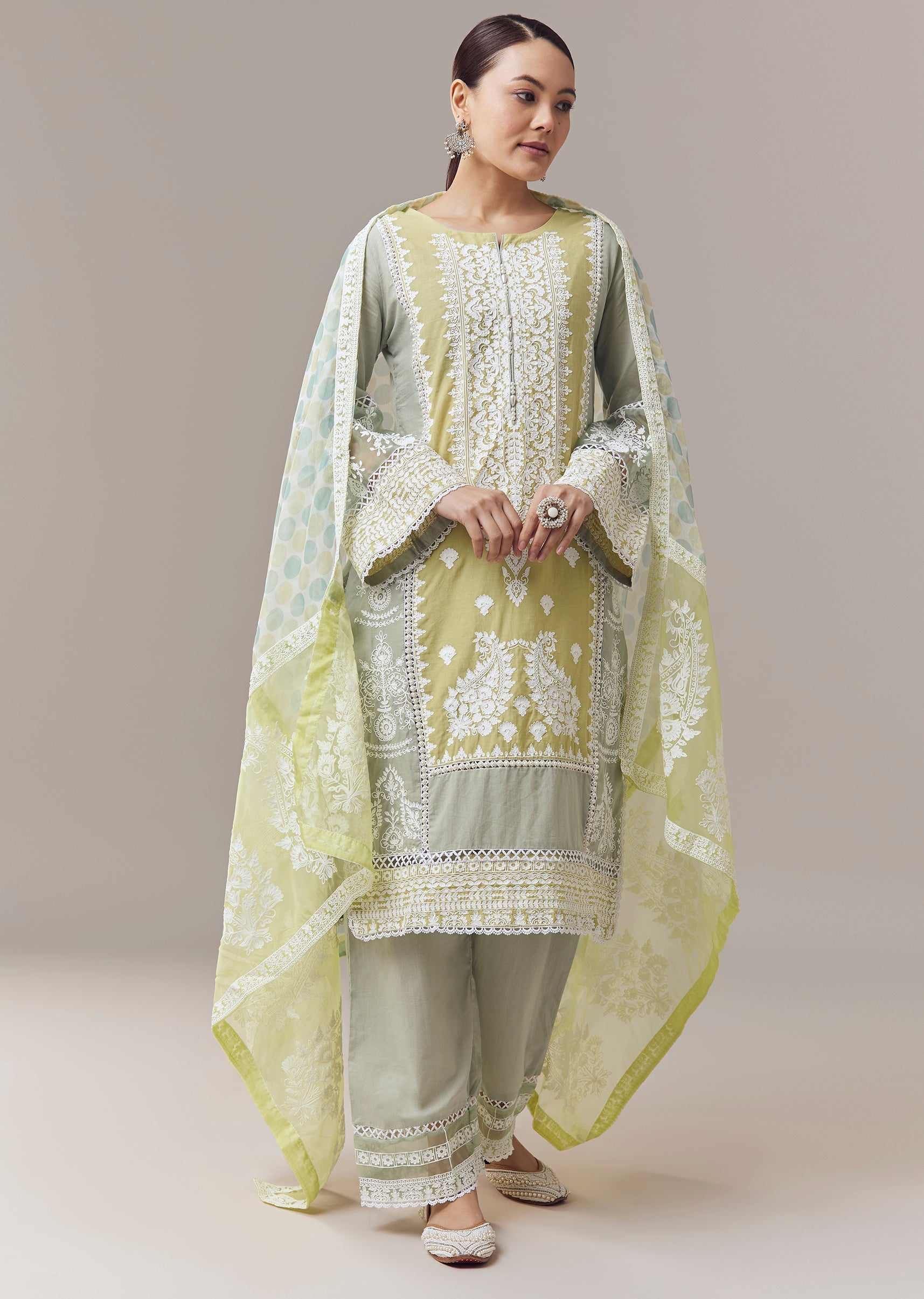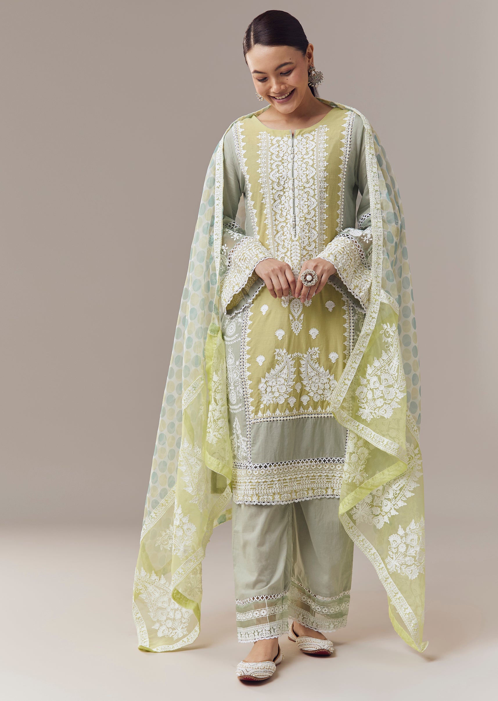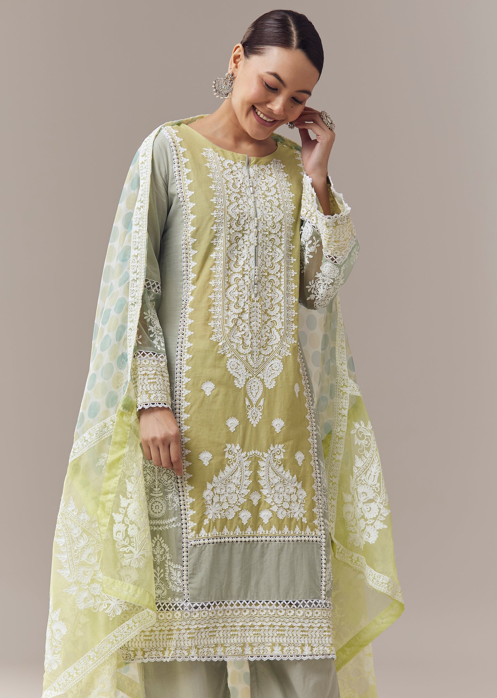 Designed with a refined and elegant sensibility, this green kurta set draws inspiration from Pakistani aesthetics in a soft pastel palette. The kurta is enhanced with delicate thread work that... More Product Details