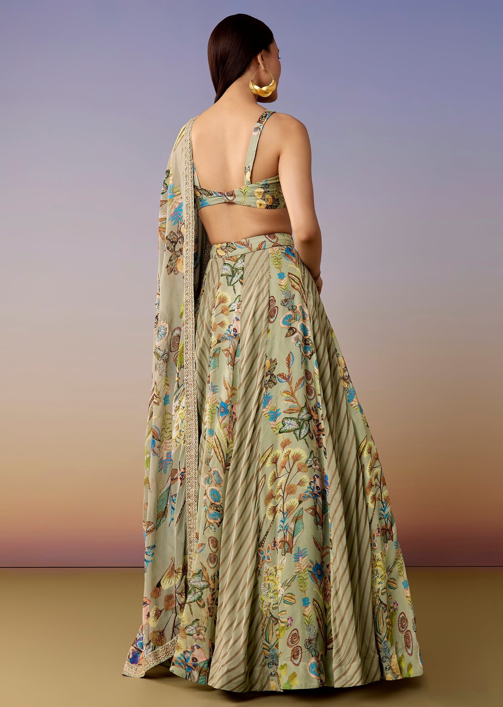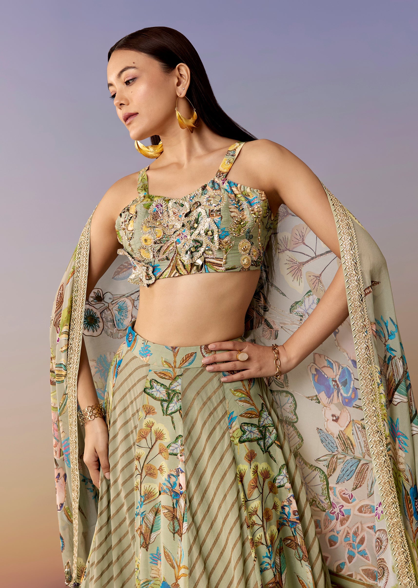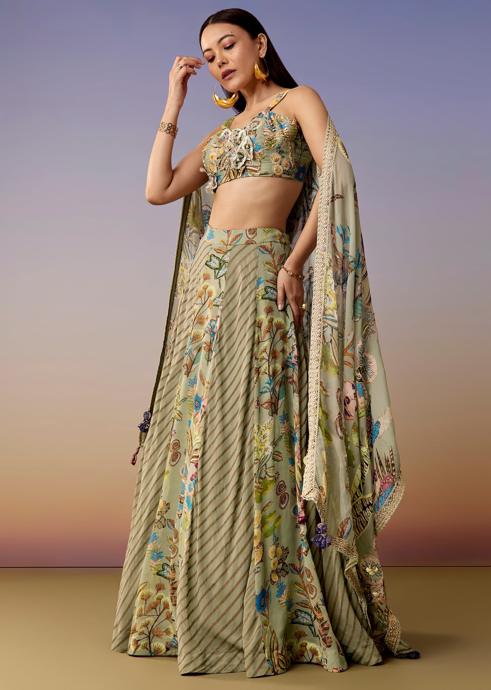 A pastel-multi printed lehenga set featuring a sweetheart choli with gotta lace work, paired with a flared printed lehenga and dupatta. A light, festive choice for haldi, mehendi, and sangeet.... More Product Details