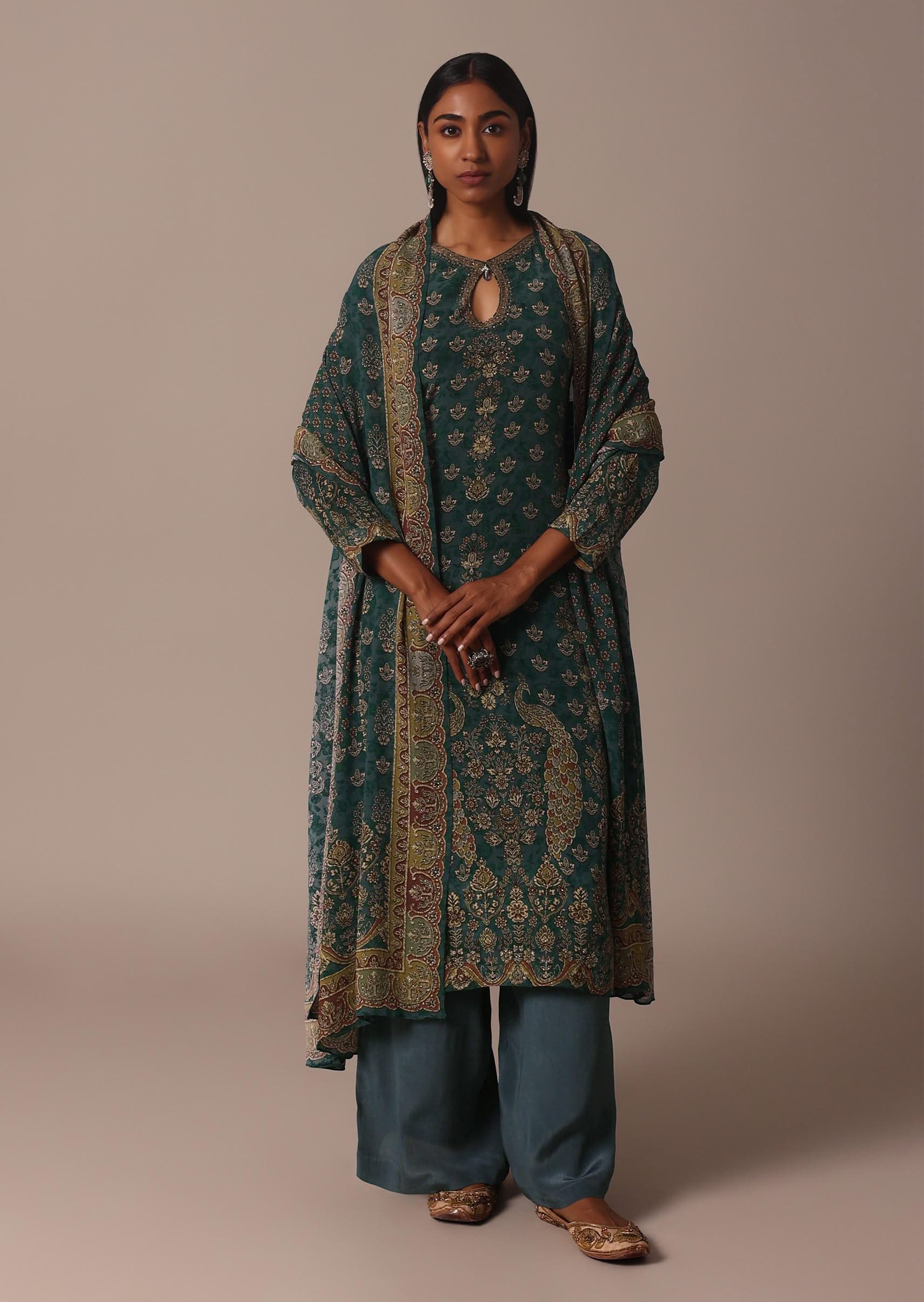 Green Printed Crepe With Stone Work Kurta Palazzo Set