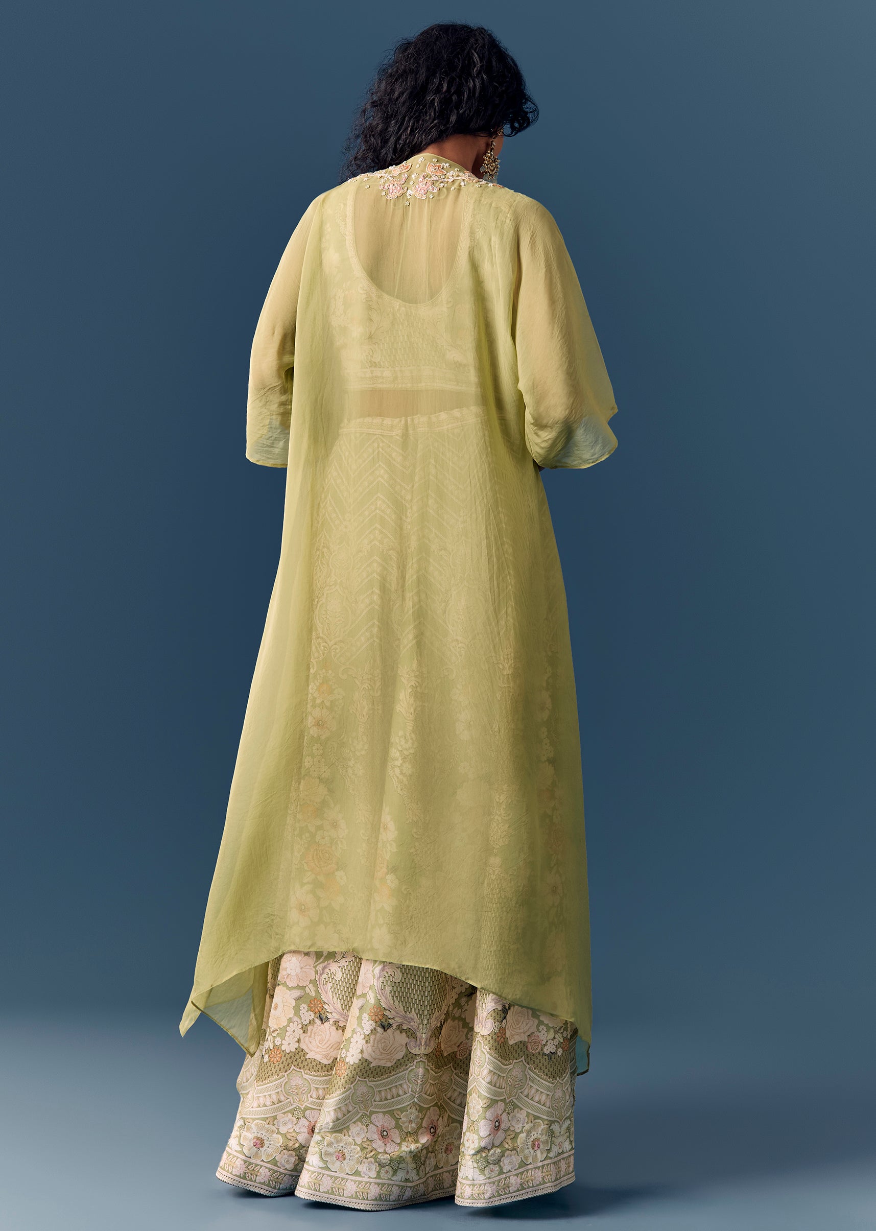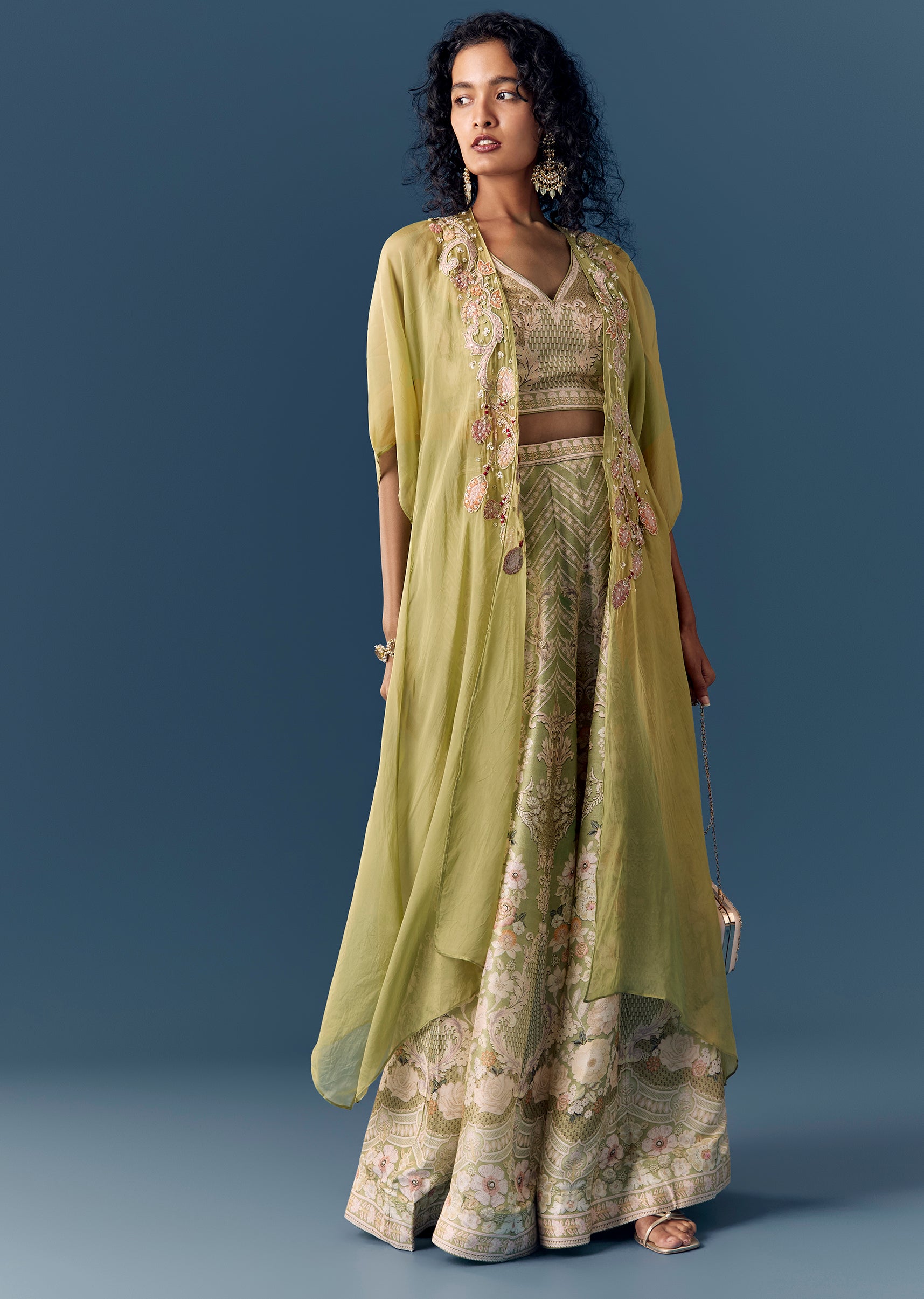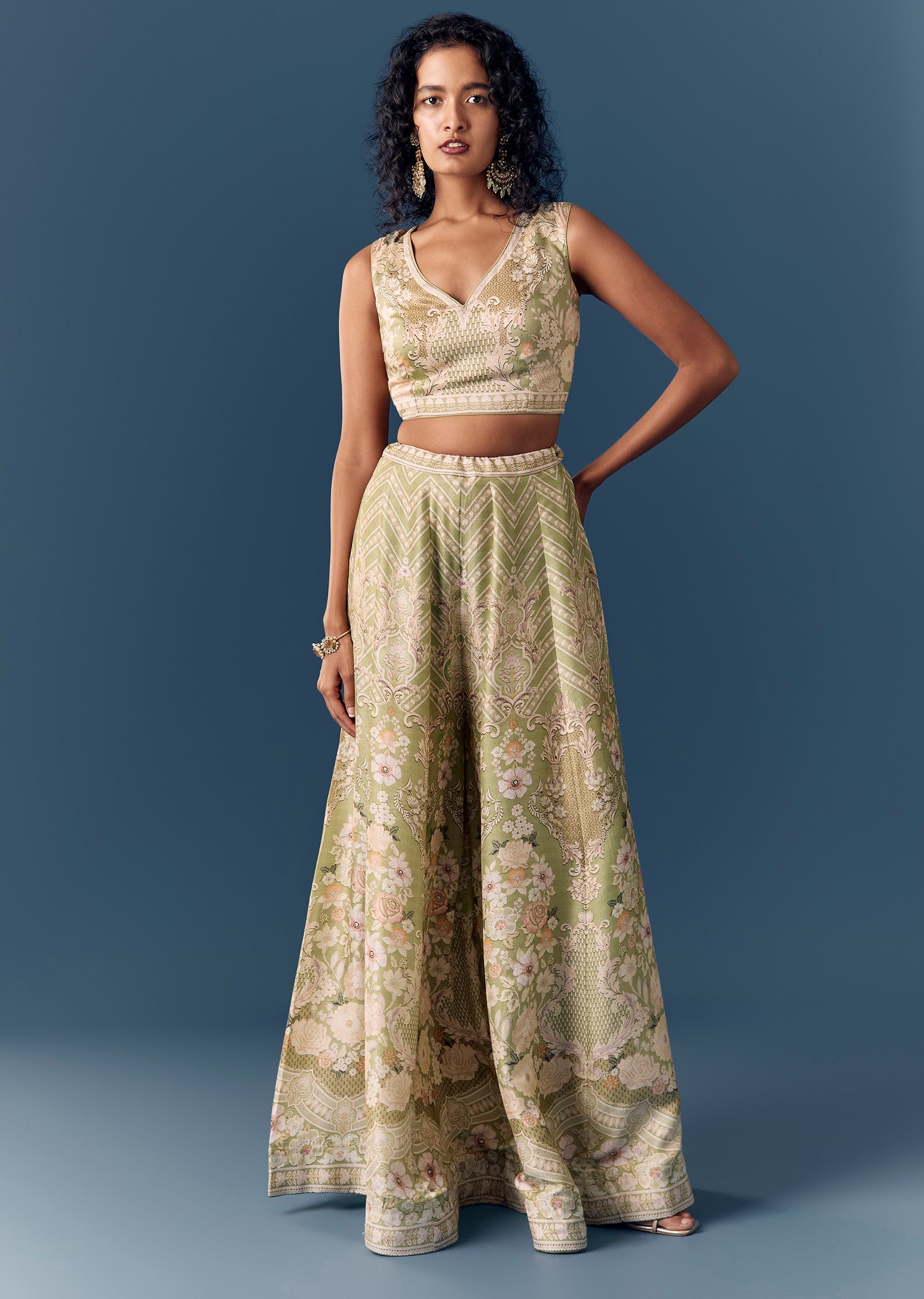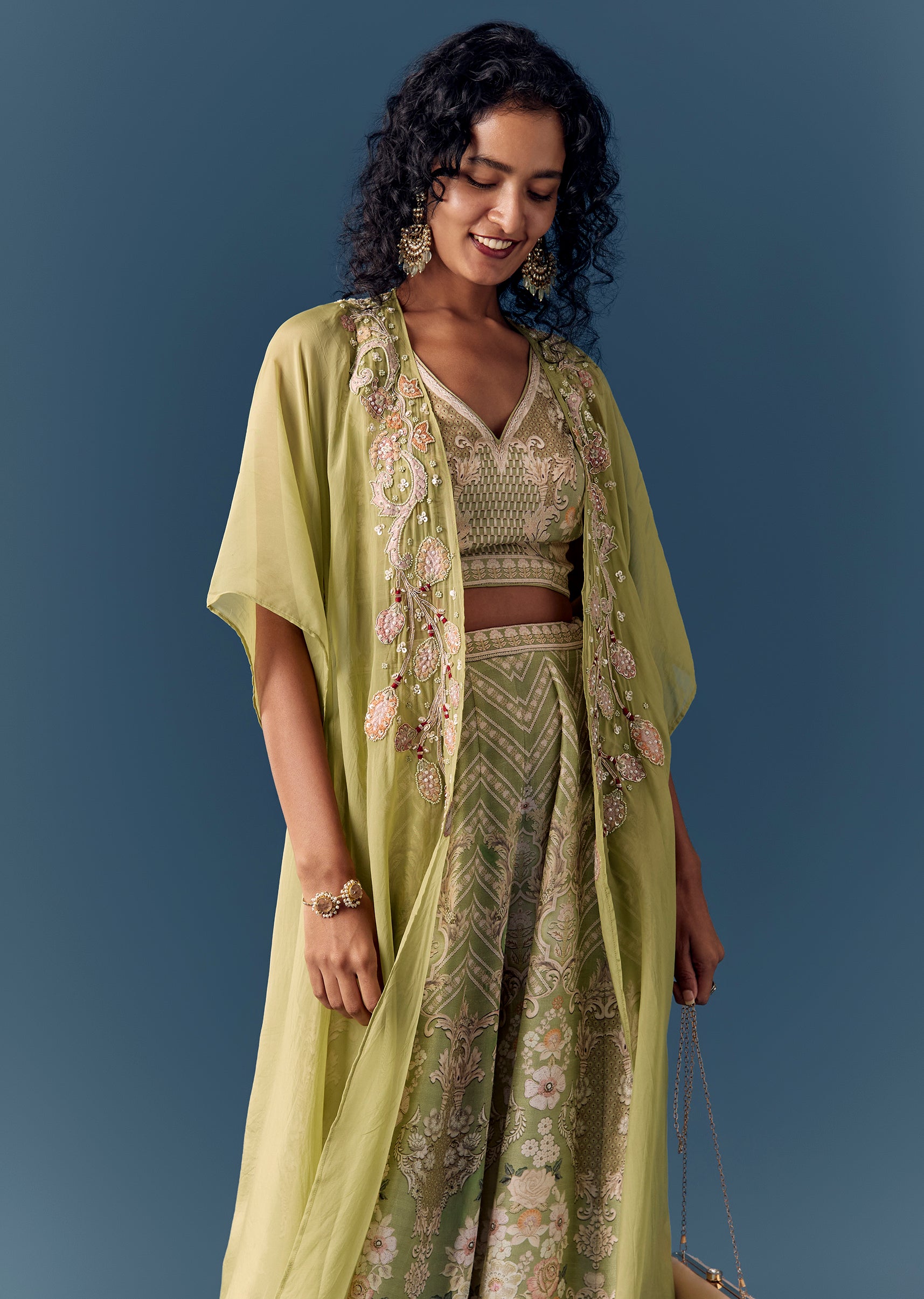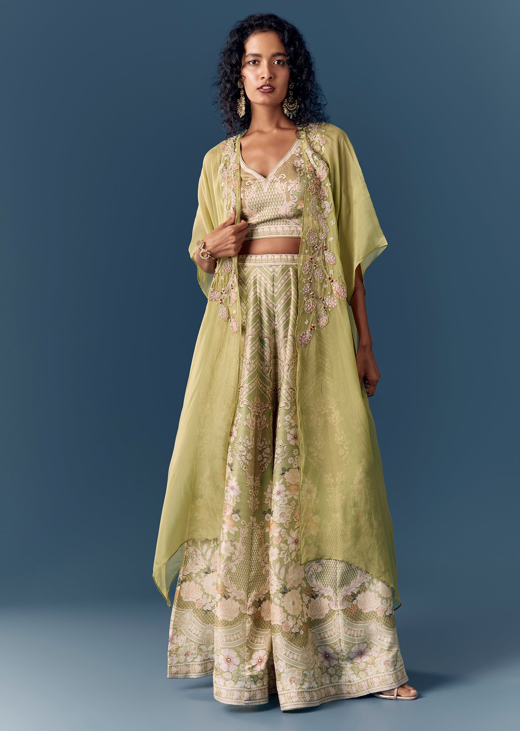 A festive Indo-western set featuring a printed croptop and palazzo with a jacket detailed in thread and beads work. Half sleeves with V-neckline and side zip closure—perfect for mehendi functions... More Product Details