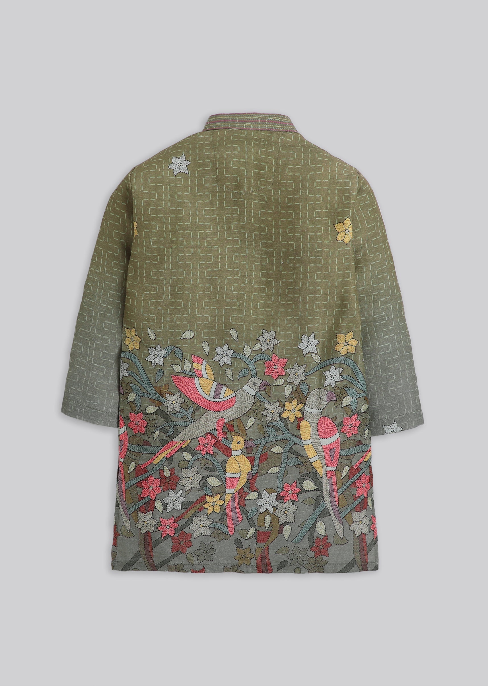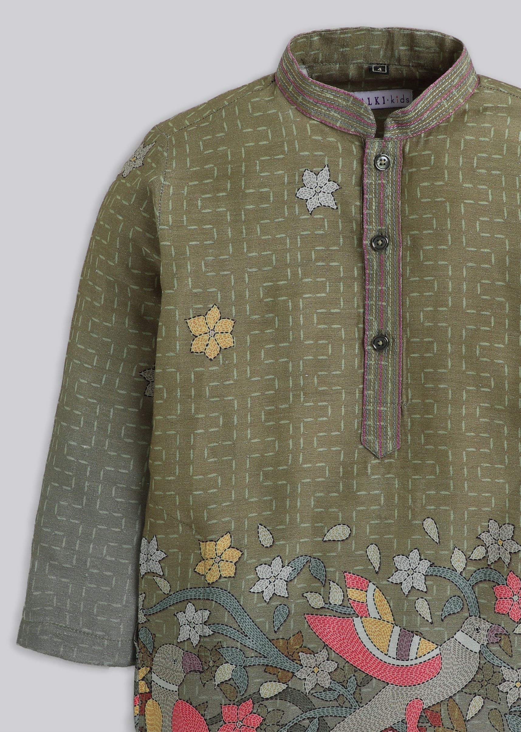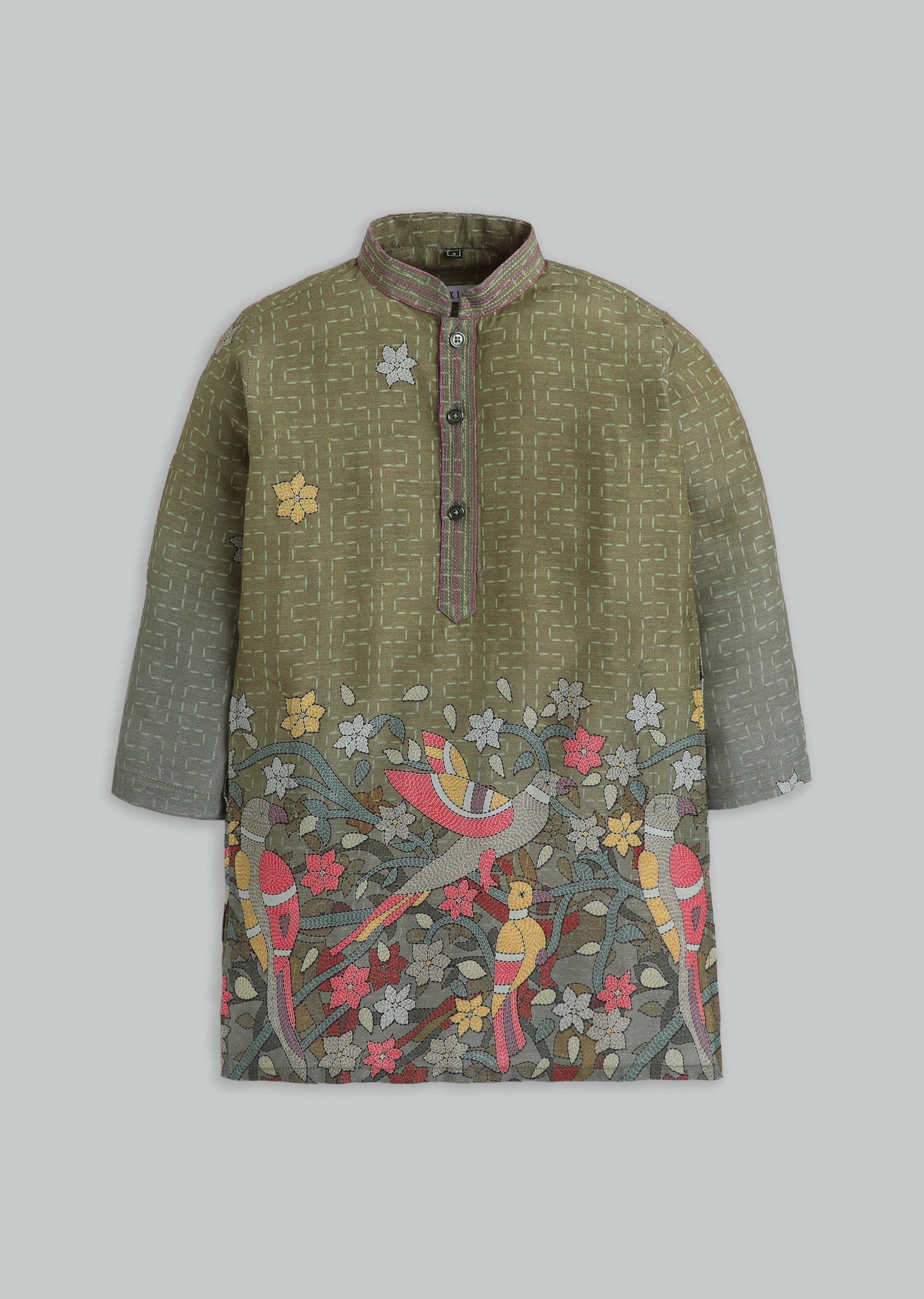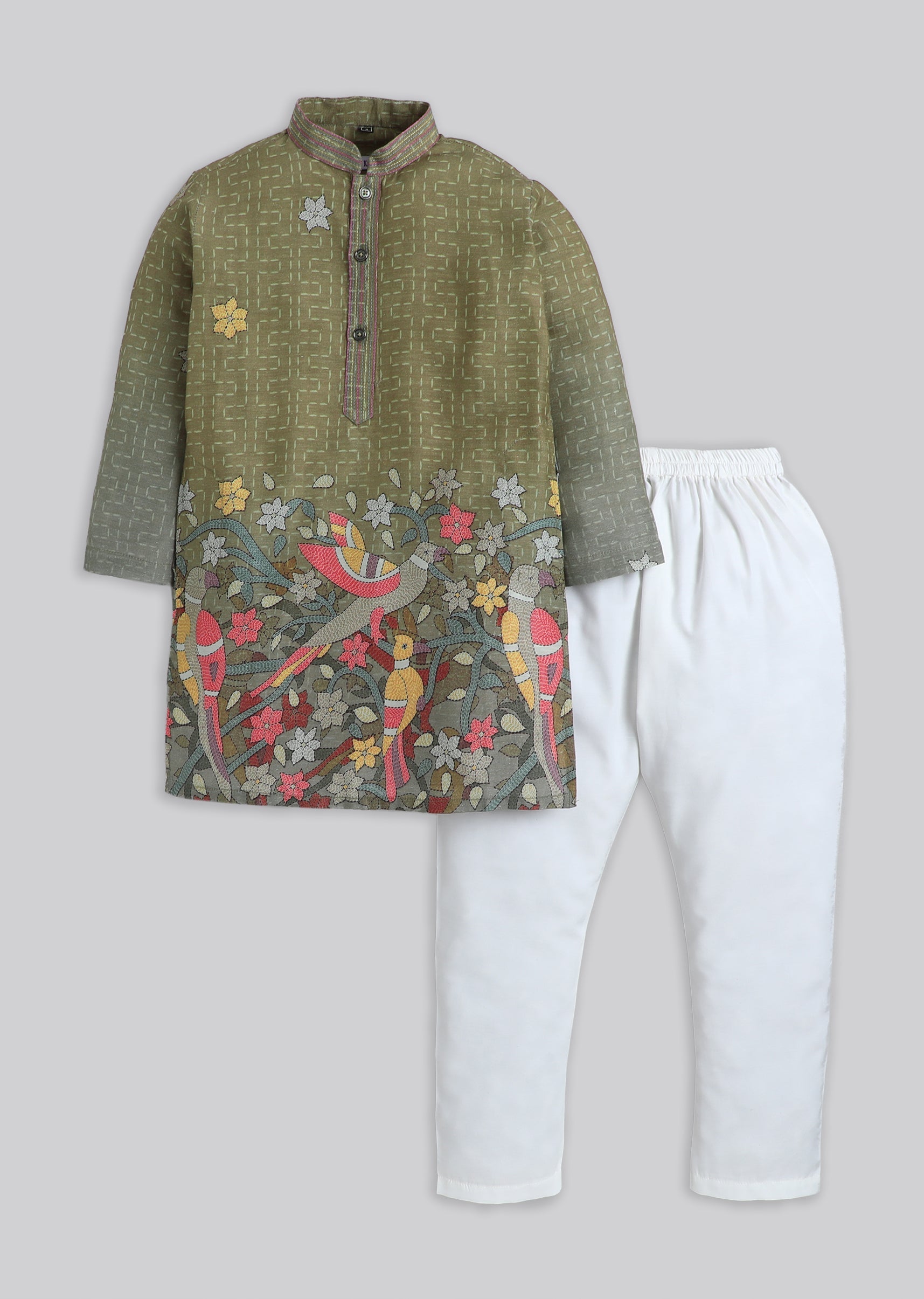 A festive silk kurta set in green with motif-floral print detailing, styled with a mandarin collar, 3/4th sleeves and front buttons. Paired with matching pants for celebration-ready dressing. Awarded as... More Product Details