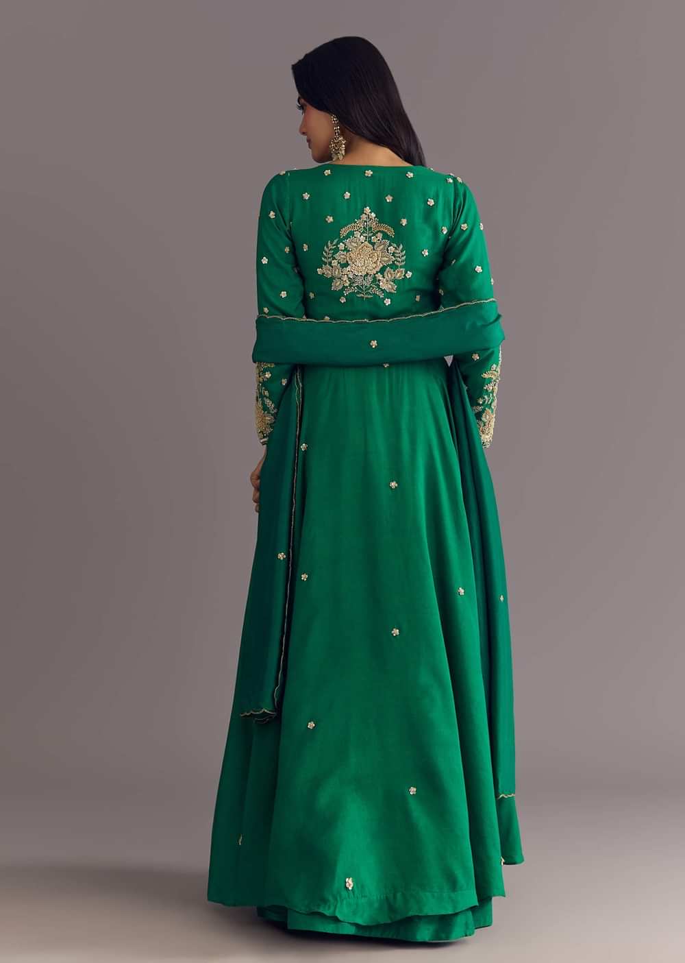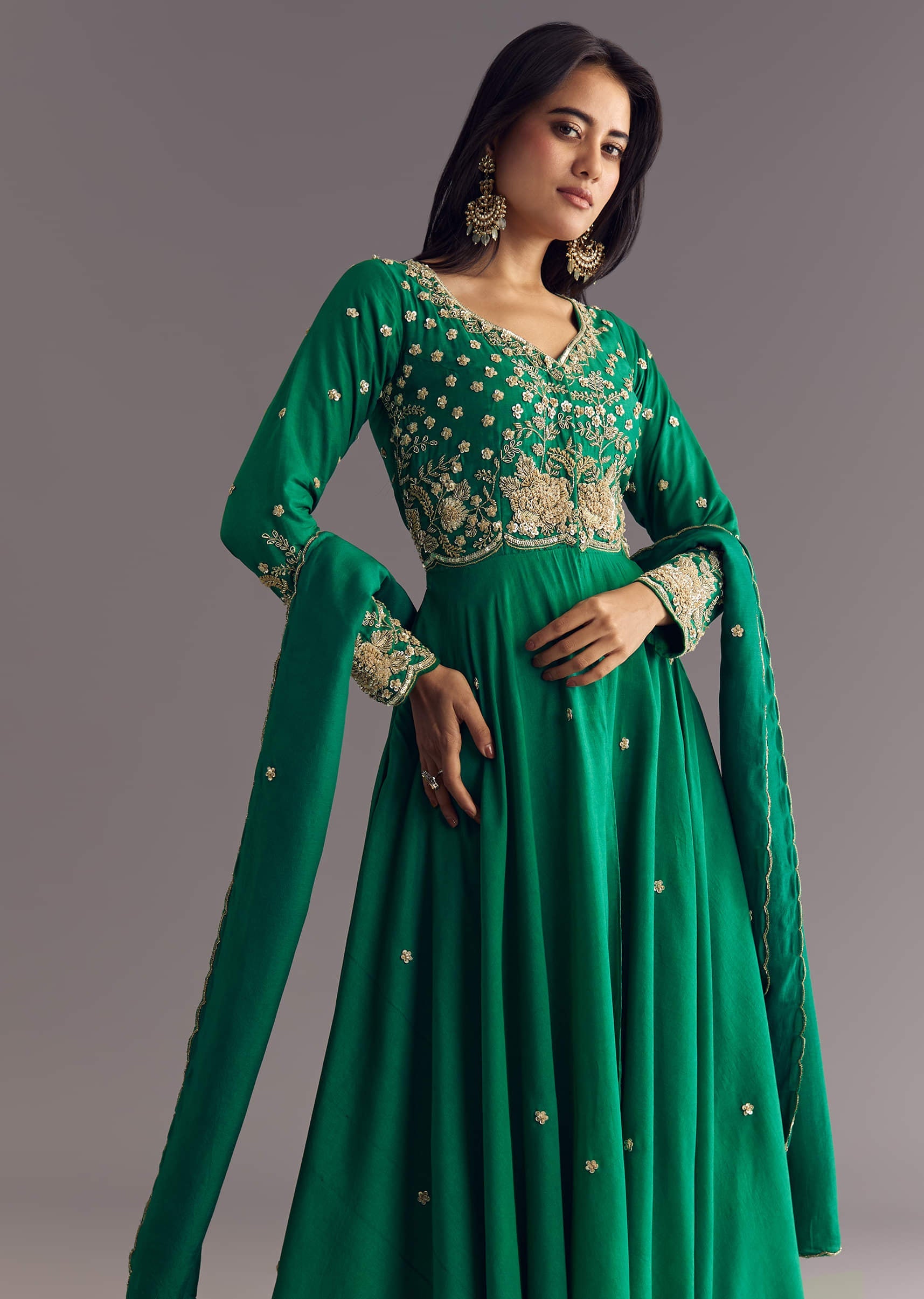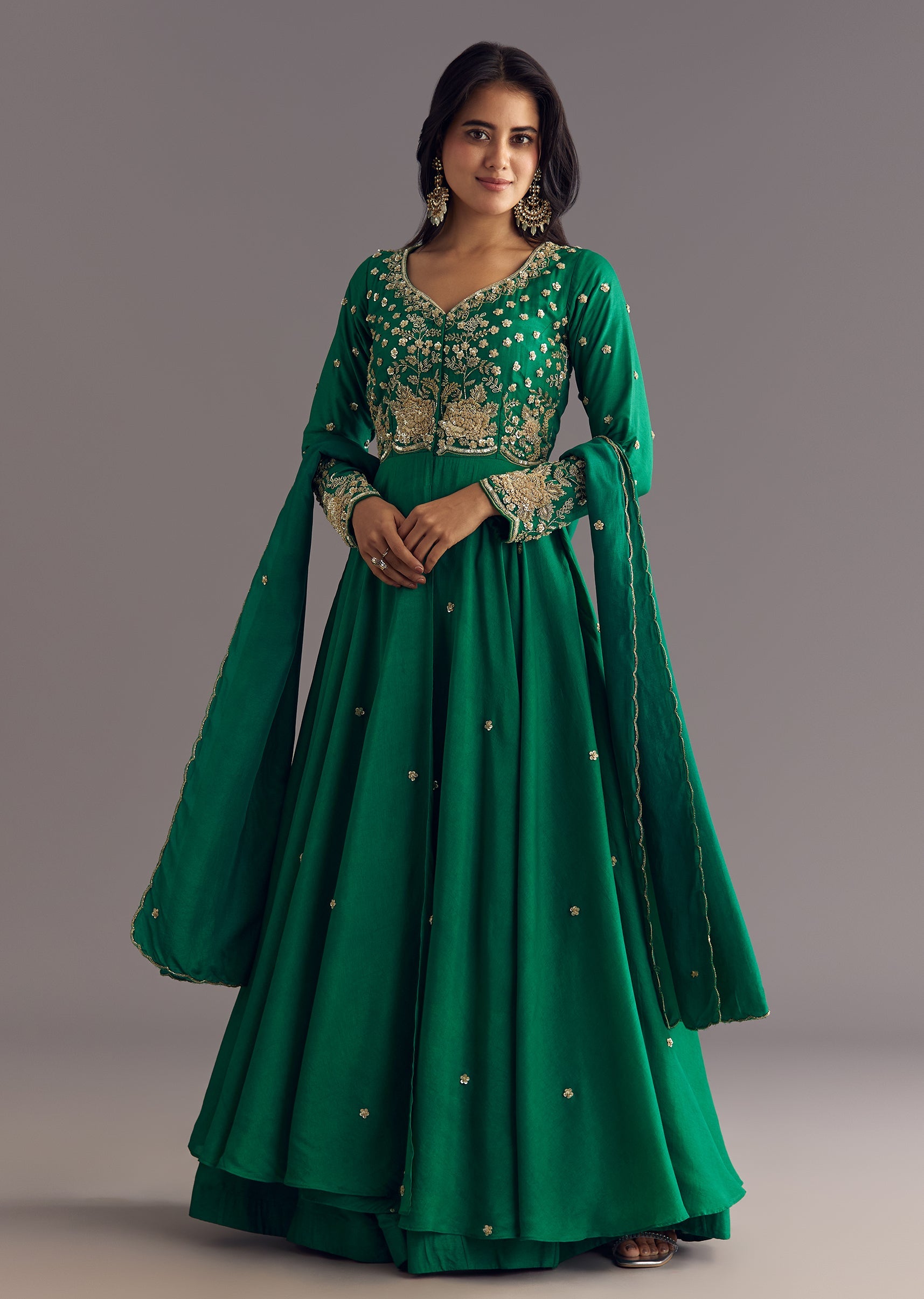 A lush green Russian silk kurta with front slit featuring sequins, cut dana and beads embroidery perfect for festive or mehndi occasions. Standard length for Skirt is 42" Awarded as... More Product Details