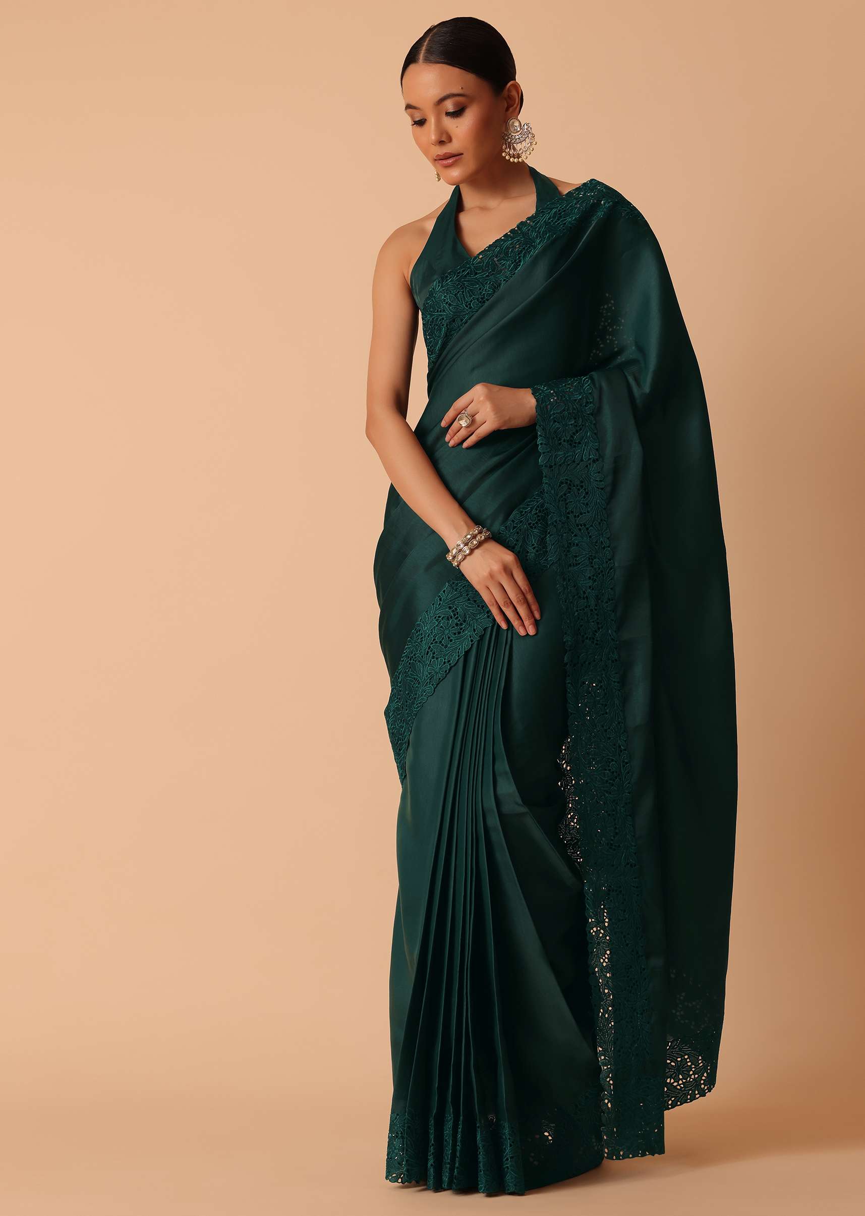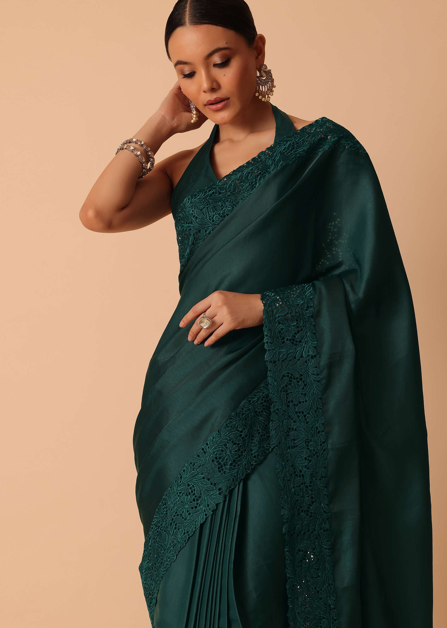 Emerald danglers and a stack of diamond studded bangles will add an opulent touch.