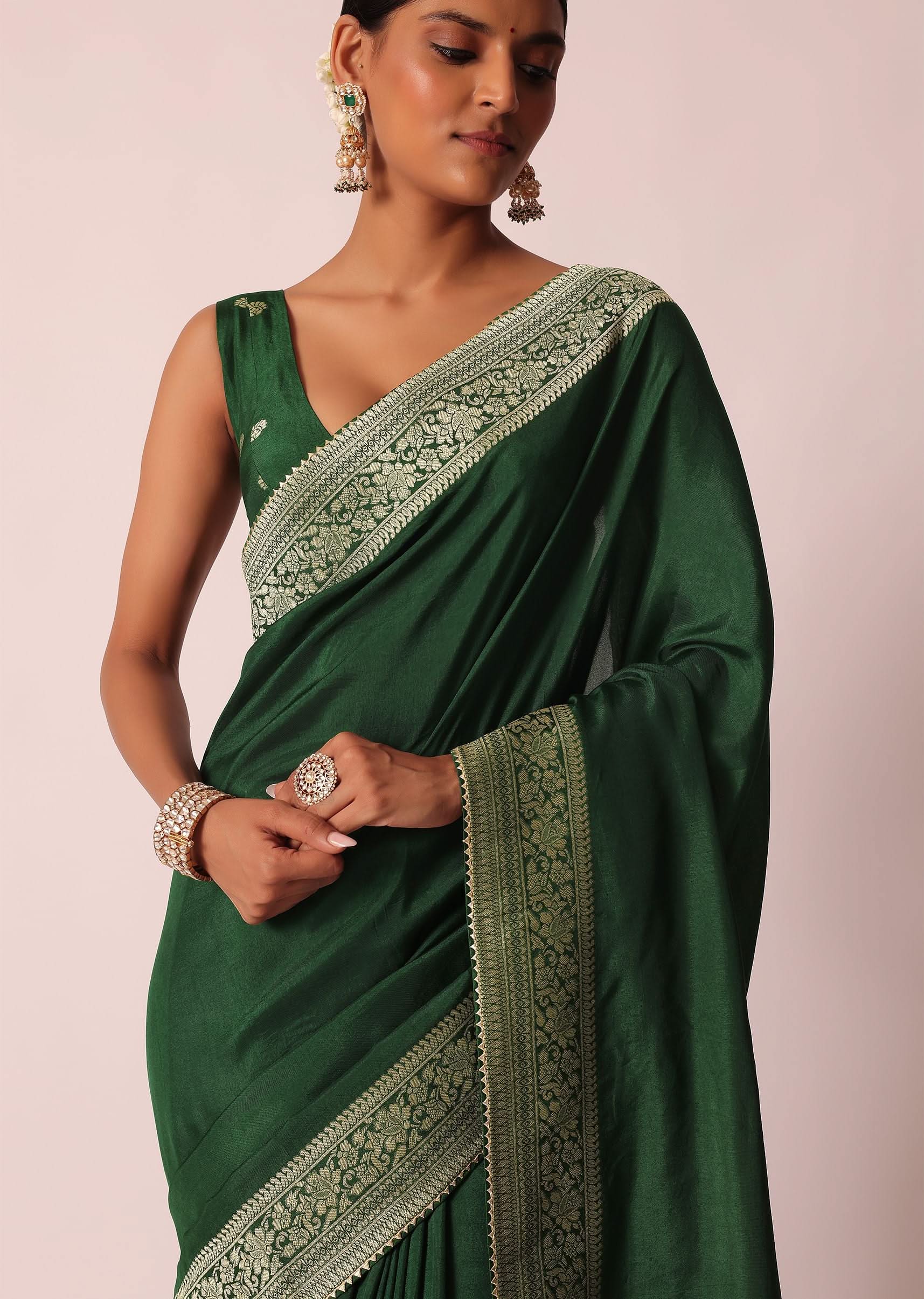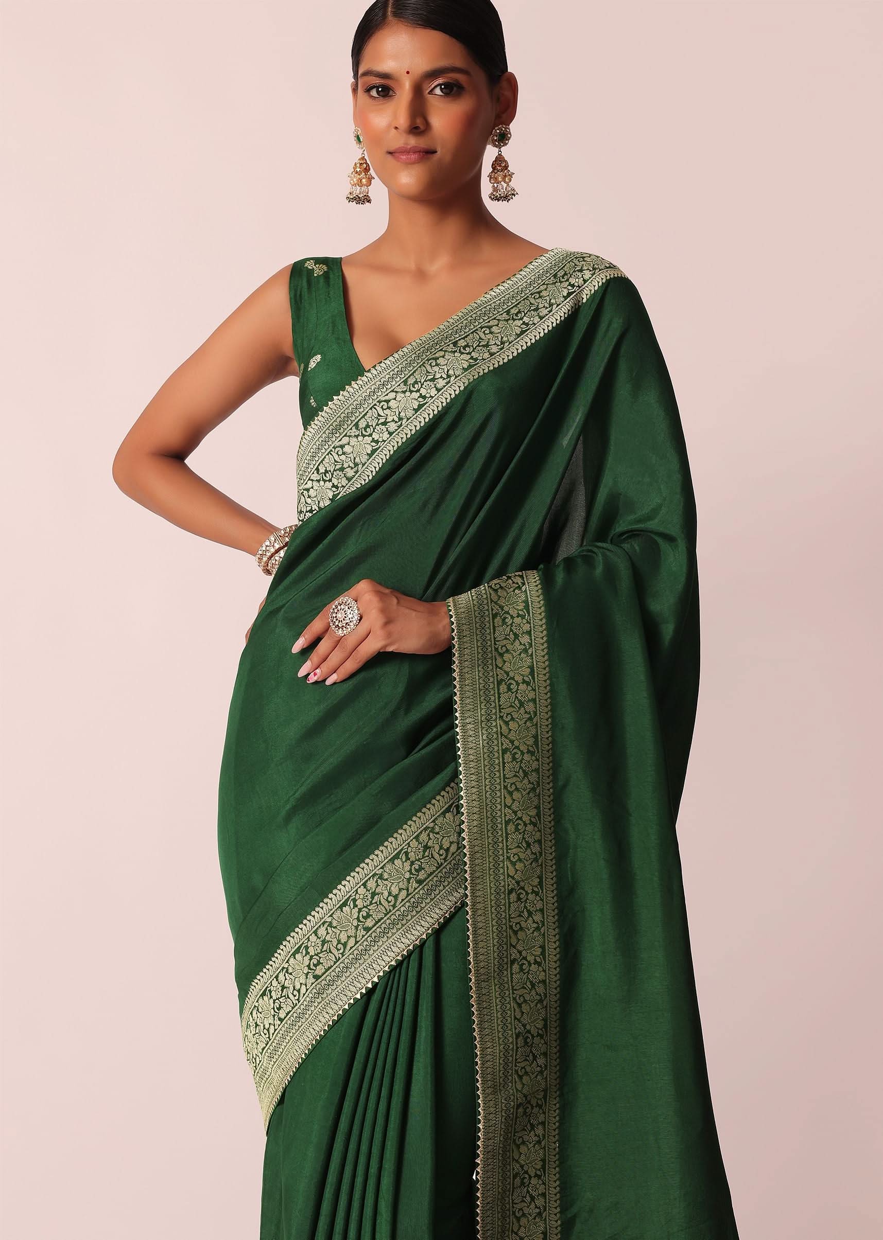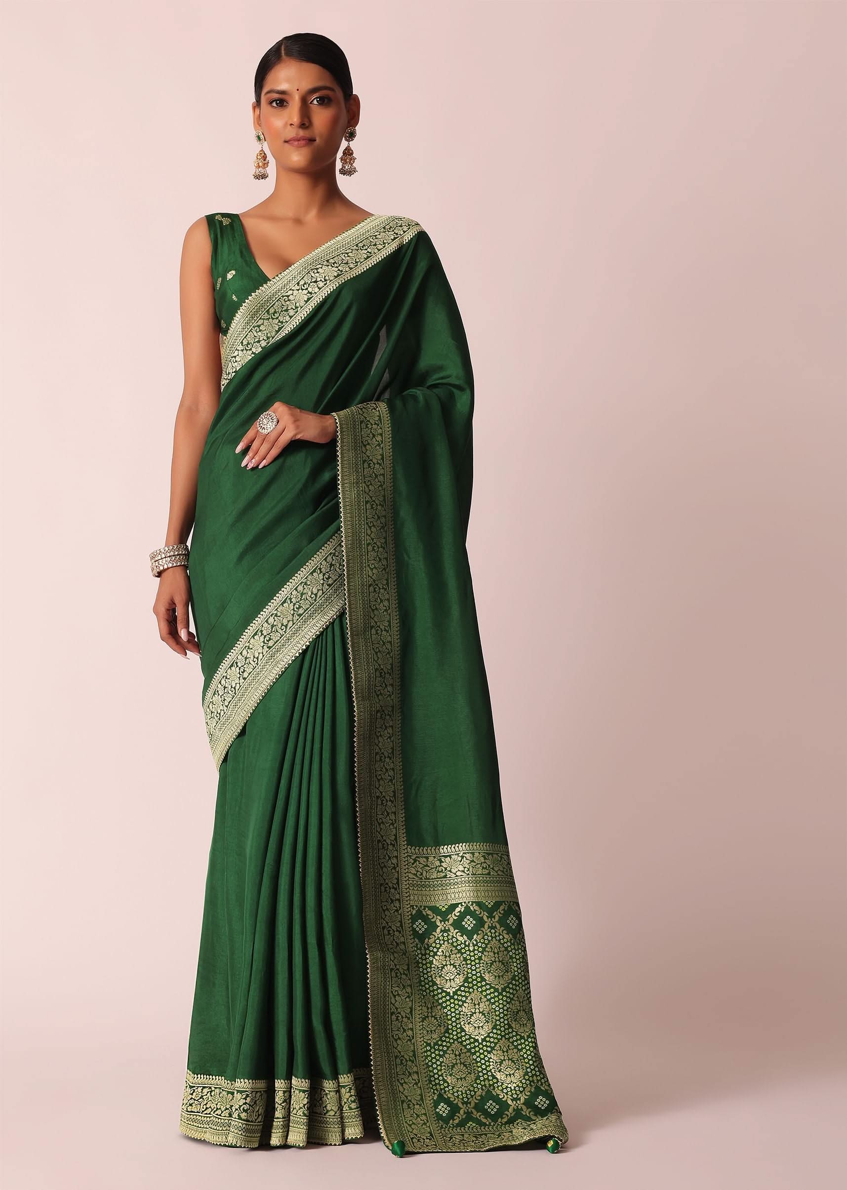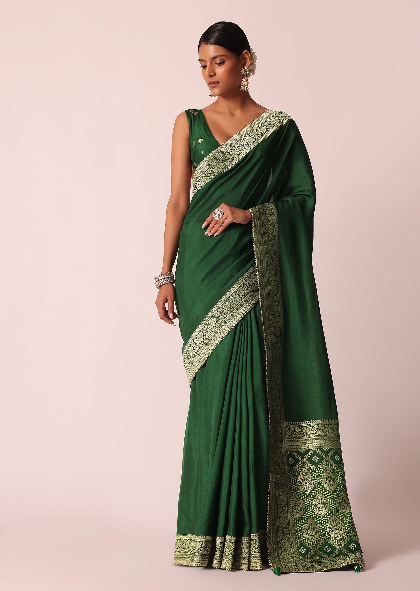 Green Saree In Silk With Woven Bandhani Detail And Unstitched Blouse Piece