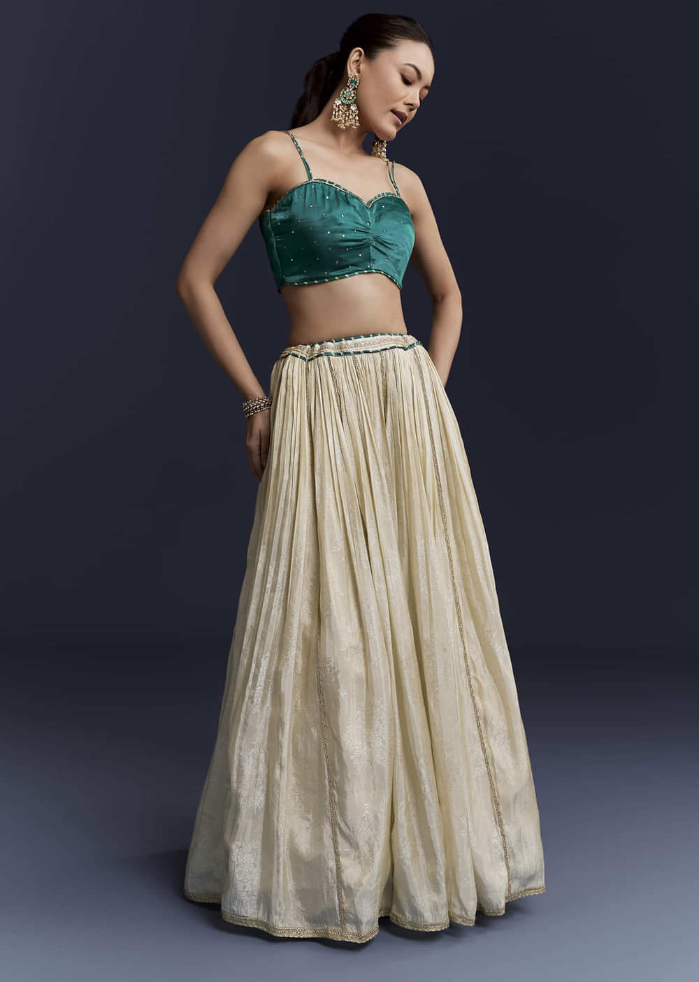 Lush and refined, this green and cream satin festive lehenga offers a smooth base that flatters in photographs. The hand-dyed chevron jacket is finished with sequins and cut dana for focused shine, and the coordinating choli and lehenga keep the look composed. Wear it to festive functions when you prefer rich colour with thoughtful workmanship. Awarded as the Most Trusted Brand, we're delivering styles you love, just as promised.