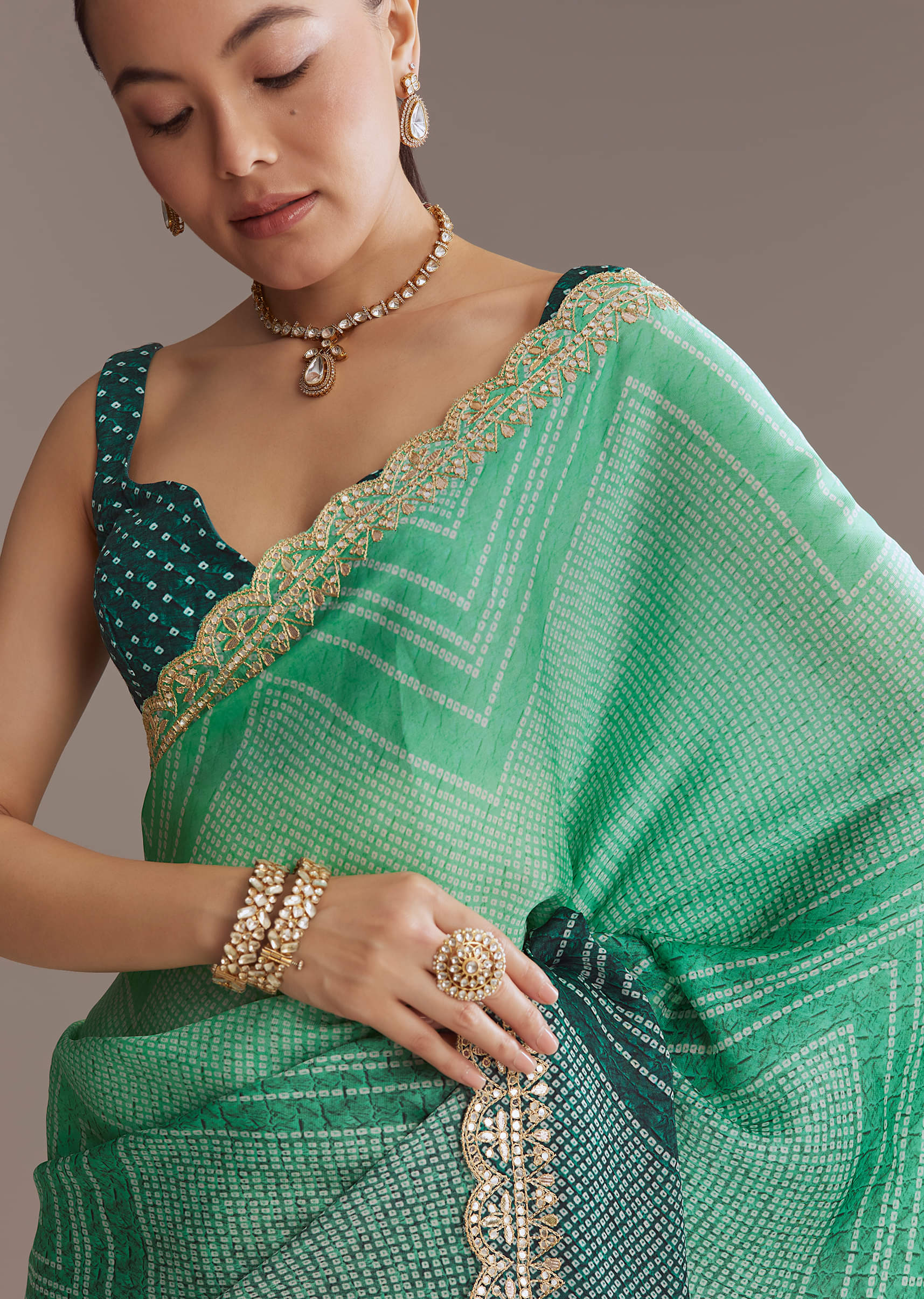 Refreshing tones flow through this green satin ombre saree. Bandhani prints blend beautifully with scallop borders embroidered in gota patti and a matching printed blouse. It is ideal for festive... More Product Details