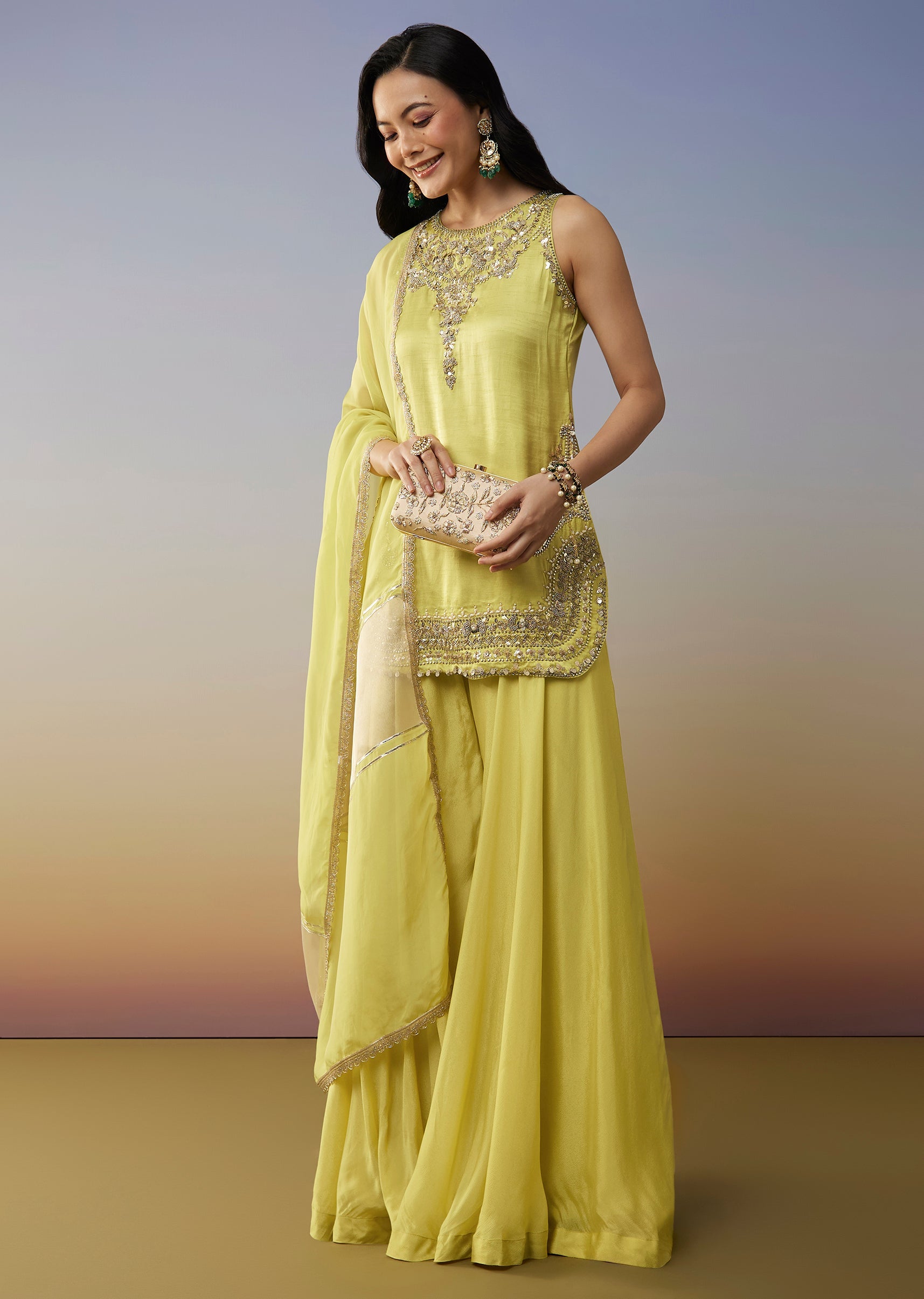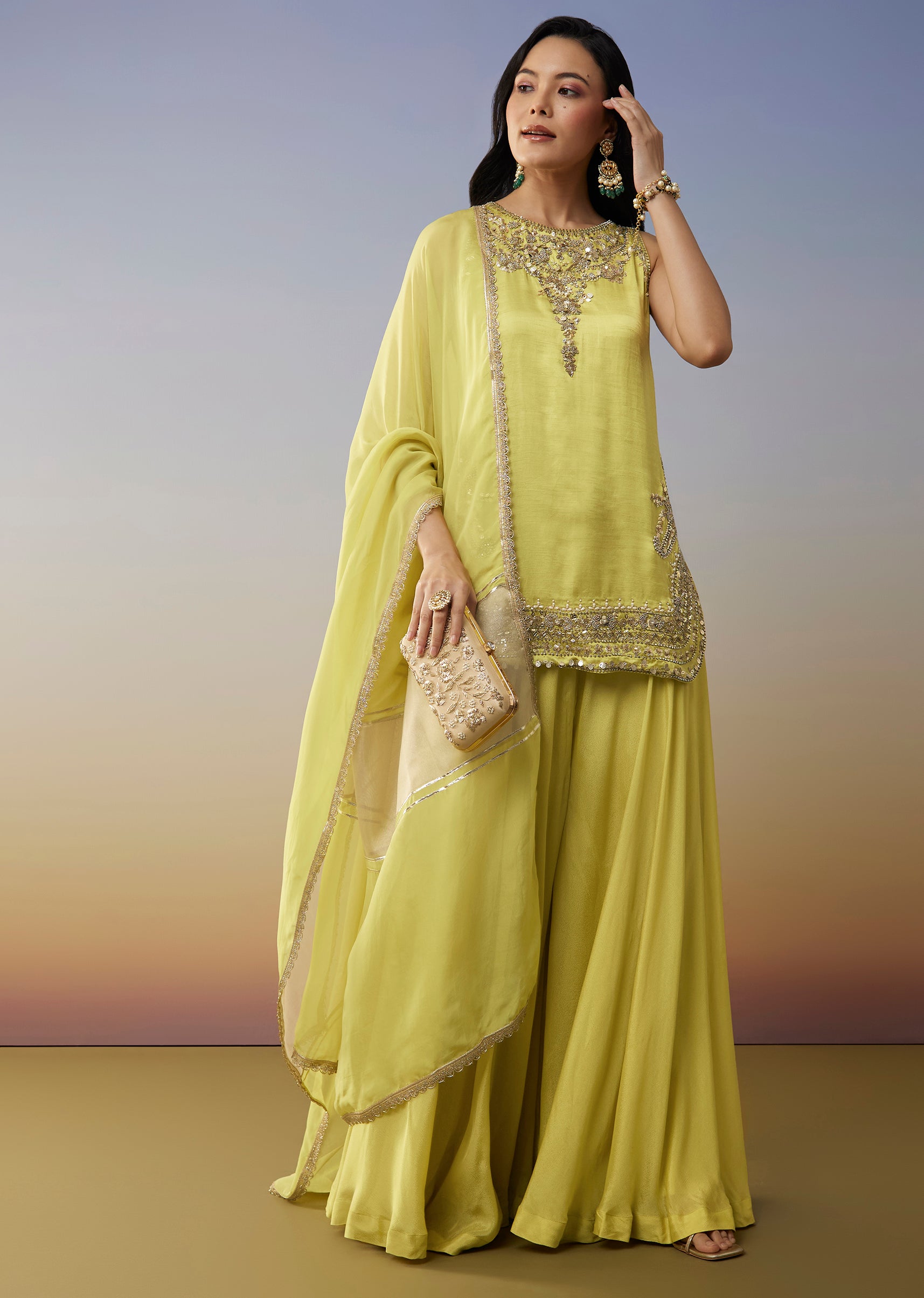 This green palazzo suit brings a refreshing color pop to engagement haldi and mehendi celebrations perfect for bridesmaids or wedding guests. Crafted in a satin primary fabric with a chinnon... More Product Details