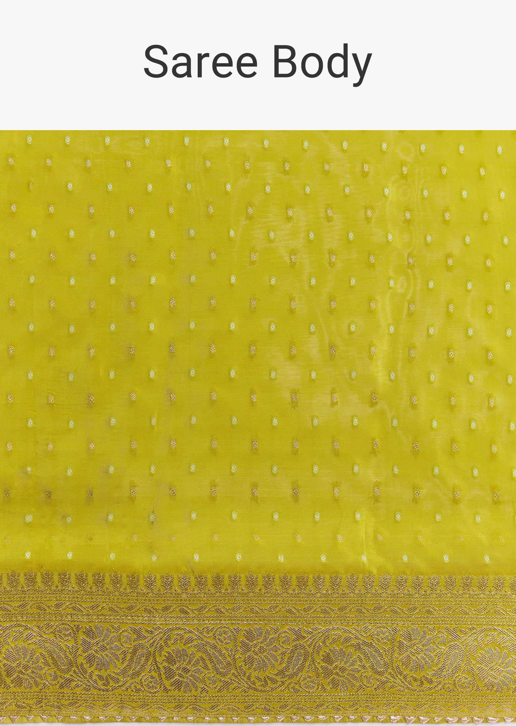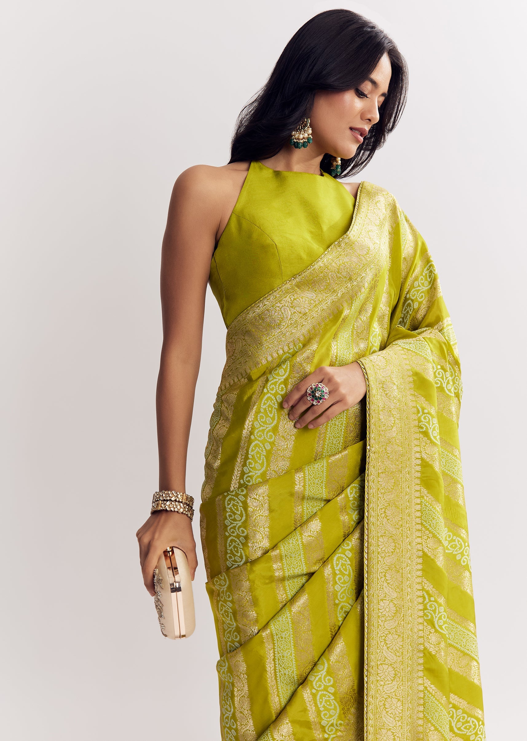 Unwind into luxury with this green satin saree intricately woven with zari vine designs—an evergreen pick for grand occasions. Awarded as the Most Trusted Brand, we're delivering styles you love, just as promised.